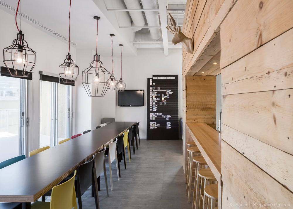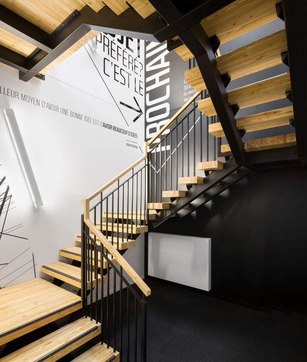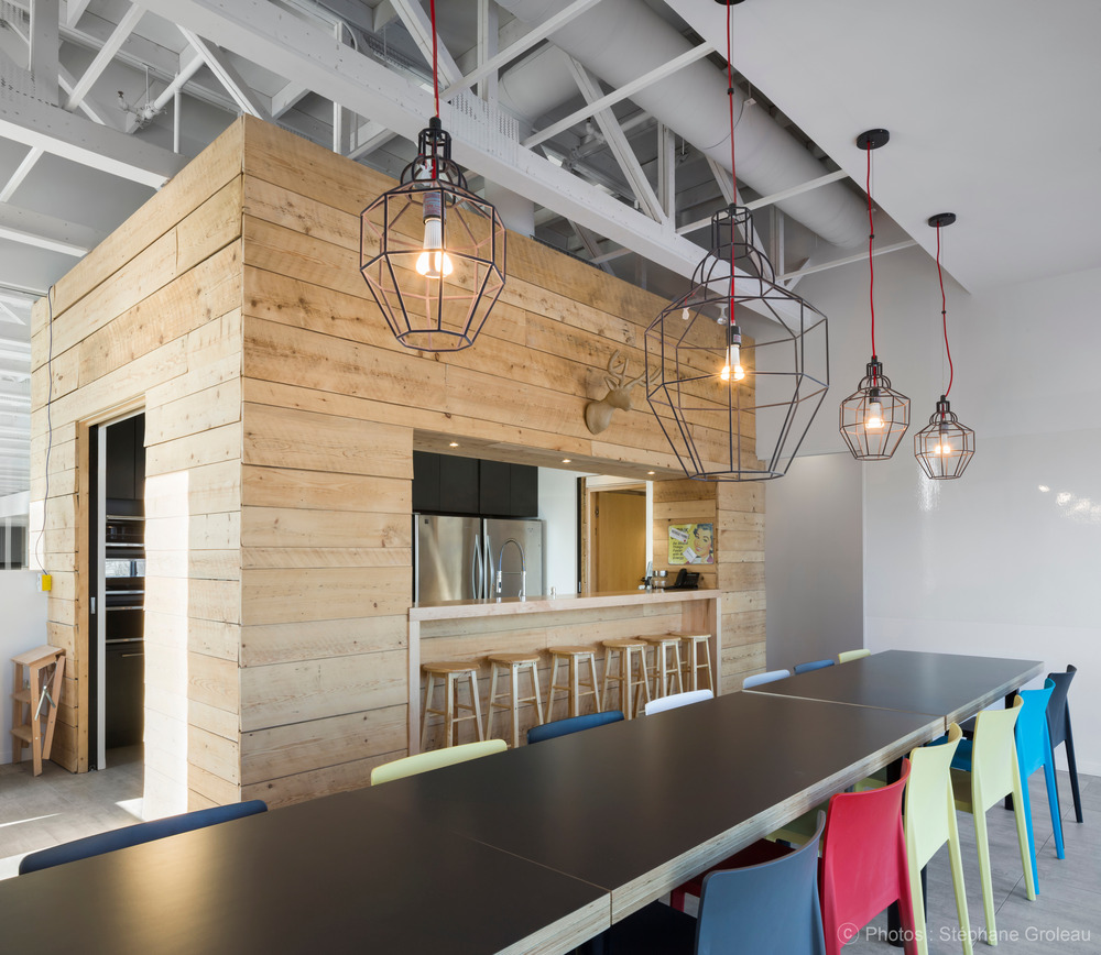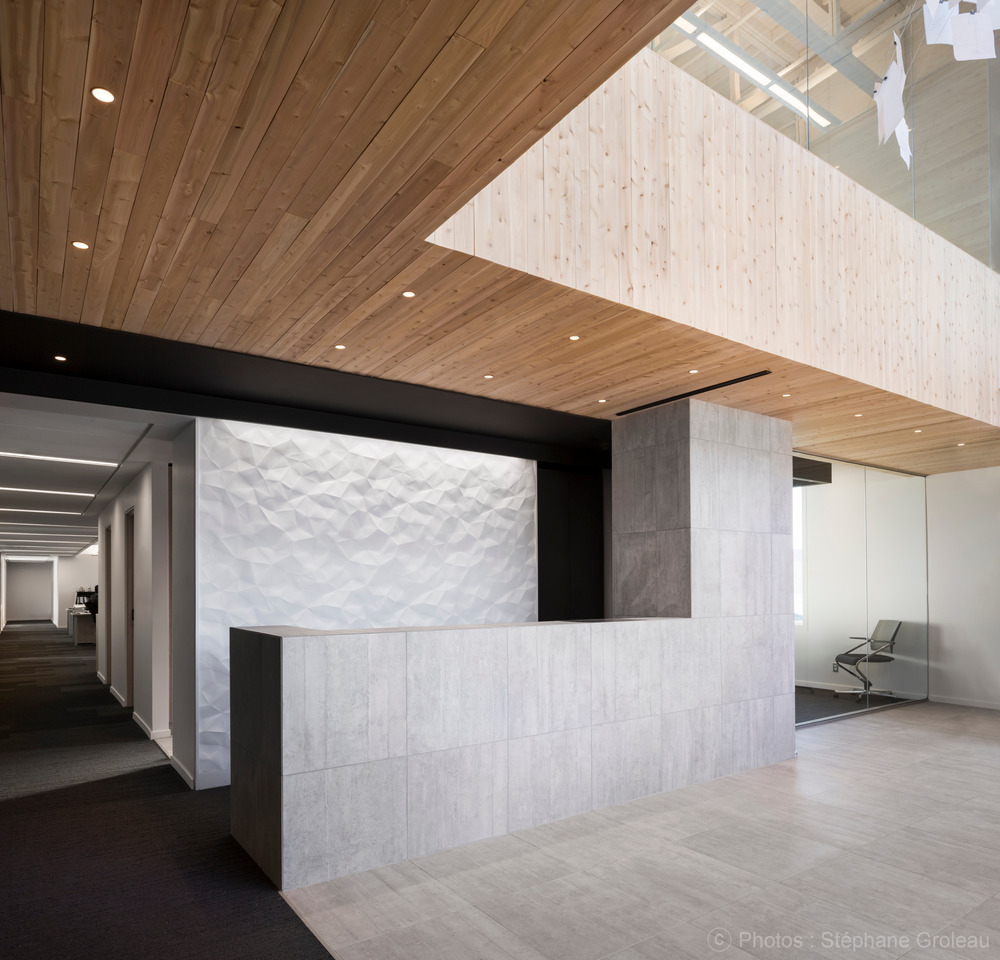The building’s location has its benefits for users. The dense sector is located on the outskirts of the downtown core, near a busy highway, with public transportation and a variety of services. Two parking lots are reserved for carpoolers and a charging station for electric cars is at the disposal of employees. The south facing terrace serves as a much appreciated rest area with landscaping featuring maintenance free and eatable plantings. Most of the plants are hardy and eatable, such as raspberry, lilies and serviceberry, don’t require irrigation and enable occupants as well as clients to use the outdoor areas of their environment. The building offers a stimulating work environment. Natural lighting and outdoor views are elements that are particularly appreciated. Most areas have natural lighting due to abundant windows on the four sides of the building, situated to optimize the different lighting opportunities during the day. Five light wells add midday lighting that is both appealing and varied depending on the time of day. LED fixtures, equipped with light detectors in the two large work areas, complete the indoor lighting needs,. Key objectives, in keeping with the premises of comfort and simplicity, were to provide fresh air and to control the immediate environment. A series of windows vents are strategically positioned around the building envelope. In addition, the mechanical systems are designed to efficiently cool and heat the different zones of the building at the same time.