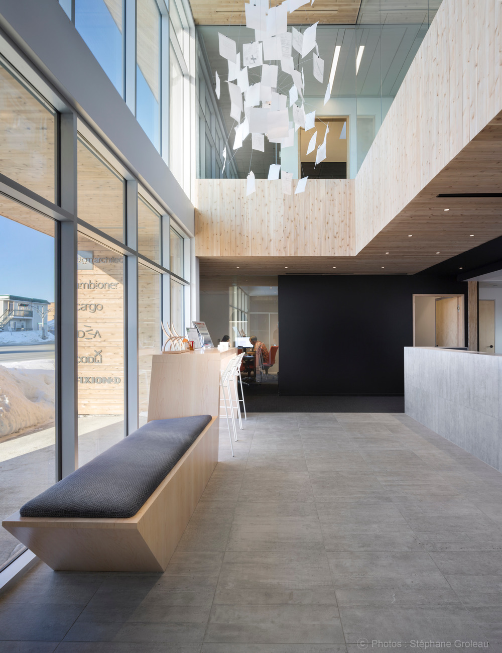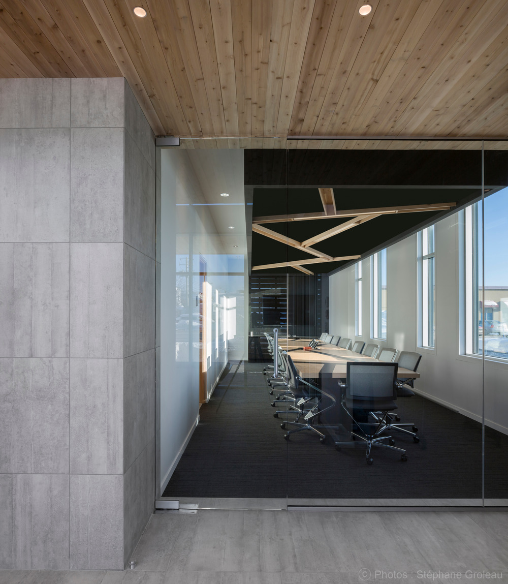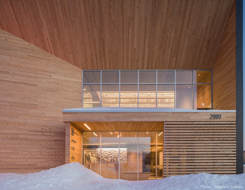 STGM’s new head office is located in the Beauport borough of Quebec City, adjacent to the Estimauville eco-neighbourhood. It is a 1,000 square metre two-storied structure that puts the focus on eco-friendly, architectural innovation. The building succeeds in offering an exceptional level of comfort to its occupants through the mindful integration of a longitudinal form, orientation to the sun, light wood structure, meticulously selected materials and efficient systems, while producing a low ecological footprint. High performance concrete siding combined with Eastern Cedar creates an impression that is both simple and dynamic, with attention given to the relationship between solids and voids that lend the building an air of elegance that belies both time and fashion. From the first sketches, the designers sought to attain a high level of sustainability – a principle already at the heart of the firm’s priorities, using creativity to implement the strategies necessary to reach LEED-NC Platinum level. With this objective in mind, comfort, simplicity and coherence were selected as founding principles.