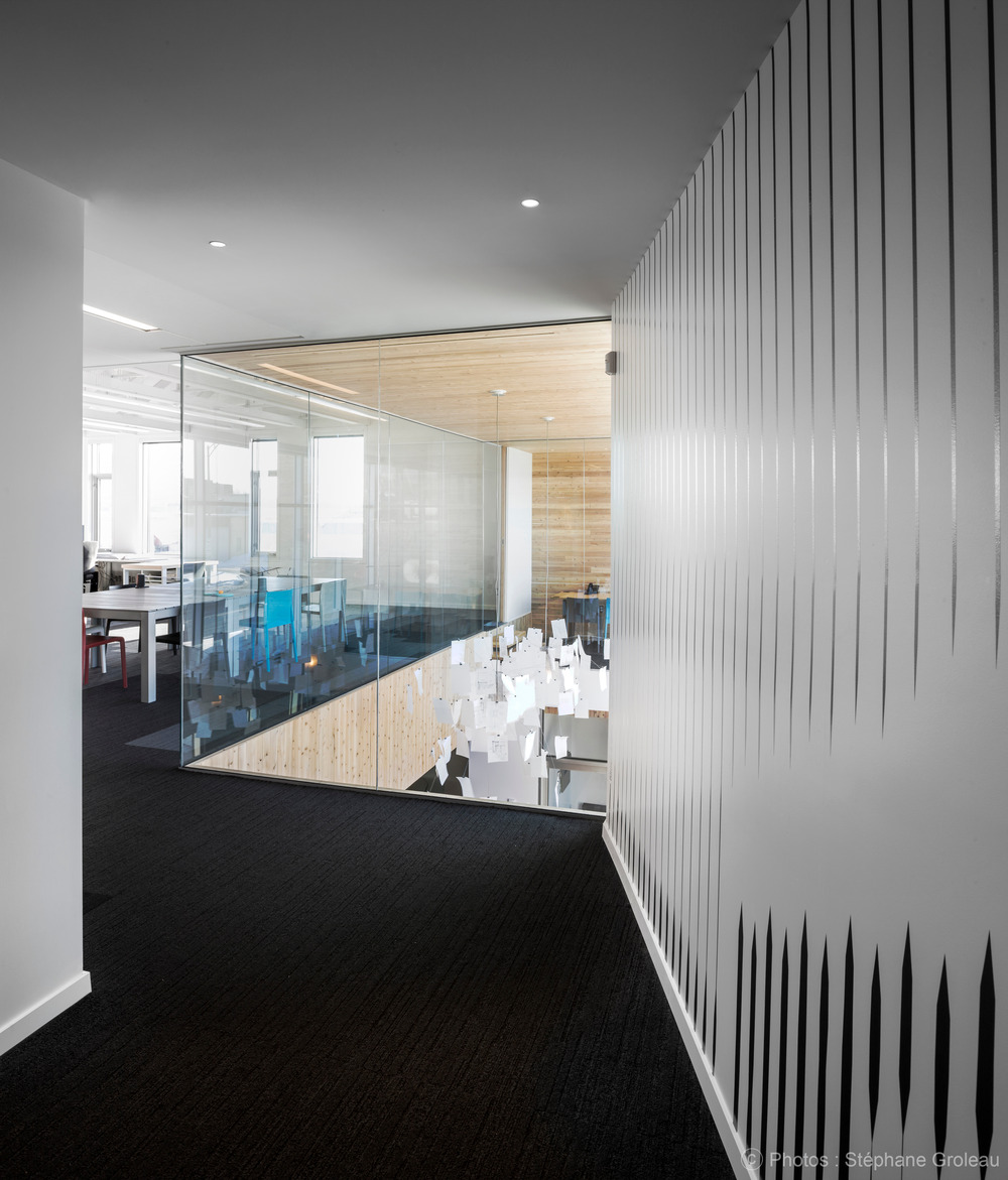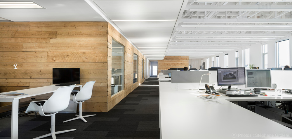 An ambitious reduction in energy consumption of over 60% compared with the reference building was sought through an innovative aerothermal design and recuperation of the building’s internal heat to curb demand on the distribution networks. A solar wall was also erected on the south-west façade of the building to preheat fresh air. Several control strategies also mitigated at-source needs by adapting lighting, heating and cooling use to actual occupation and needs. The project designers also focused on the use and management of materials and resources. Tthe building’s ecological signature, for example, is apparent indoors with the use of wood salvaged from old houses in the area. Furniture from the company’s old offices was salvaged and integrated into the new project, without volatile organic compounds (VOCs) and regional provenance (local sourcing) were prioritized throughout the process.