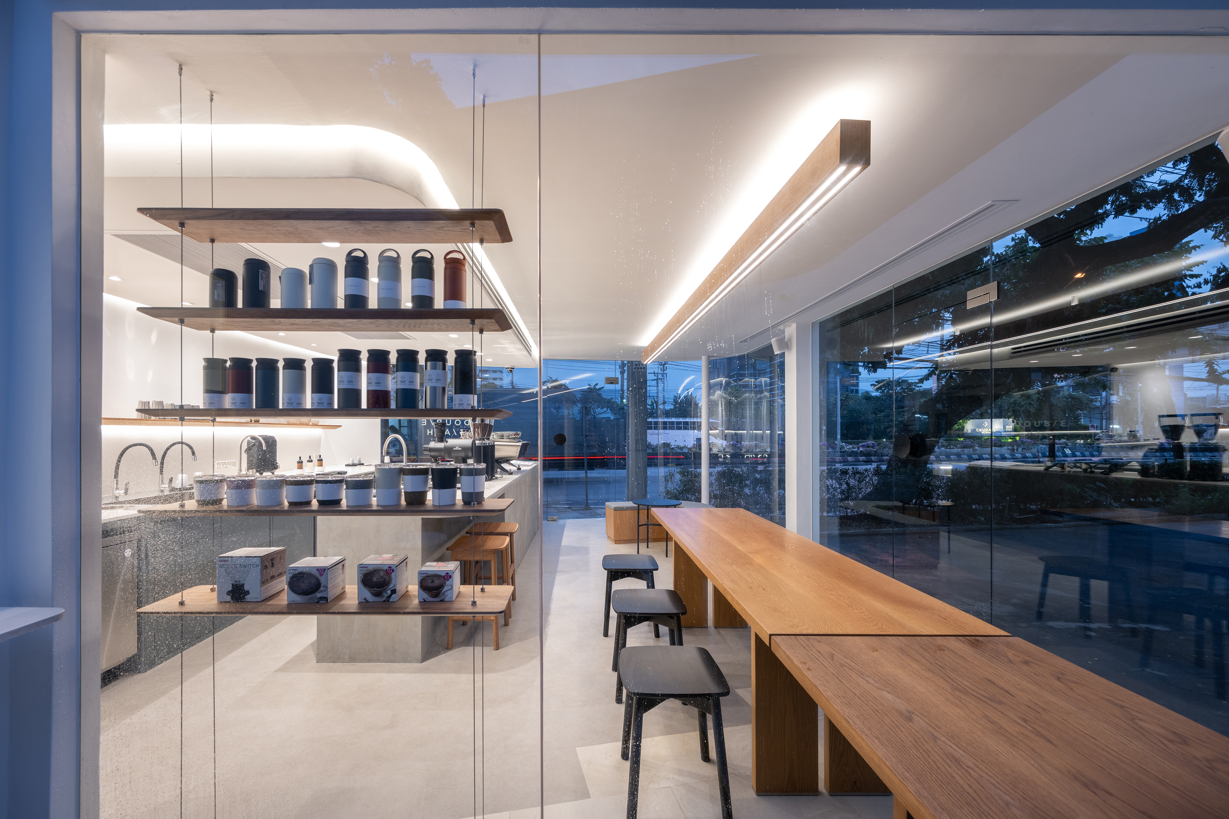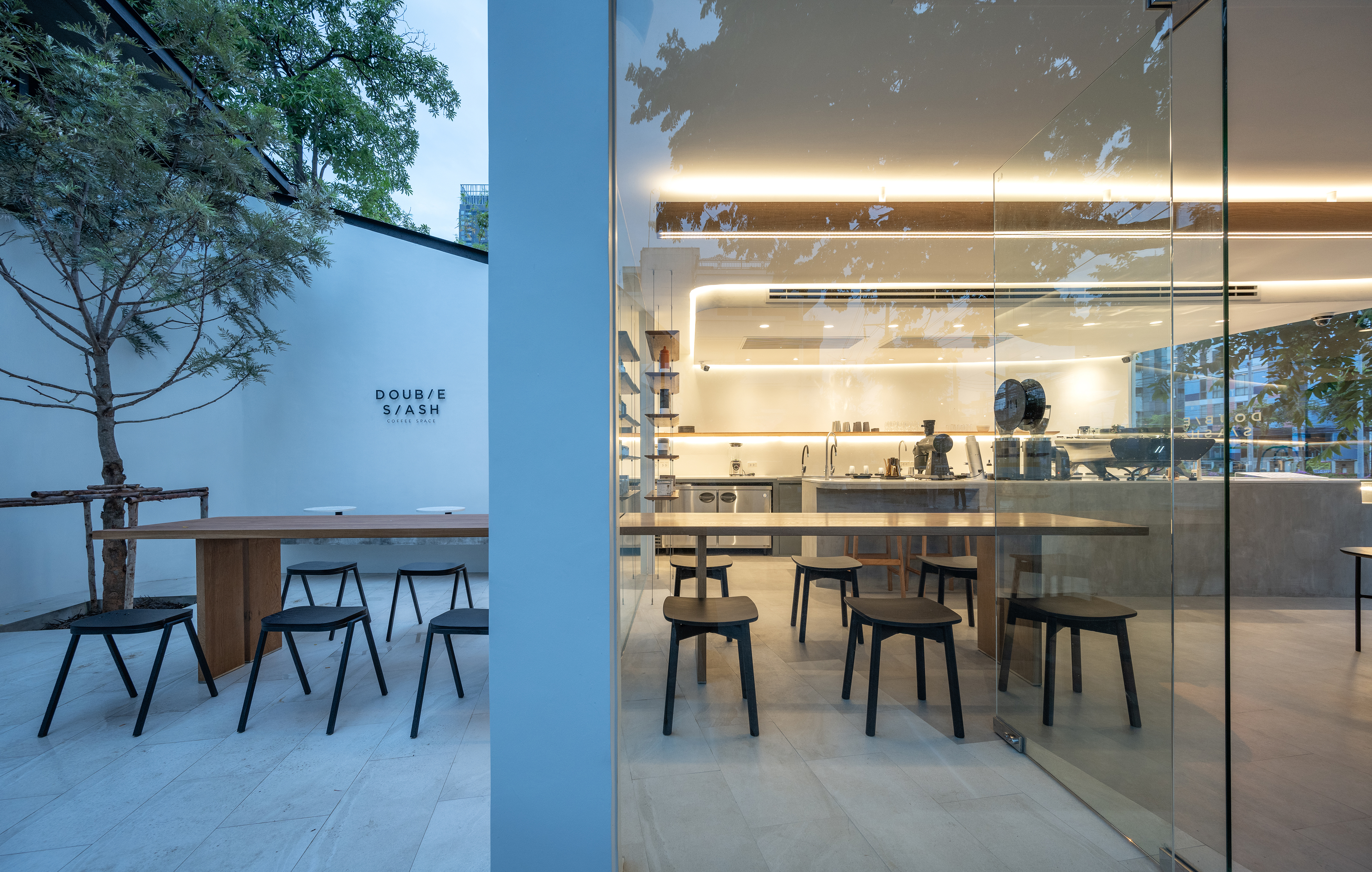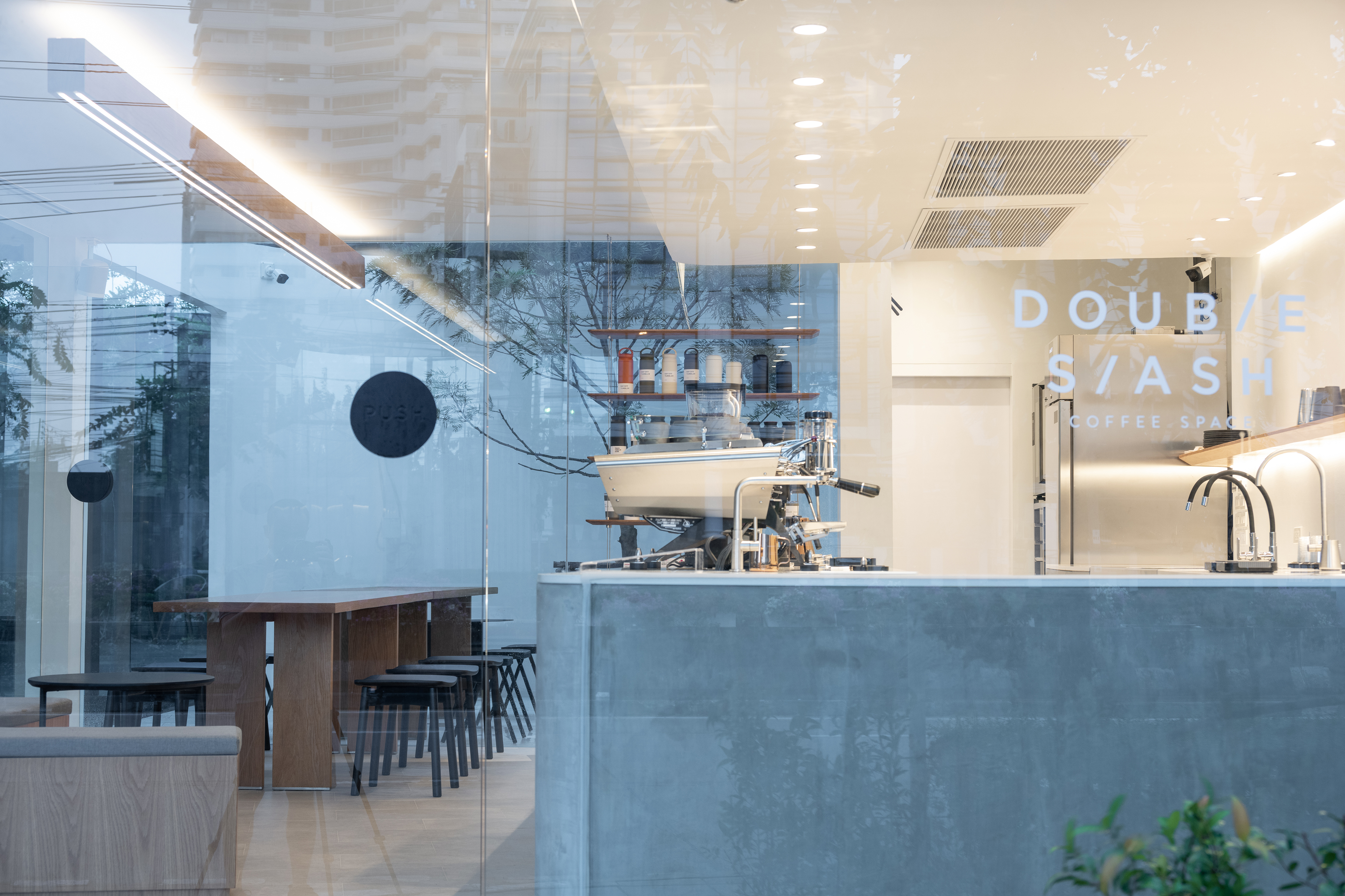 Double Slash's architectural identity was influenced by an international style during Art Deco period, when aerodynamic design was basically applied to household products and architectures. Without excess ornamentation, both curving form and angled planning orientation build flow and visual movement to the building. Under flat roof structure, the long horizontal framework with minimal distraction humbly accommodates plain space that enhances the essence of stillness and elevates artisan coffee experience within.