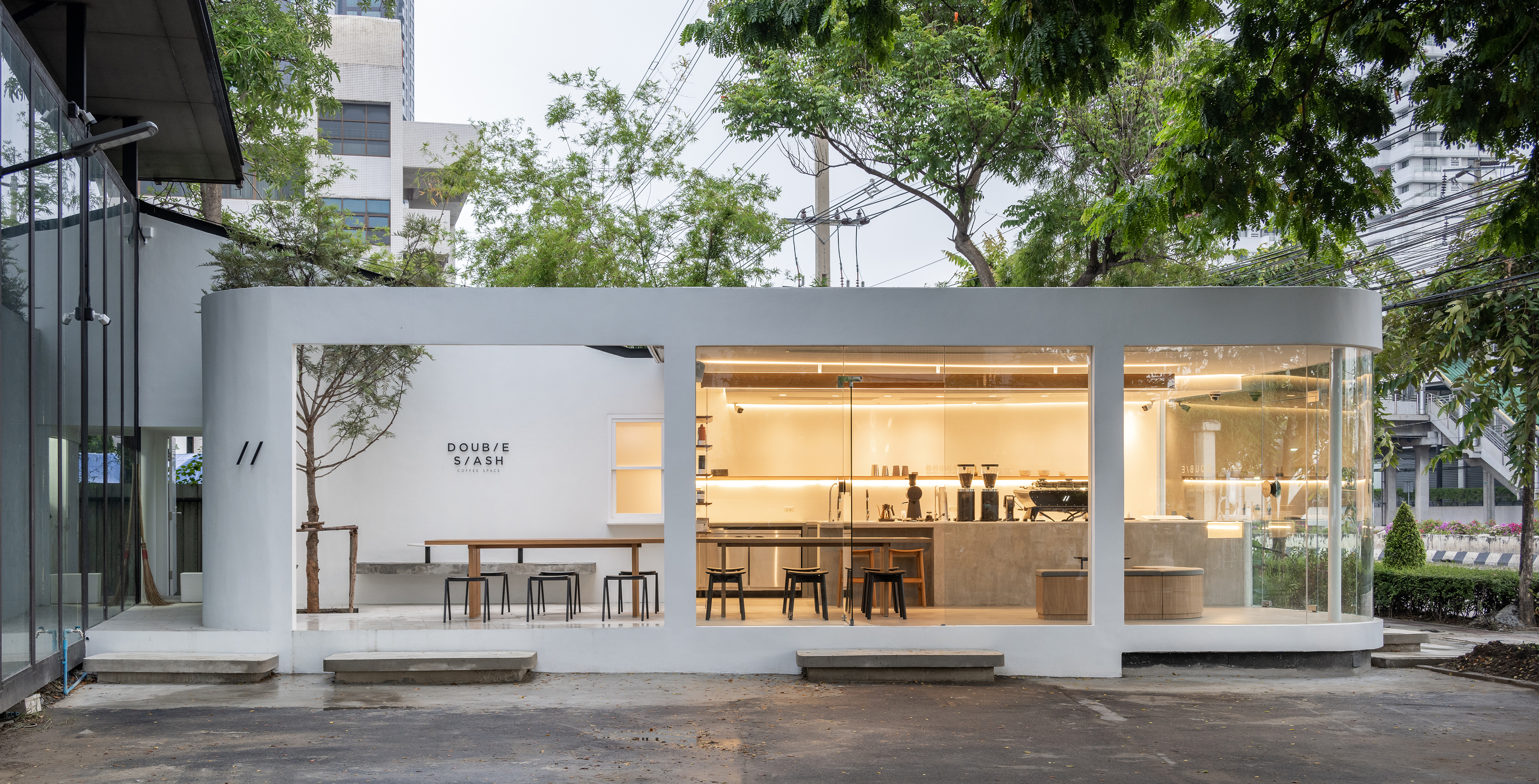 1930년대의 세련된 모던 스타일에서 영감을 받은 태국 방콕의 Rama3에 위치한 Double Slash // Coffee Space는 역동적이면서도 단순한 건축적 측면에 대한 정체적을 드러낸다. 초기 공간은 원래 태국 북동부 이산지역에서 수년간 숲의 전통을 지켜온 산업 디자이너에 의해 Rama8에 세워졌다. 이후에 장인 정신을 자신의 개인적 자질, 마음 챙김, 건전함을 개발하는 장치로 간주했다. 'Double Slash'는 평소 글을 쓰면서 생각 사이에 공간을 만들기 위해 쓰는 문장 부호에서 따왔다. 빗금은 그 사이에 공간을 설정하는 친숙한 문장 부호 일뿐만 아니라 흐름, 움직임 및 연속성을 한 번에 식별하는 기호이기도 하다.