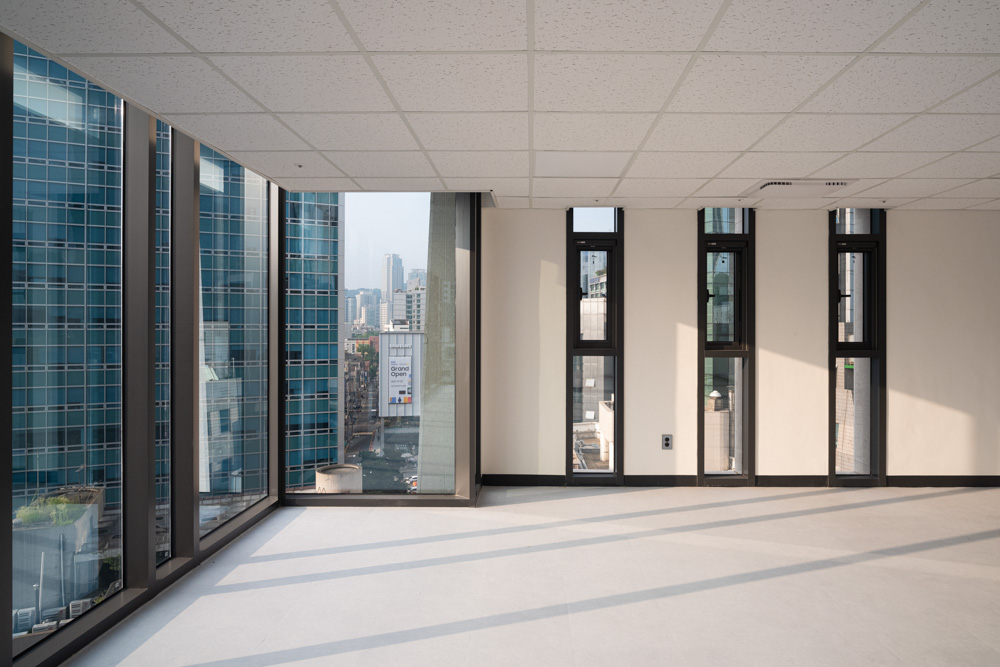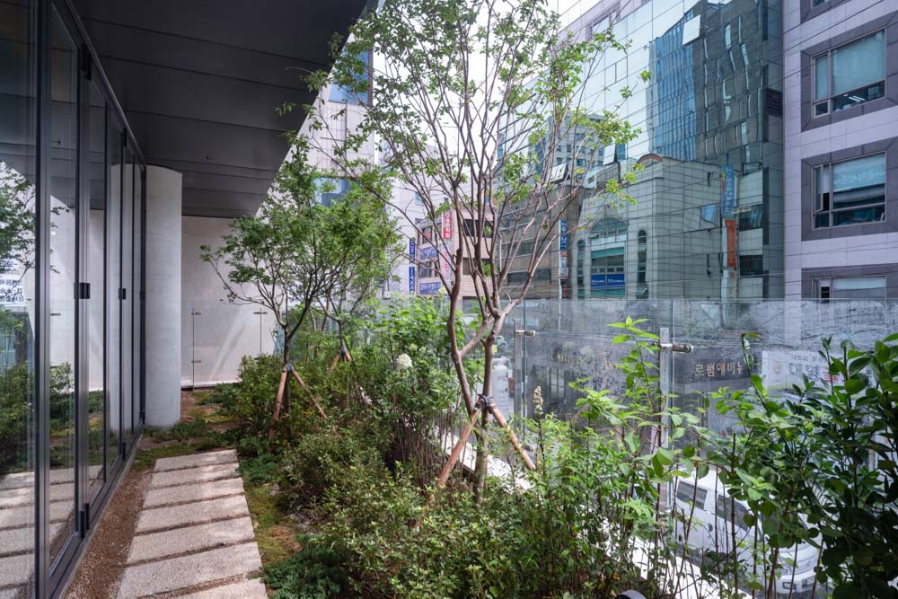 The green space on the second floor continues to the roof. Since this space, built on the top floor, was planned to be used as the client’s personal work space, it was made to seem like an independent building built on a separate site as much as possible. When leaving the elevator on the 11th floor, the outside scenery can be seen through a vertically long window at the left end of the staircase. The door that is encountered when turning to the right leads to a small exterior space facing the outside air. It was made to feel like entering a separate space. When opening another door, the main space is accessed through the corridor. A folding door was installed in the corridor so that it could be connected to the exterior garden, and a wooden porch was placed to allow one to sit and admire the small garden. After passing through the corridor and entering the main space, the entire city landscape can be seen through the open window wall. In front of it is a small garden that also serves as a balcony. The U-shaped garden surrounds the top floor with the intention of reviving the external space that was lost as the building filled the land.