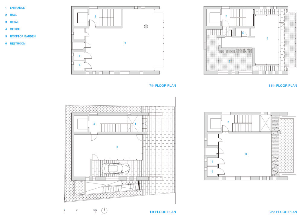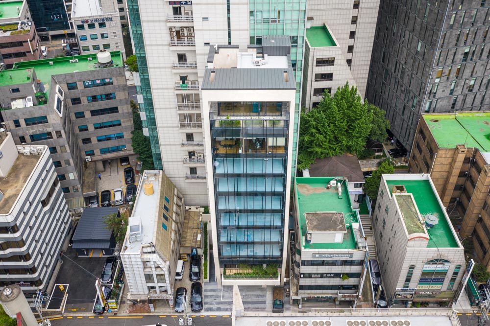 이 녹색공간은 옥상으로도 이어진다. 최상층에 만들어진 녹색공간은 건축주의 개인 업무공간으로 사용될 예정인데, 가능한 별도의 대지에 세워진 독립된 건물처럼 보인다. 11층 엘리베이터에서 내리면 계단실 왼쪽 끝의 세로로 긴 창을 통해 바깥 풍경이 힐끗 보인다. 오른쪽으로 돌아 문을 열면 외부의 작은 바깥 공간으로 이어진다. 분리된 별도의 공간으로 들어가는 느낌을 받을 수 있다. 다시 앞의 현관문을 열면 복도를 통해 주 공간으로 진입할 수 있는데 복도는 외부 정원과 연결되어 폴딩도어와 툇마루가 작은 정원의 분위기를 조성한다. 복도를 지나 주 공간으로 들어서면 전면이 개방된 창호를 통해 도시의 풍경이 한눈에 들어온다. 그 앞에는 발코니를 겸하는 작은 정원이 만들어져 있다. 건물이 땅을 차지해 사라진 자연공간을 옥상의 정원으로 되살리자는 의도로 최상층은 ‘ㄷ’자 형태로 정원이 둘러싸고 있다.
