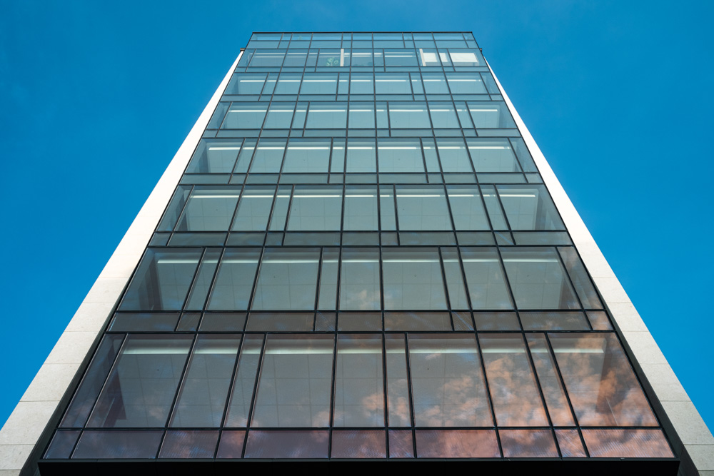 Most of the base floors are to be used as offices. We wanted to make a column-free structure to prevent the use of the space obstructed by the columns. The exterior wall itself was built into a structural wall, and no columns were made except for one cylindrical column in the front. Most of the building is supported by the core and the outer wall. The thick outer wall embraces the lightly floating glass mass and holds it, allowing it to settle on the land stably. To avoid the wall appearing too heavy, a diagonal gap was left and vertically long windows were irregularly arranged on the central area of the southern side, allowing it to have a different appearance when approached from the alley. On the south side of the first floor, an exterior staircase leads to the small sunken yard on the basement floor, allowing light and air to pass through the commercial space to be built in the basement. We hope that this new building can revitalize the alley and become the starting point of a small change.