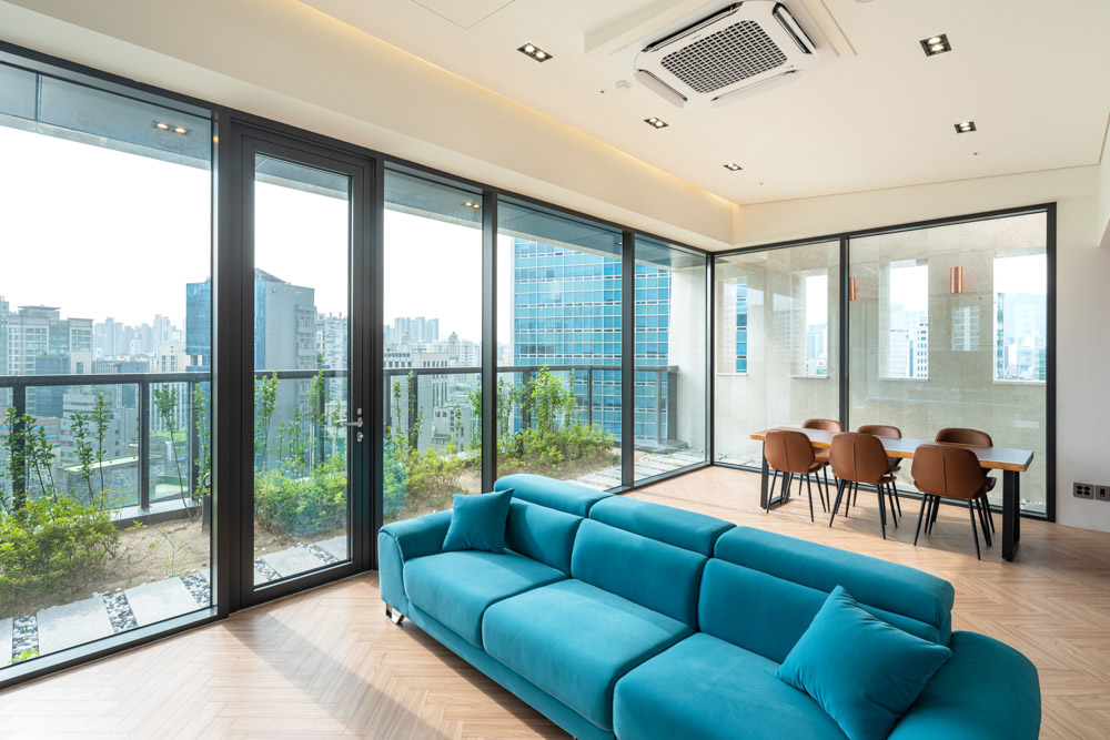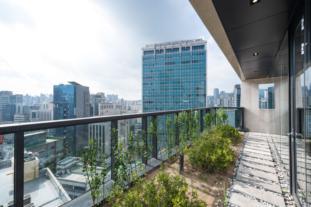 The green space on the second floor continues to the roof. Since this space, built on the top floor, was planned to be used as the client’s personal work space, it was made to seem like an independent building built on a separate site as much as possible. When leaving the elevator on the 11th floor, the outside scenery can be seen through a vertically long window at the left end of the staircase. The door that is encountered when turning to the right leads to a small exterior space facing the outside air. It was made to feel like entering a separate space. When opening another door, the main space is accessed through the corridor. A folding door was installed in the corridor so that it could be connected to the exterior garden, and a wooden porch was placed to allow one to sit and admire the small garden. After passing through the corridor and entering the main space, the entire city landscape can be seen through the open window wall. In front of it is a small garden that also serves as a balcony. The U-shaped garden surrounds the top floor with the intention of reviving the external space that was lost as the building filled the land.