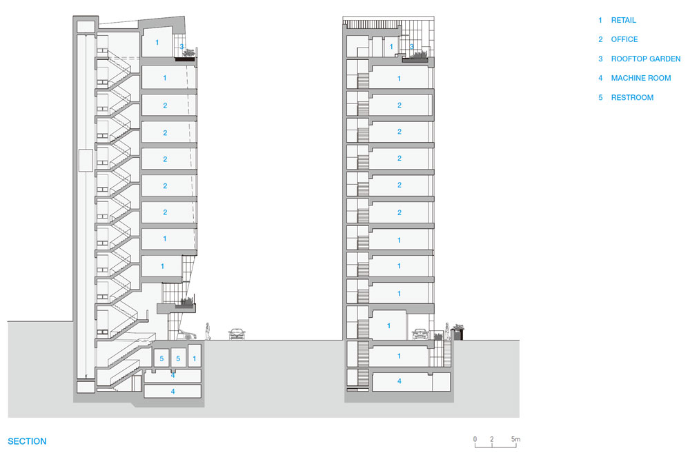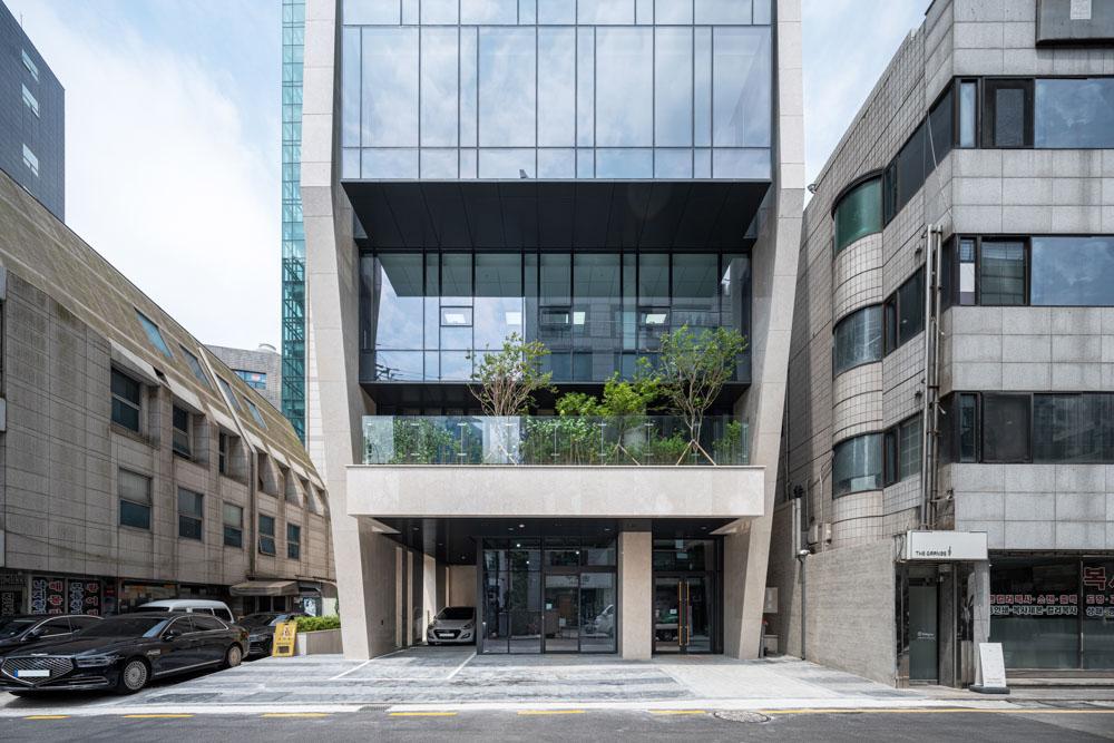 Most of the base floors are to be used as offices. We wanted to make a column-free structure to prevent the use of the space obstructed by the columns. The exterior wall itself was built into a structural wall, and no columns were made except for one cylindrical column in the front. Most of the building is supported by the core and the outer wall. The thick outer wall embraces the lightly floating glass mass and holds it, allowing it to settle on the land stably. To avoid the wall appearing too heavy, a diagonal gap was left and vertically long windows were irregularly arranged on the central area of the southern side, allowing it to have a different appearance when approached from the alley. On the south side of the first floor, an exterior staircase leads to the small sunken yard on the basement floor, allowing light and air to pass through the commercial space to be built in the basement. We hope that this new building can revitalize the alley and become the starting point of a small change.