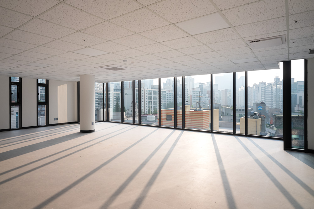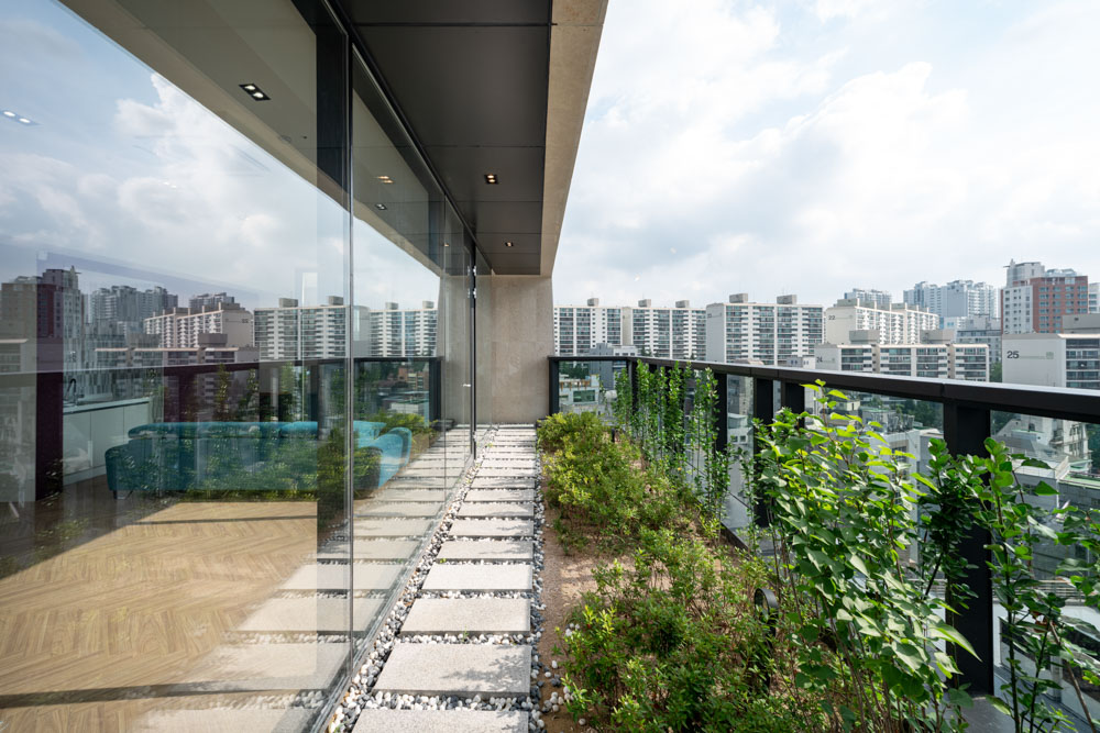 이 녹색공간은 옥상으로도 이어진다. 최상층에 만들어진 녹색공간은 건축주의 개인 업무공간으로 사용될 예정인데, 가능한 별도의 대지에 세워진 독립된 건물처럼 보인다. 11층 엘리베이터에서 내리면 계단실 왼쪽 끝의 세로로 긴 창을 통해 바깥 풍경이 힐끗 보인다. 오른쪽으로 돌아 문을 열면 외부의 작은 바깥 공간으로 이어진다. 분리된 별도의 공간으로 들어가는 느낌을 받을 수 있다. 다시 앞의 현관문을 열면 복도를 통해 주 공간으로 진입할 수 있는데 복도는 외부 정원과 연결되어 폴딩도어와 툇마루가 작은 정원의 분위기를 조성한다. 복도를 지나 주 공간으로 들어서면 전면이 개방된 창호를 통해 도시의 풍경이 한눈에 들어온다. 그 앞에는 발코니를 겸하는 작은 정원이 만들어져 있다. 건물이 땅을 차지해 사라진 자연공간을 옥상의 정원으로 되살리자는 의도로 최상층은 ‘ㄷ’자 형태로 정원이 둘러싸고 있다.