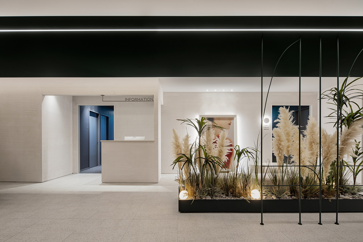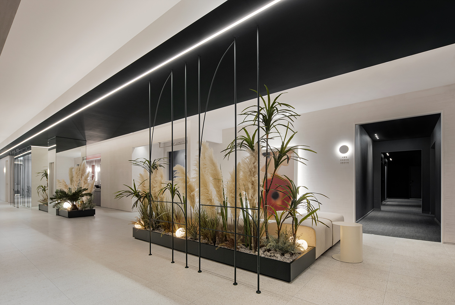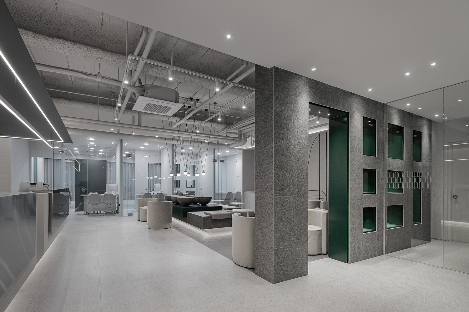 피부과로써 단층 270평은 적은 규모가 아니다. 그렇다고 이용객을 일일이 안내하고자 하는 것도 운영 하는 입장에서 좋은 선택지가 아니다. 우리는 빛과 색이 그 역할을 가질 수 있도록 하였다. 조명과 빛은 동선을 만들어 내고 그리고 따라 갈 수 있는 이정표 역할을 하도록 했다. 그린 컬러가 쓰이는 곳에 굿즈나 제품의 디스플레이 역할을 부여했고 레드컬러에겐 고객의 기본적인 변화를 하는 공간으로 탈의와 메이크업 공간을 그리고 자연재에선 중간 휴식, 마지막으로 우드톤에 와서는 진료의 영역으로 각각의 요소와 색깔에 역할을 부여함 으로써 말과 행동을 통한 전달이 아니라 고객이 눈으로 보고 자연스럽게 선택적 역할을 찾을 수 있는 방법을 고민했던 것이다.