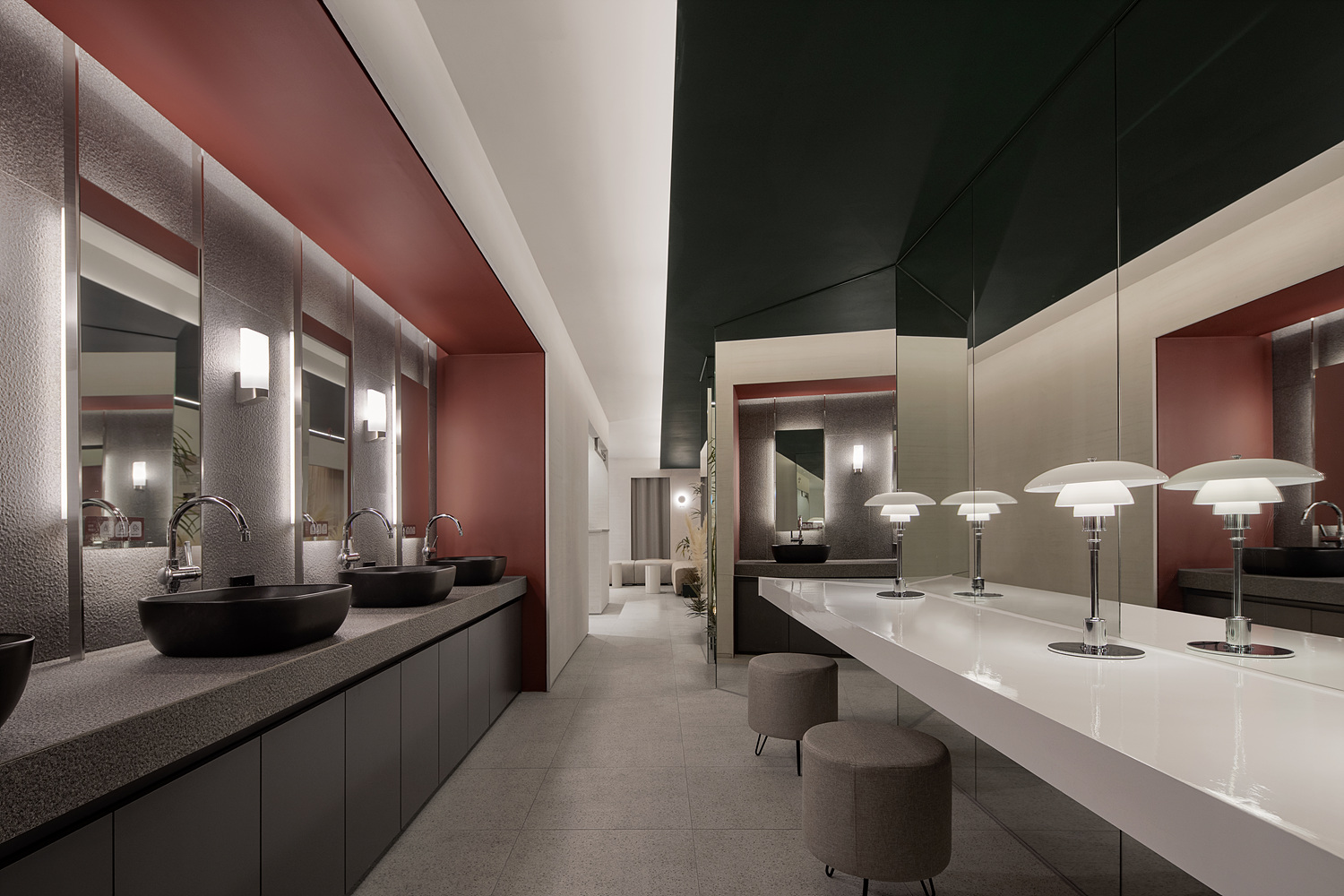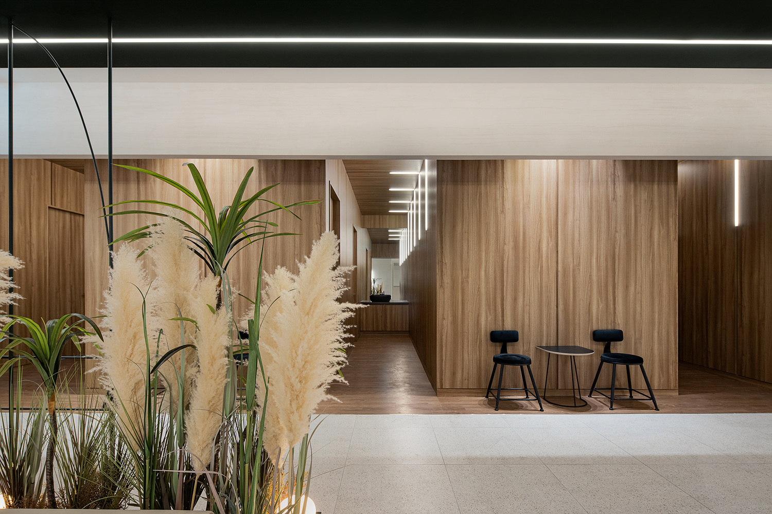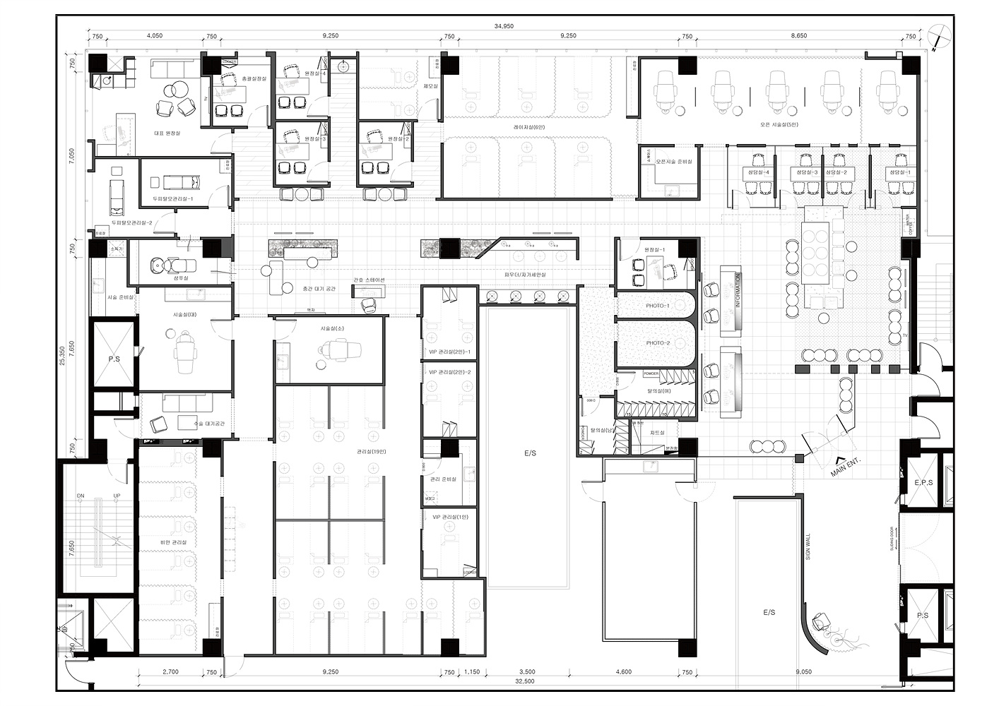 피부과로써 단층 270평은 적은 규모가 아니다. 그렇다고 이용객을 일일이 안내하고자 하는 것도 운영 하는 입장에서 좋은 선택지가 아니다. 우리는 빛과 색이 그 역할을 가질 수 있도록 하였다. 조명과 빛은 동선을 만들어 내고 그리고 따라 갈 수 있는 이정표 역할을 하도록 했다. 그린 컬러가 쓰이는 곳에 굿즈나 제품의 디스플레이 역할을 부여했고 레드컬러에겐 고객의 기본적인 변화를 하는 공간으로 탈의와 메이크업 공간을 그리고 자연재에선 중간 휴식, 마지막으로 우드톤에 와서는 진료의 영역으로 각각의 요소와 색깔에 역할을 부여함 으로써 말과 행동을 통한 전달이 아니라 고객이 눈으로 보고 자연스럽게 선택적 역할을 찾을 수 있는 방법을 고민했던 것이다.