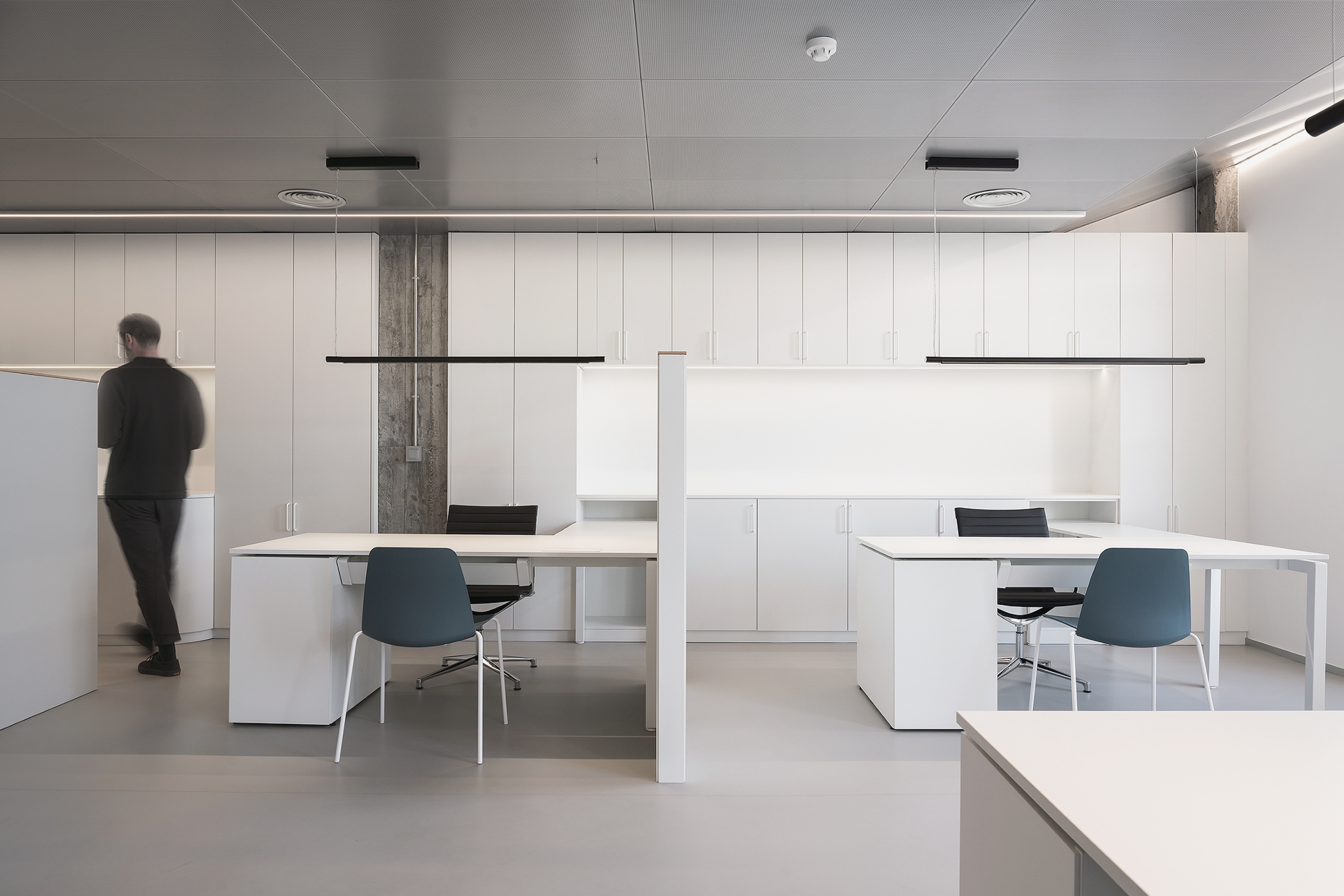 The morphology was based on creating a central body where we would locate the plenary hall. This body should have a great presence in terms of representativeness and volume. The circulation spaces and other offices are articulated around it. To do this, we created a differentiating circulation space through a ceiling made with different materials and located at different heights. The rest of the rooms have a lower metal ceiling. In the longitudinal direction, next to the press room, it is possible to find the offices closed using glass and with direct access to the existing windows. Towards the end of the room we find an open office space, where we added storage furniture and tables joined by work sectors. We also designed an "office" or rest space in line with the materials and aesthetics that predominate in these areas. The materials used also seek to provide comfort to all users. To do this, we used acoustic attenuators on the ceiling of the plenary hall to minimize reverberation. The wood used, both on the ceiling and on the walls, brings warmth to the whole space. Thanks to the use of lighting and different materials, we gave a futuristic look to the area. In this sense, the use of indirect lights has allowed us to enhance the architectural volumes to create the desired effect. Following this futuristic vision, we used very neutral and continuous materials which helped us achieve clean spaces, without fanfare or unnecessary decorative elements. To achieve this, we used metallic finishes such as aluminum in the perimeter ceilings, melamine lining with an aluminum finish in the central volume, a gray vinyl flooring applied in a roll to avoid joints and the use of glass. The shape of the central element is curved in counterpoint to the orthogonal lines of the rest of the set, acquiring greater prominence.