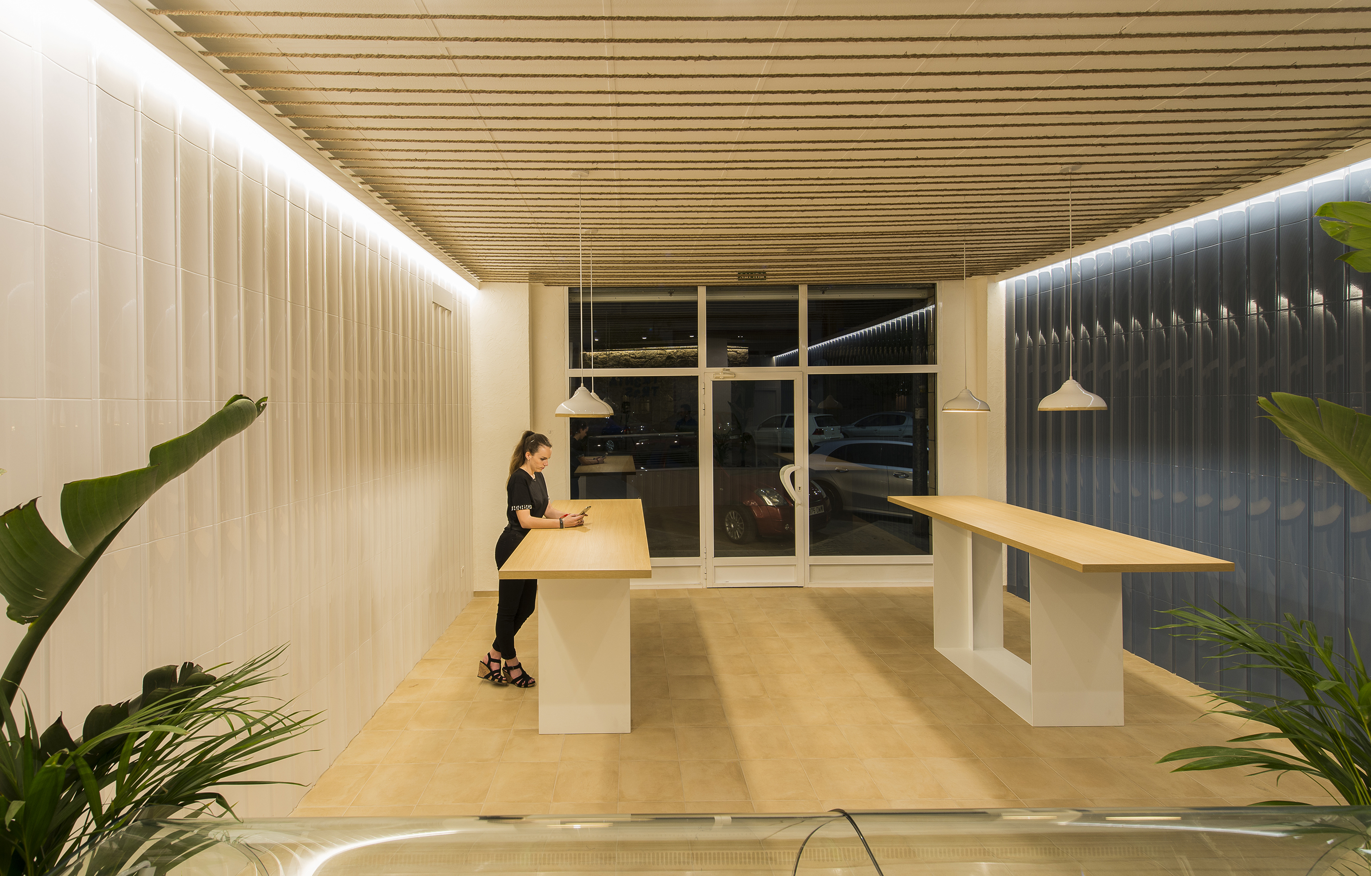 작품의 특징적인 부조와 볼륨은 전형적인 기와를 떠올리게 할 뿐만 아니라 빛과 함께 춤추는 바다의 파도도 떠올리게 한다. 계산대 뒤편에는 Petrer 근처의 채석장인 Bateig의 전통적인 석조 기술로 만들어진 석조 벽이 있다. 손으로 잘게 잘라 깔아놓은 Bateig 스톤은 테라코타 같은 바닥과 조화를 이루며 시야를 선명하게 해 준다. 카운터 옆의 화분들은 공간에 신선함을 더해준다. 이를 위해 극락조(Strelitzia Augusta)와 아레카 야자(Dypsis lutescens)와 같은 종이 선택됐다. 공간감을 높이기 위해 높이를 번갈아 가며 천장을 바라볼 수 있게 했다. 보트 밧줄이 천장을 가로지르며 간단하지만 효과적인 방법으로 보온성을 높였다.
