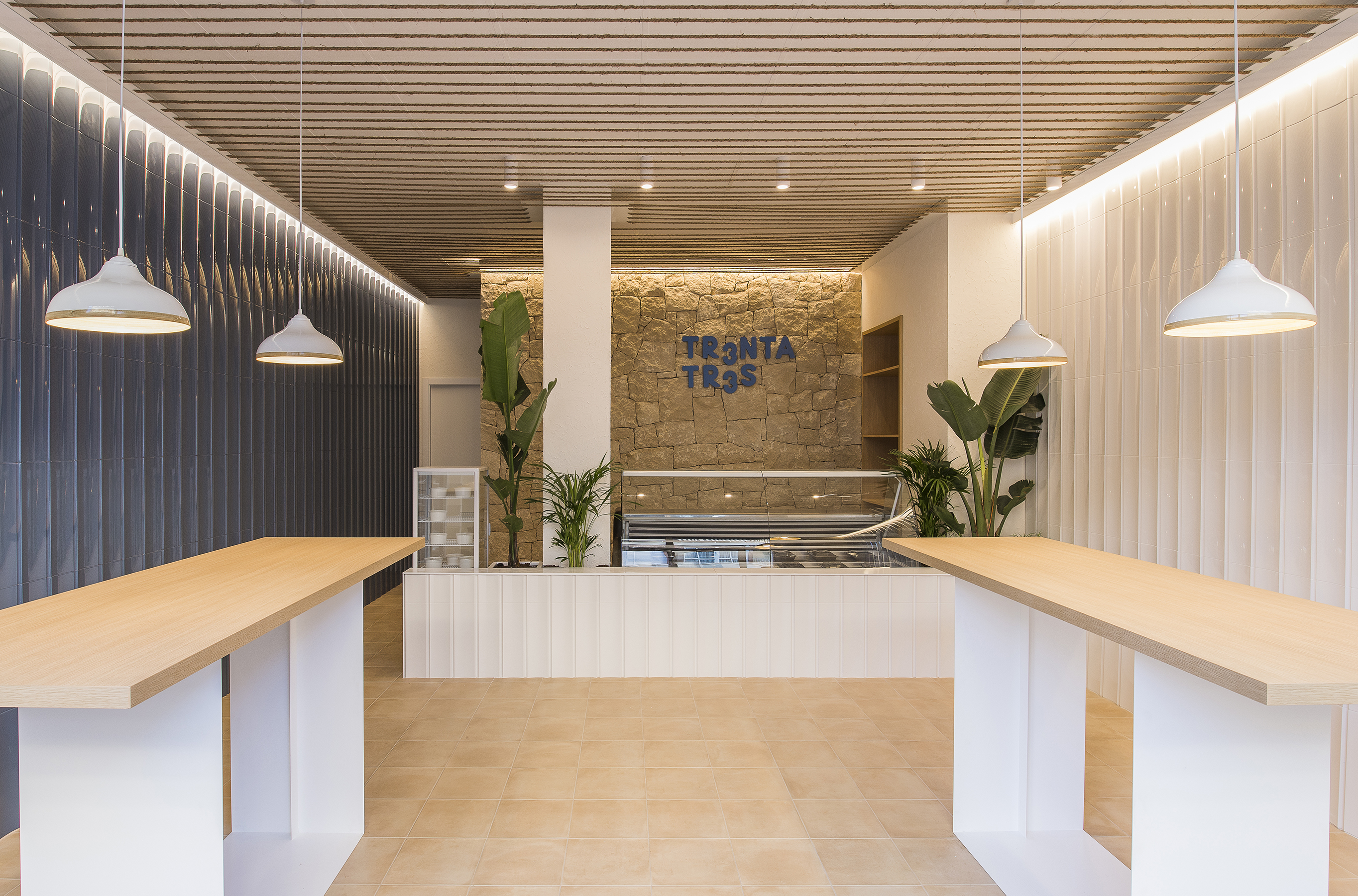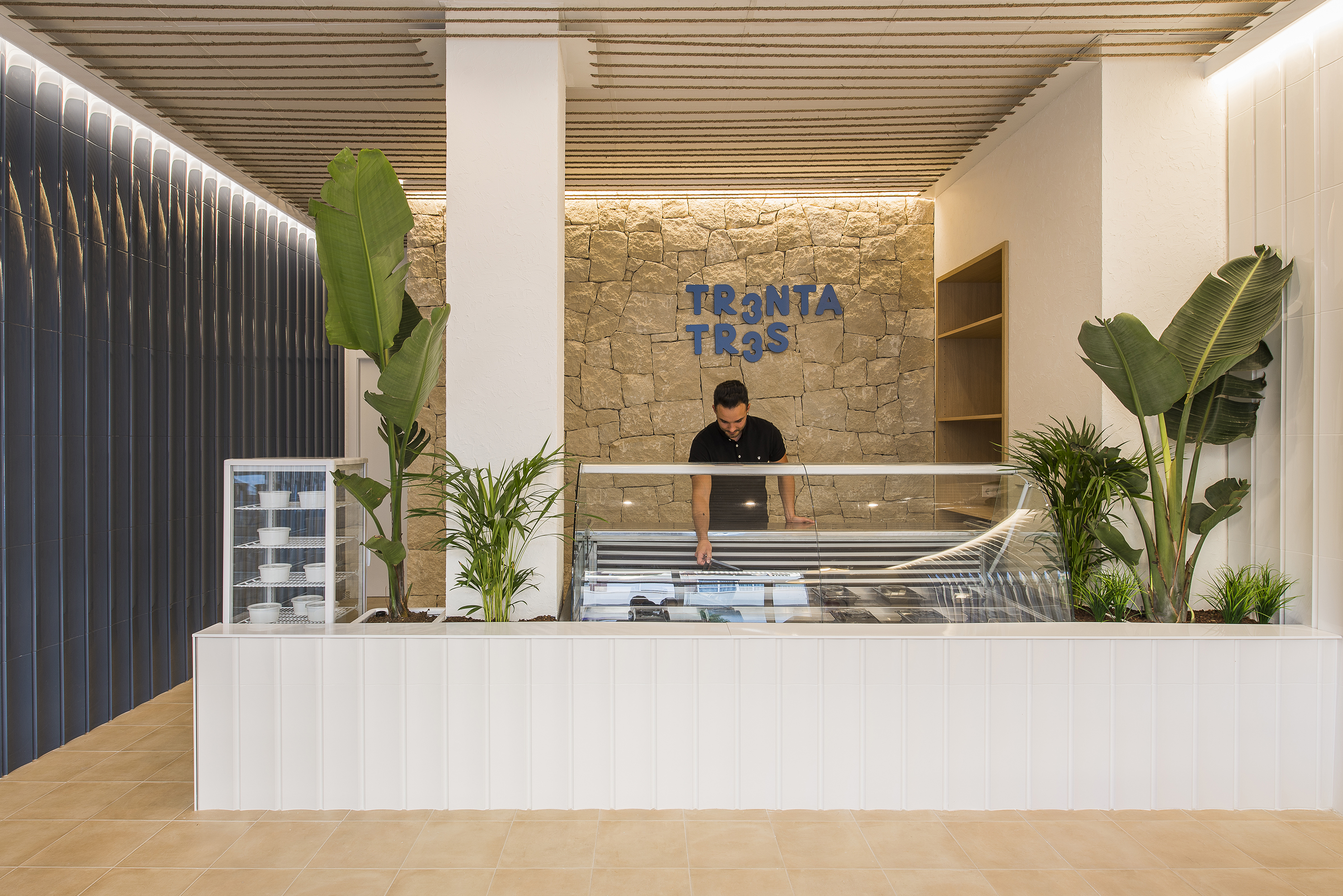 The characteristic relief and volume of the piece not only recalls the typical tiles, but also the waves of the sea dancing with the light. Behind the counter, the back of the public area is topped by a masonry wall, a traditional stone-laying technique from Bateig, a quarry near Petrer. Chopped and laid by hand, the Bateig stone blends with the terracotta-like floor and brings clarity to the perspective of the takeaway. Planters that flank the counter add a touch of freshness to the place. For this, species such as the bird of paradise (Strelitzia augusta) and areca palms (Dypsis lutescens) have been chosen. To increase the feeling of spaciousness, their heights are alternated to invite you to look at the ceiling. A network of jute ropes, in the style of boat ropes, cross the false ceiling to increase the warmth of the takeaway with a simple but effective solution.