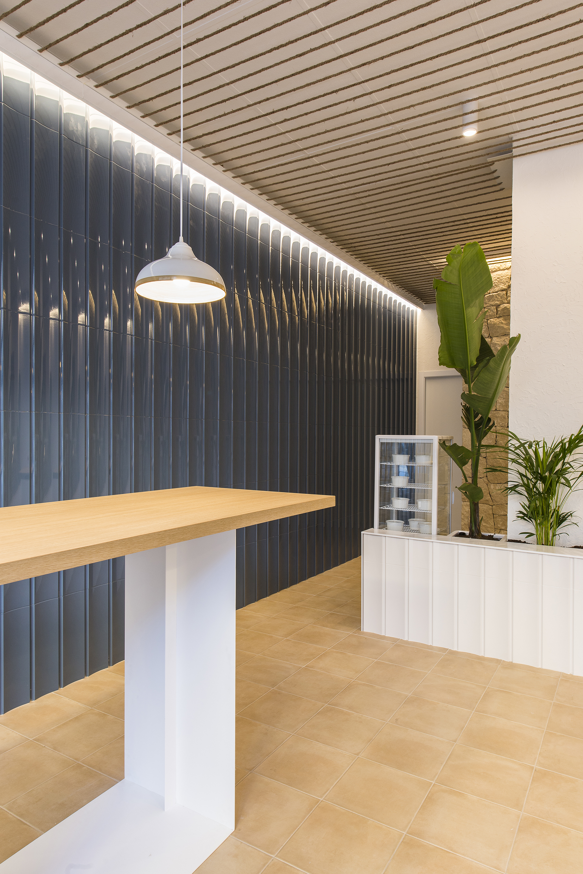 The characteristic relief and volume of the piece not only recalls the typical tiles, but also the waves of the sea dancing with the light. Behind the counter, the back of the public area is topped by a masonry wall, a traditional stone-laying technique from Bateig, a quarry near Petrer. Chopped and laid by hand, the Bateig stone blends with the terracotta-like floor and brings clarity to the perspective of the takeaway. Planters that flank the counter add a touch of freshness to the place. For this, species such as the bird of paradise (Strelitzia augusta) and areca palms (Dypsis lutescens) have been chosen. To increase the feeling of spaciousness, their heights are alternated to invite you to look at the ceiling. A network of jute ropes, in the style of boat ropes, cross the false ceiling to increase the warmth of the takeaway with a simple but effective solution.