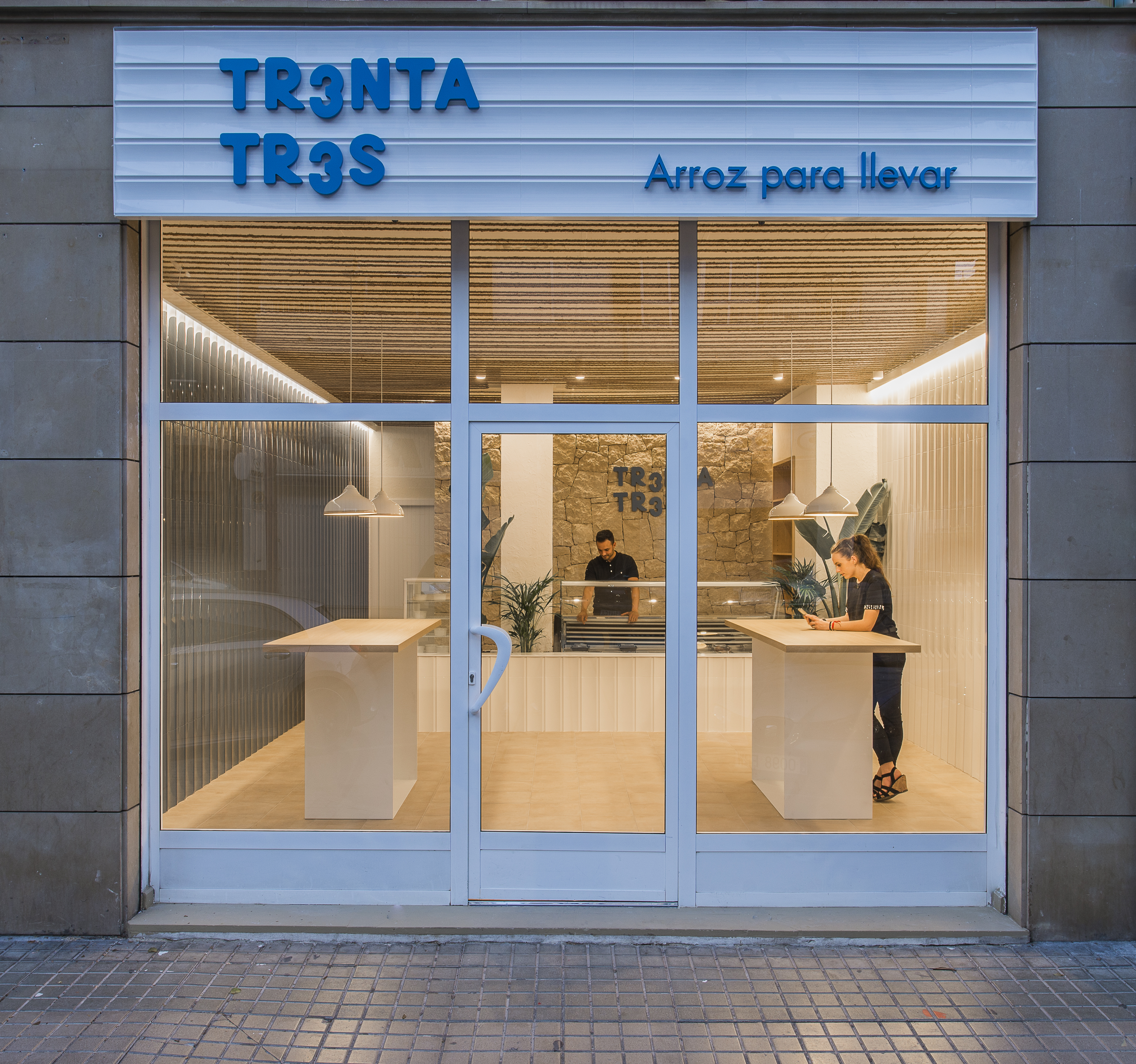 The project occupies a ground floor located on Avenida de Madrid, the main intersection - and the widest street - between the Elda and Petrer conurbation, near Alicante. The program is spread over the 72.67㎡ between the public counter where the traditional rice dishes are ordered and delivered and the kitchen reserved for the Trenta Tres team. The lighting and the finishing of the materials already advance at street level the appeal of a design that combines modernity and tradition. On a white ceramic panel, to match the interior, the store's label is displayed in blue. Longitudinal strips of light illuminate the walls, inviting you to enter the counter directly with the passage marked by two elongated tables. With an inexpensive and handcrafted design, even the tables have been designed on purpose for the takeaway, using oak wood with a handcrafted system of white lacquered sheet steel. A blue wall on the left and a white wall on the right are reminiscent of Proust's "madeleine" with glazed ceramic designed in Castellón.