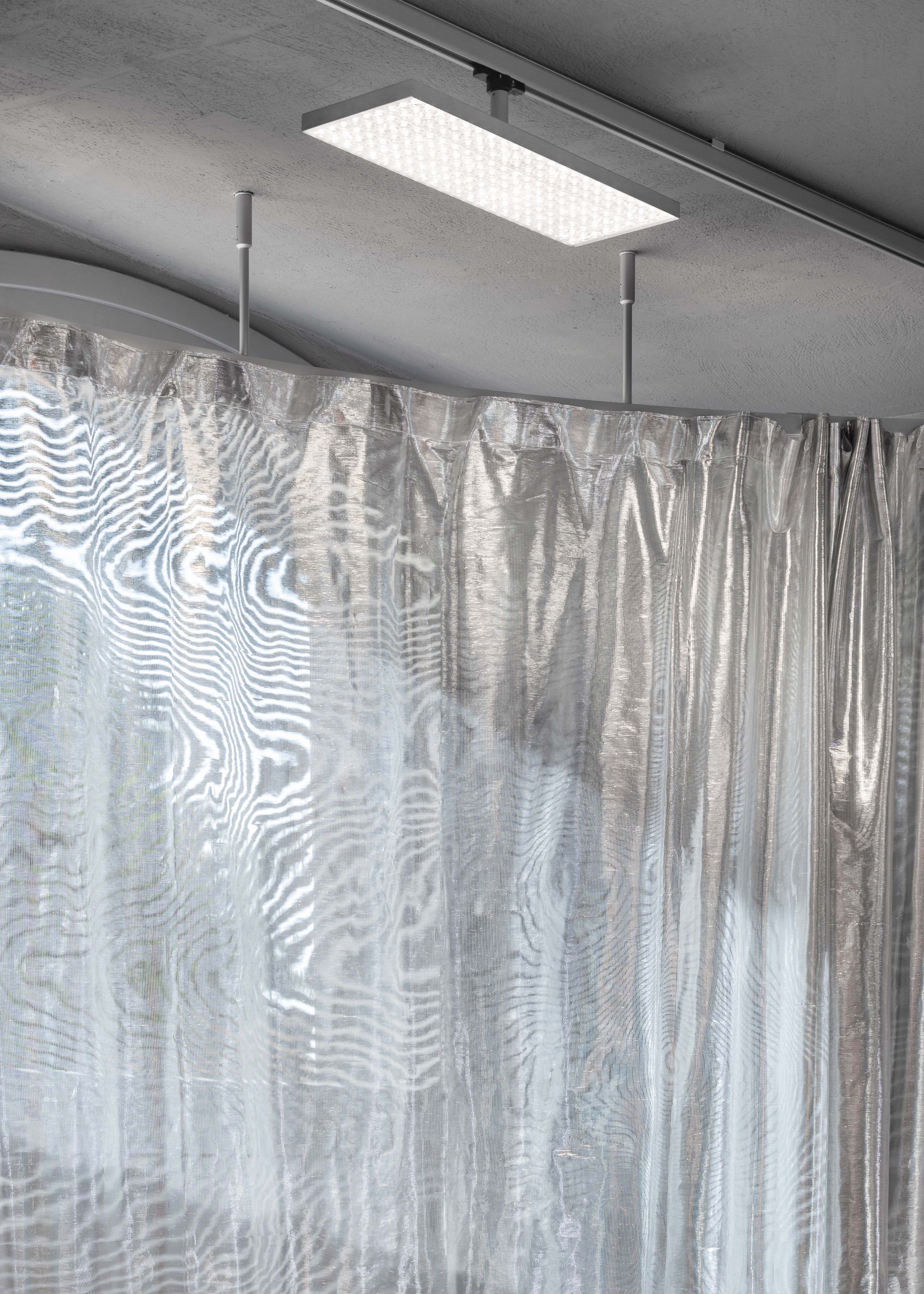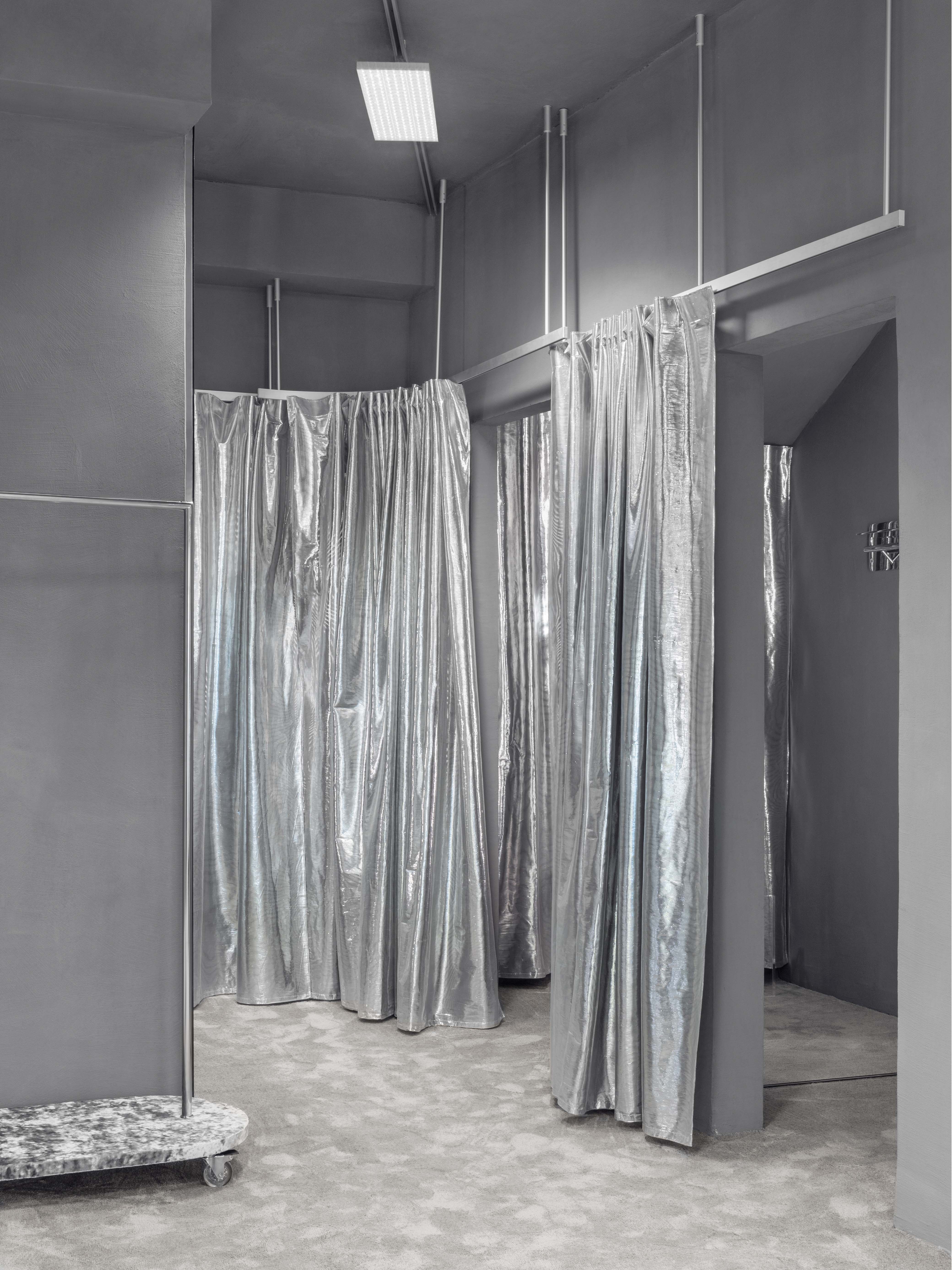 모든 커튼은 금속 섬유로 만들어져 빛을 반사하고 구성에 약간의 부드러운 움직임을 더해준다. 디스플레이는 이 특정 차갑고 회색 쉘을 활용한다. 큰 볼륨으로 제작된 각 디스플레이 블록은 모양이 독특하고 하나 또는 두 가지 색상으로 만들어졌다. 형태와 색상 모두 이 회색 기후에 위에 떠 있는 부표처럼 되어 상품을 대형 디스플레이를 제공한다. 대형 디스플레이 블록을 보완하기 위해 상품이 진열되는 표면은 아연 도금, 양극 산화 처리, 브러시 처리 또는 고광택 처리와 같은 다양한 강철 금속 마감재로 만들어졌다. 유색 제품은 중성 금속 표면 위에 전시되고, 햇살 가득한 마을에 있는 무채색 건물 외피 위에 서 있는 느낌을 준다.