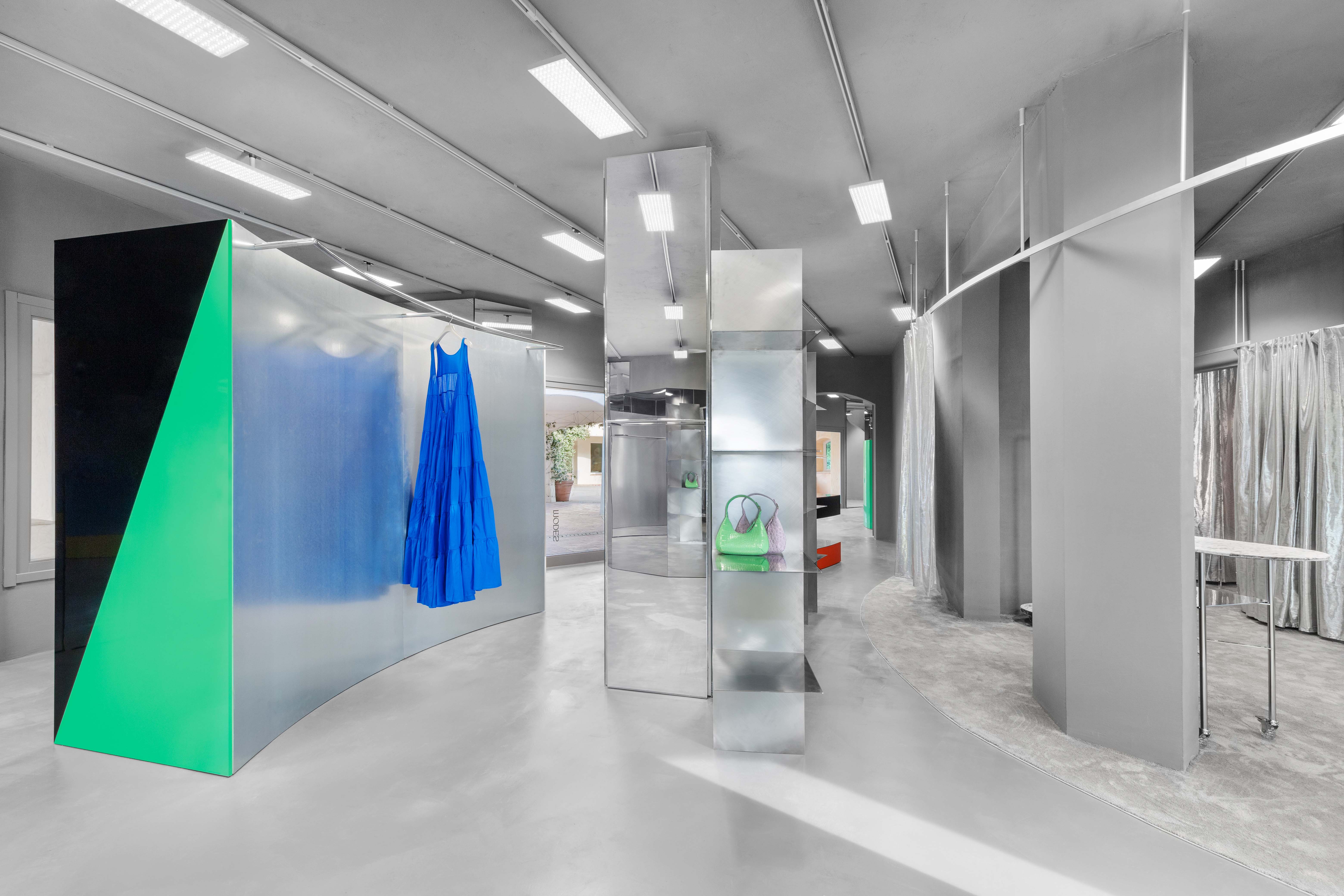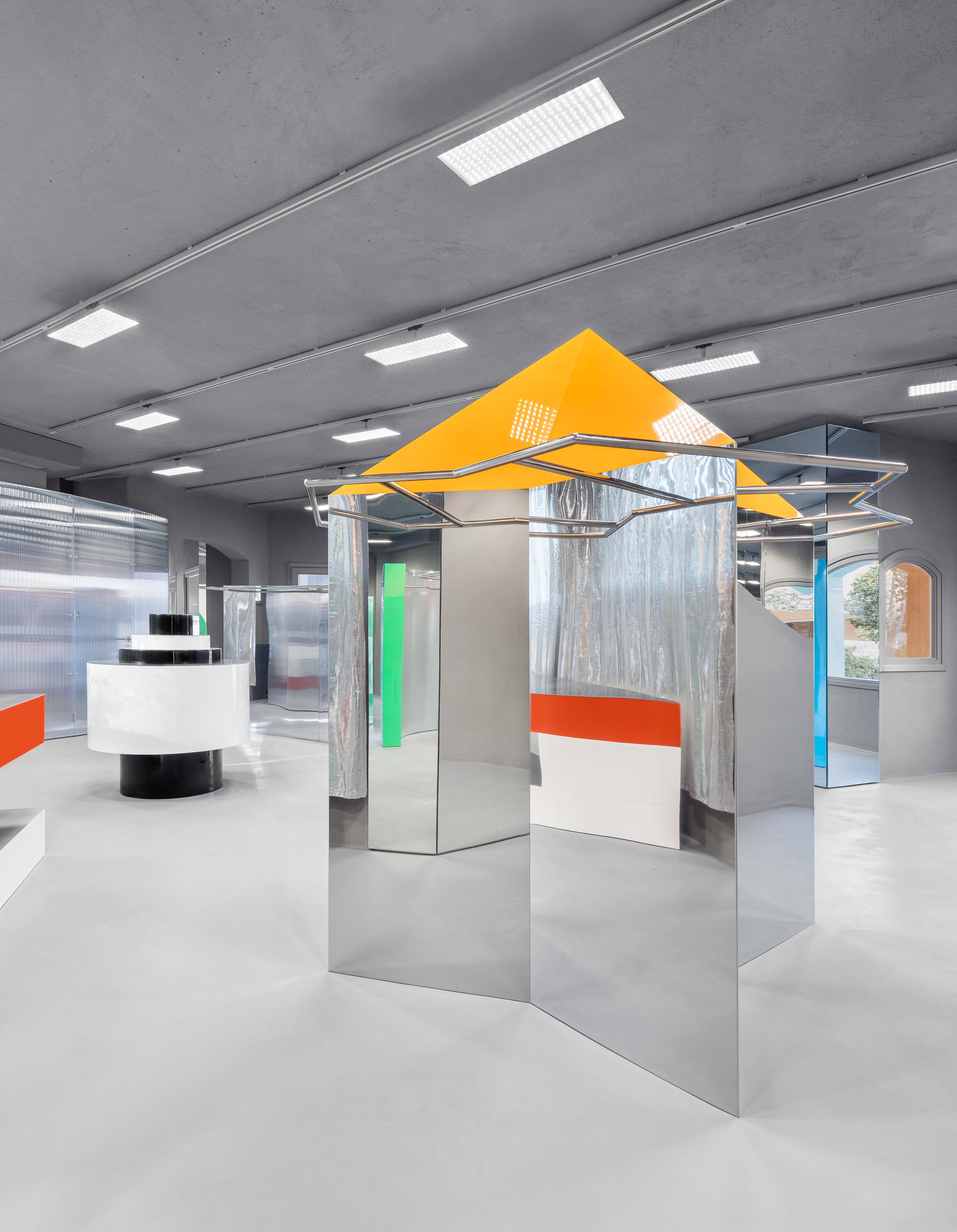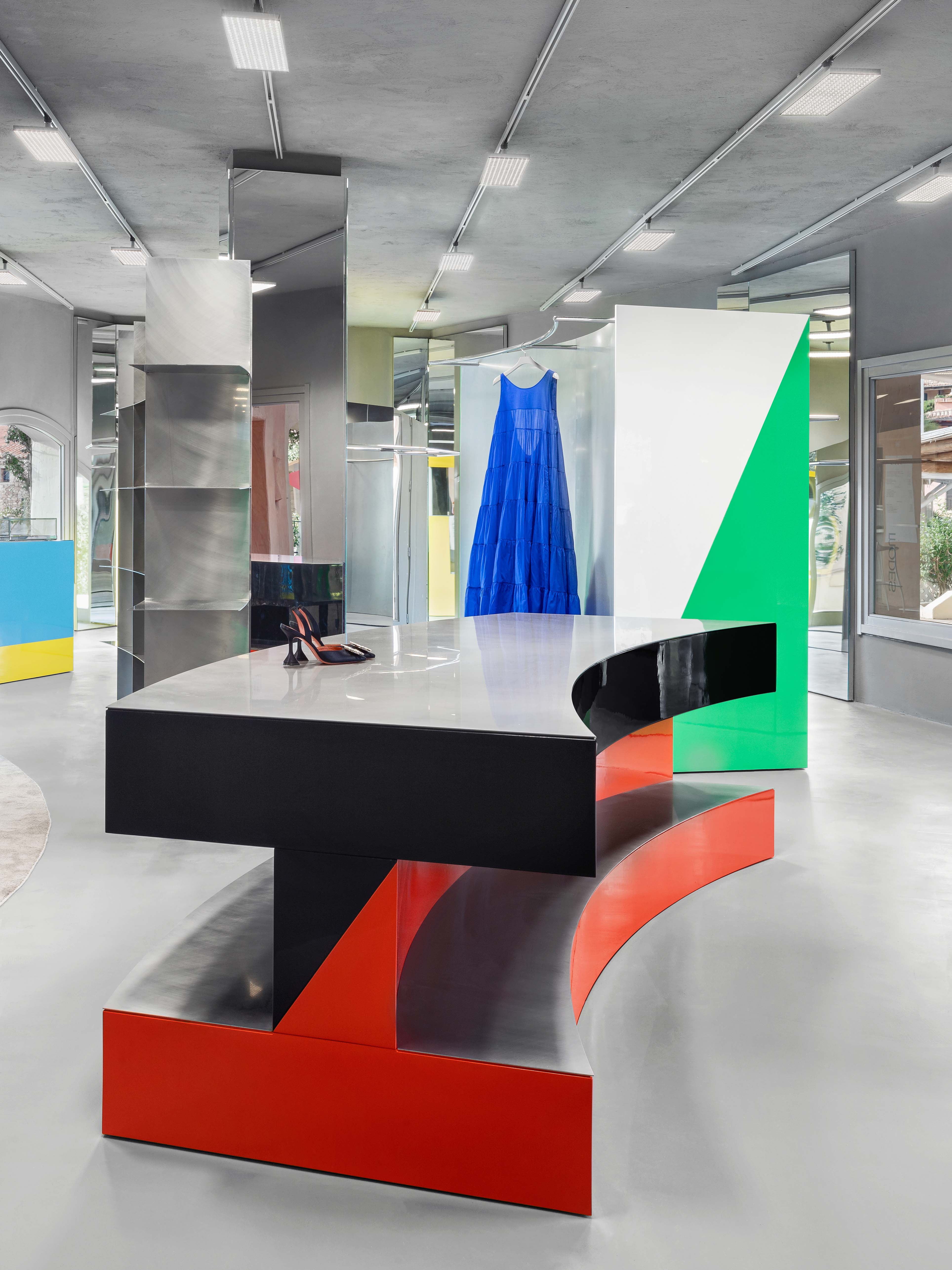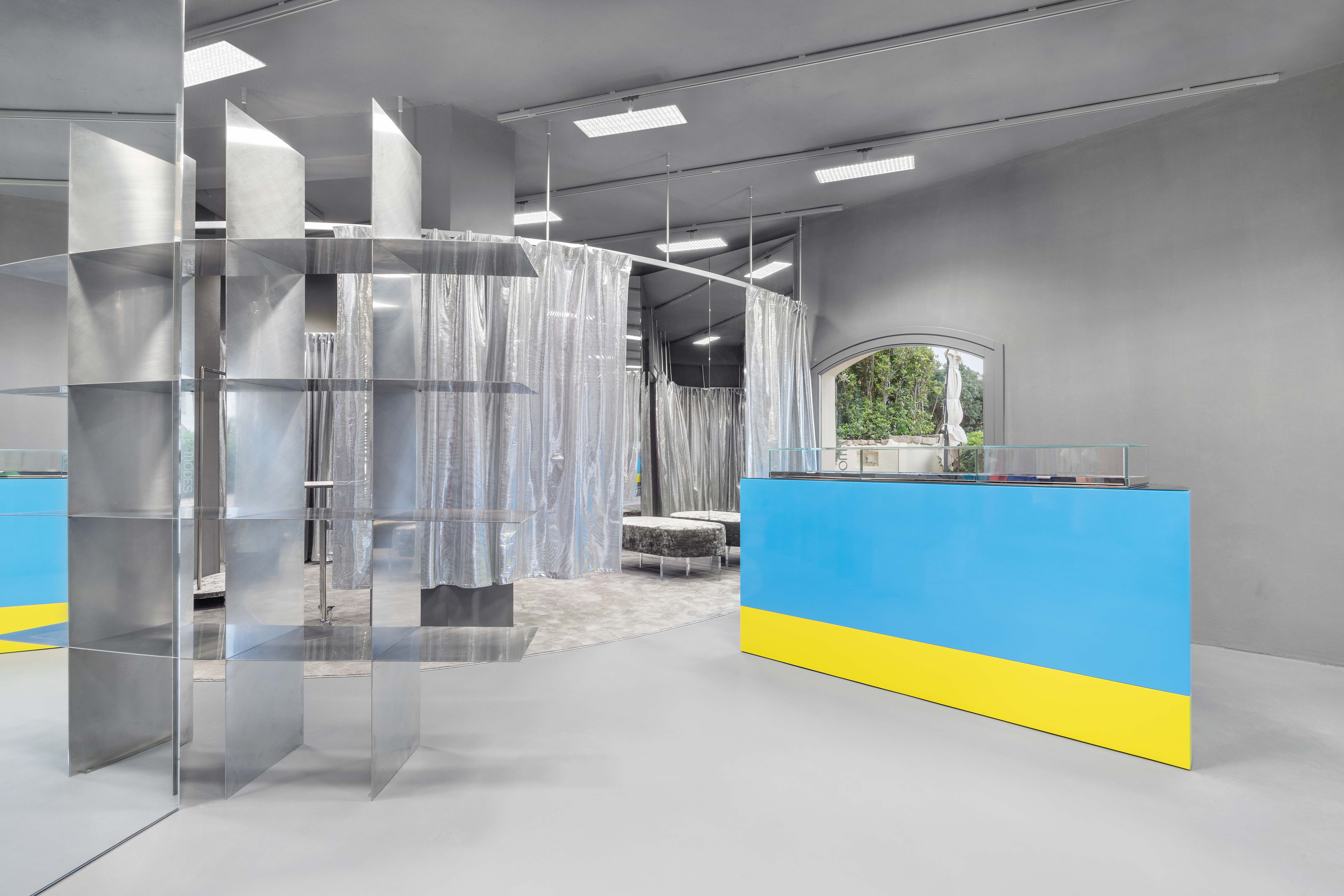 Added to this dispositif all curtains are made from metallic fiber, reflecting the light and adding some gentle movement to the composition. The display takes advantage of this particular cool and grey shell. Made as large volumes, each display block is unique on his shape and works with a palette of one or two colors. Both the form and the colors become a buoys-like floating on this grey climate also providing a large display for the goods. To complement the large objects, the surfaces where merchandise is displayed are made of different steel metal finishes like galvanised, anodised, brushed or high polished to become a second level of neutral display. The colored goods are displayed over neutral metal surfaces, the colored displays are standing over the neutral building shell that is itself on the colored sunny village.