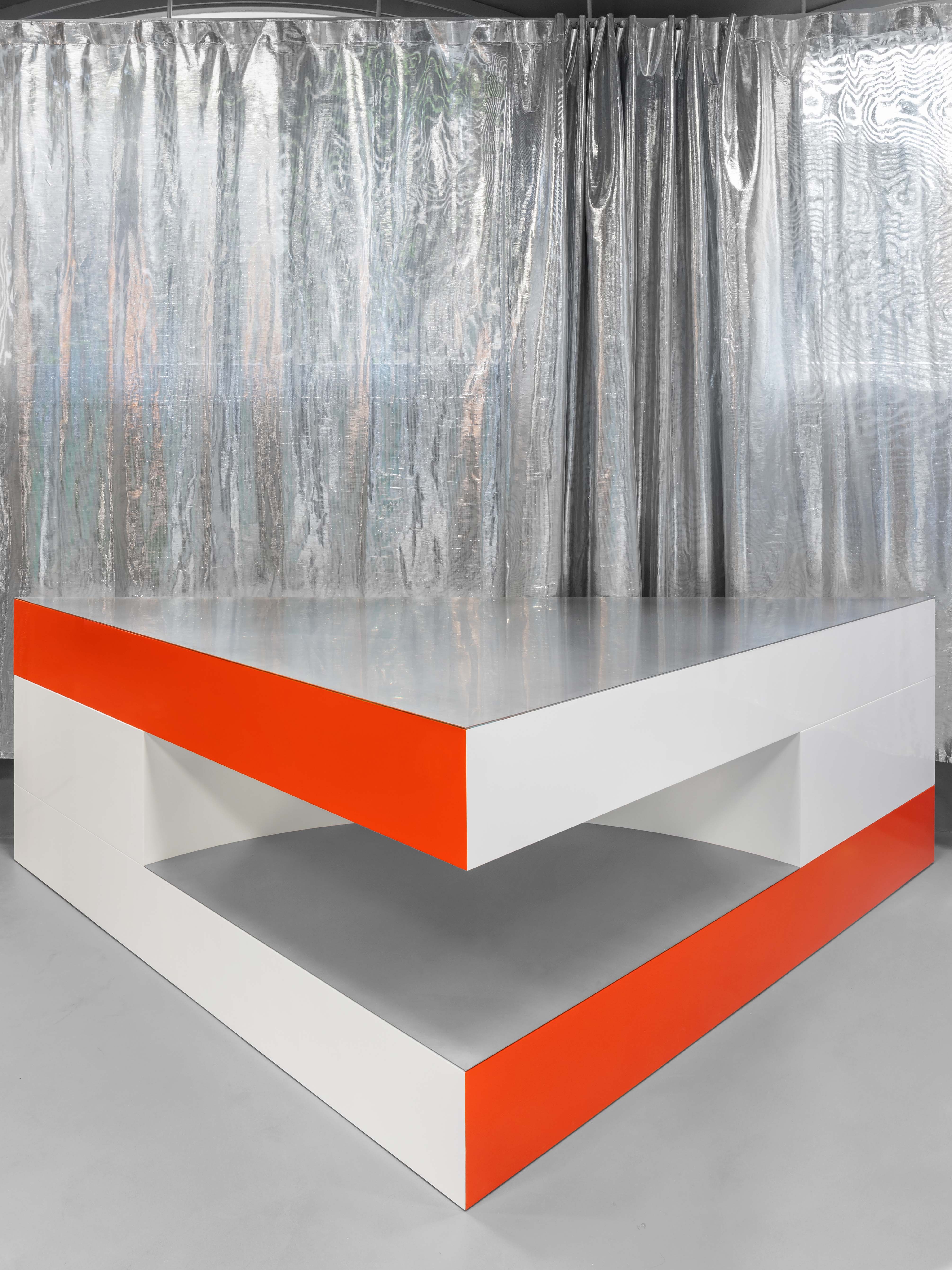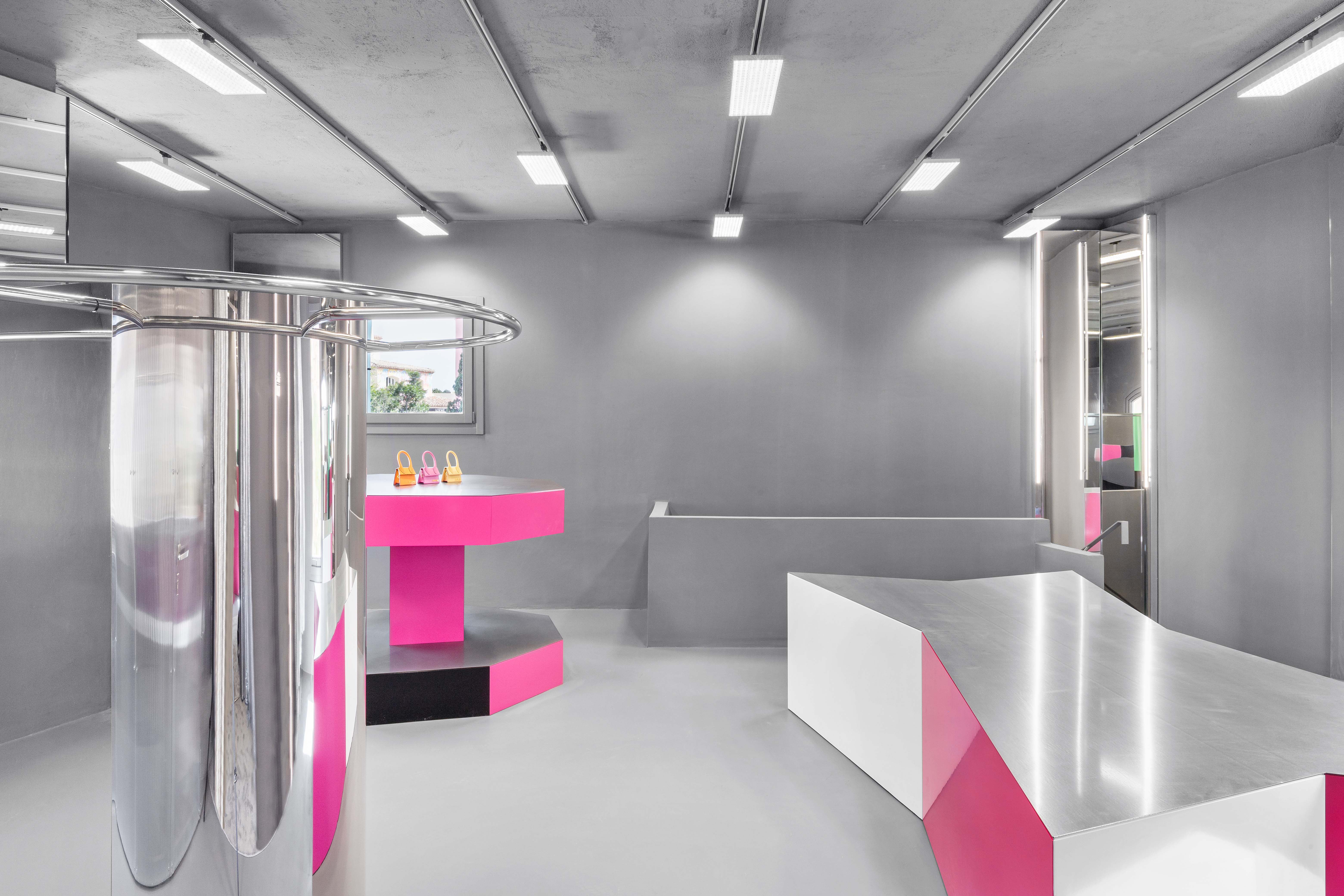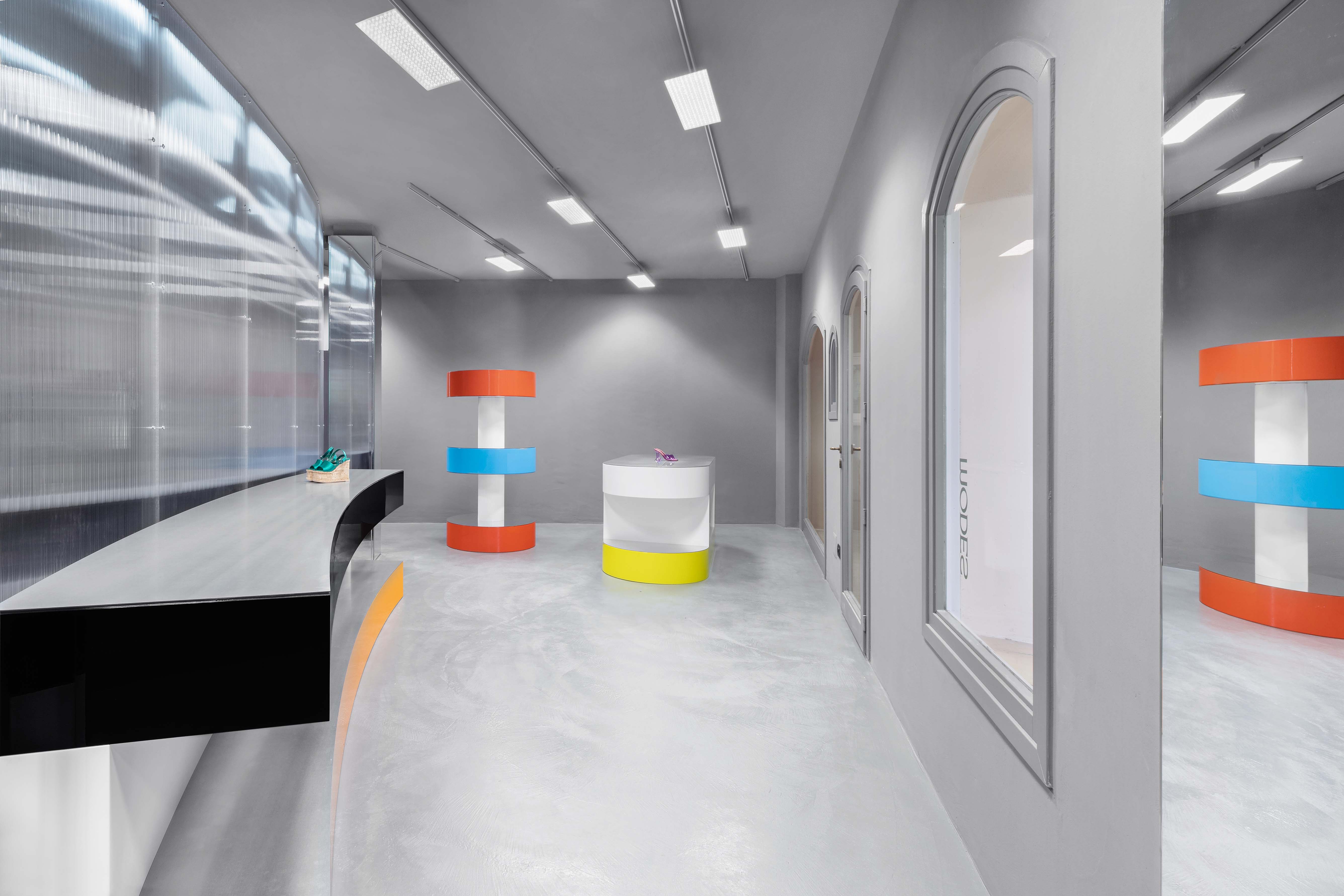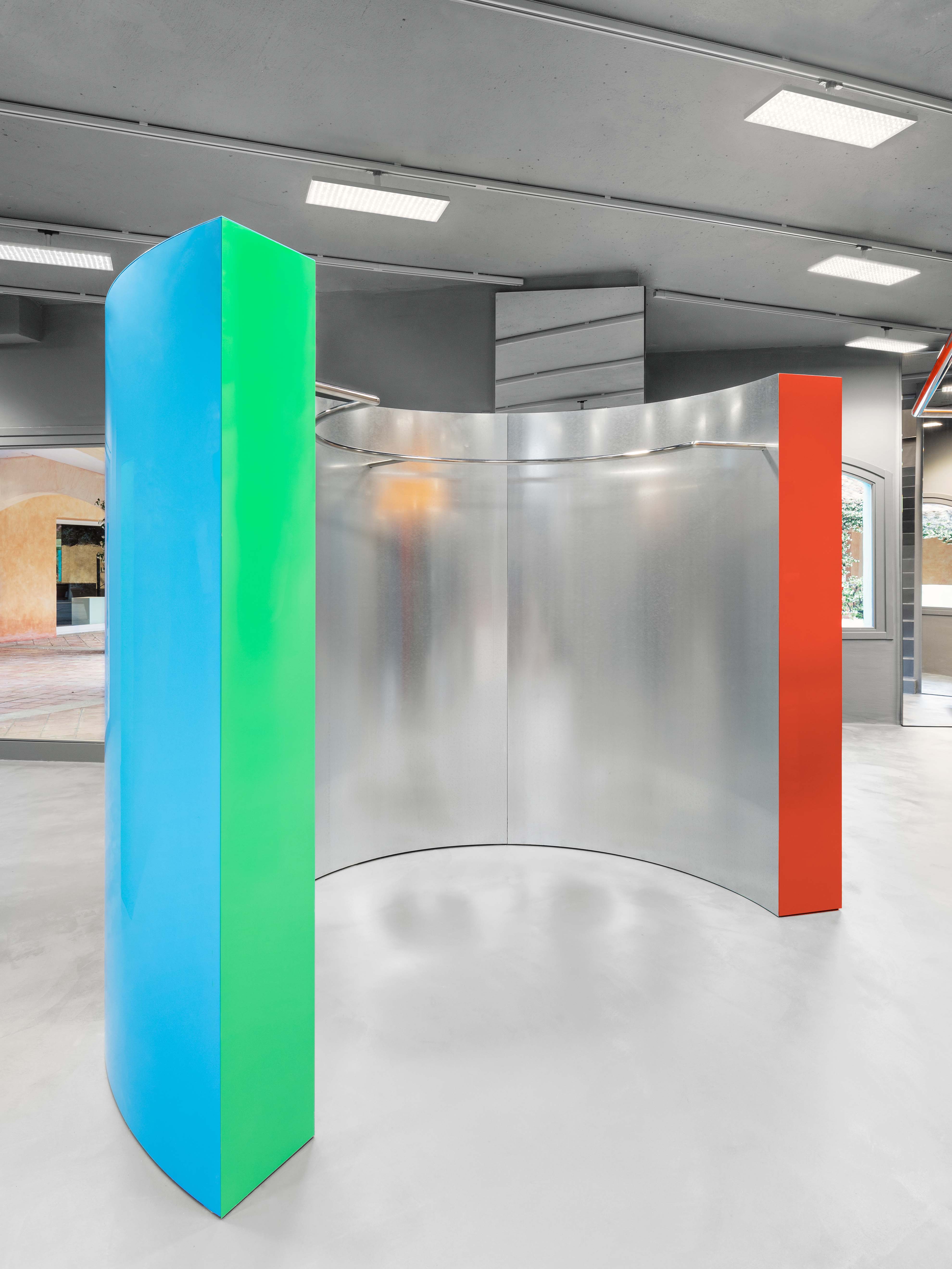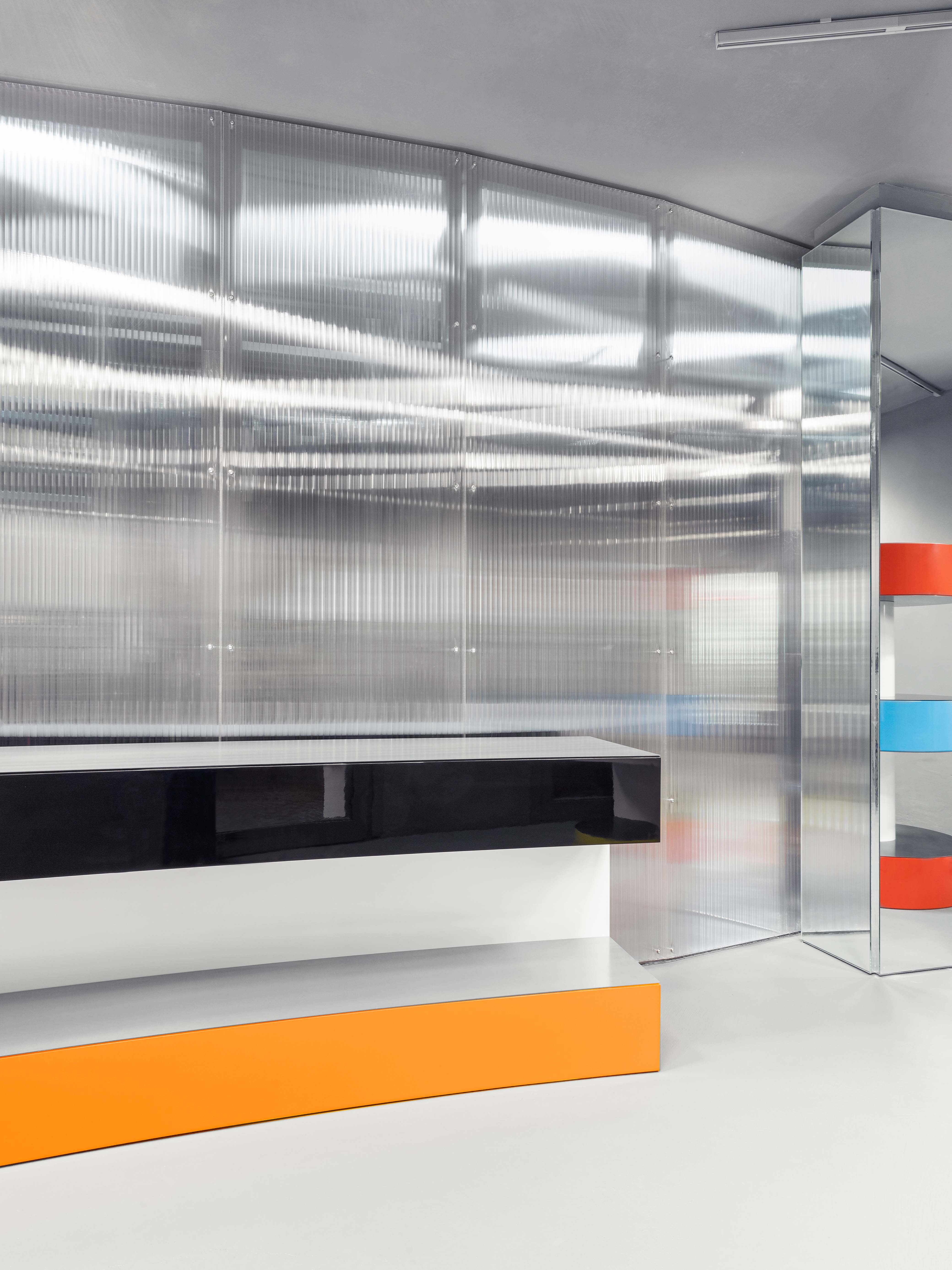Added to this dispositif all curtains are made from metallic fiber, reflecting the light and adding some gentle movement to the composition. The display takes advantage of this particular cool and grey shell. Made as large volumes, each display block is unique on his shape and works with a palette of one or two colors. Both the form and the colors become a buoys-like floating on this grey climate also providing a large display for the goods. To complement the large objects, the surfaces where merchandise is displayed are made of different steel metal finishes like galvanised, anodised, brushed or high polished to become a second level of neutral display. The colored goods are displayed over neutral metal surfaces, the colored displays are standing over the neutral building shell that is itself on the colored sunny village.