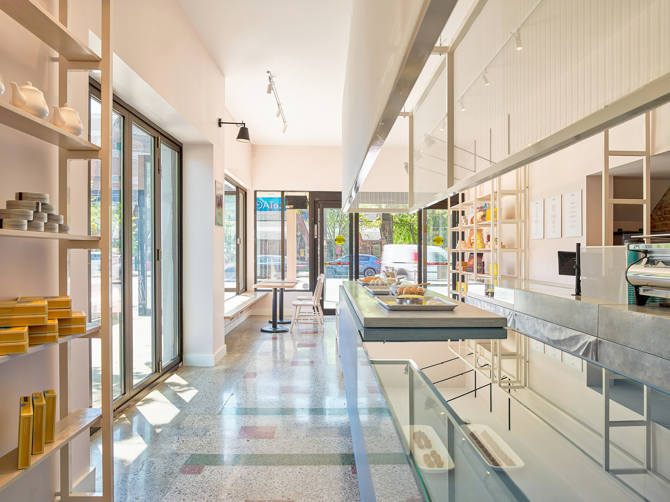 Design began with an exploration of the manufacturing process that creates LeTAO’s signature cheesecakes and cookies. They are baked in moulds with paper lining and the richness and texture of wrinkled paper is a recognizable trait. They resonated with the processes used to build the neighbourhood. Poured concrete sidewalks and trowelled roadways relate to the textures of baked goods in this interior. Treats are displayed on a plinth in the centre of the space.Above the plinth, a suspended illuminated fabric structure directs attention to the display. The surrounding walls are lined with a steel frame display shelving system that is lit from above with extended wall-mounted lights. Service counters are clad with fabric textured concrete. The richly coloured and patterned terrazzo floor is a remnant of its former tenants. Blue and sand are the colours that fill the space. Blue stained wood offsets the cream coloured cheesecakes on display. Display shelves and furniture are designed as an extension of street furniture by using concrete and a-frame signs (characteristic of Toronto sidewalks). Continuous shelf frames along the exterior walls obscure views to the street.