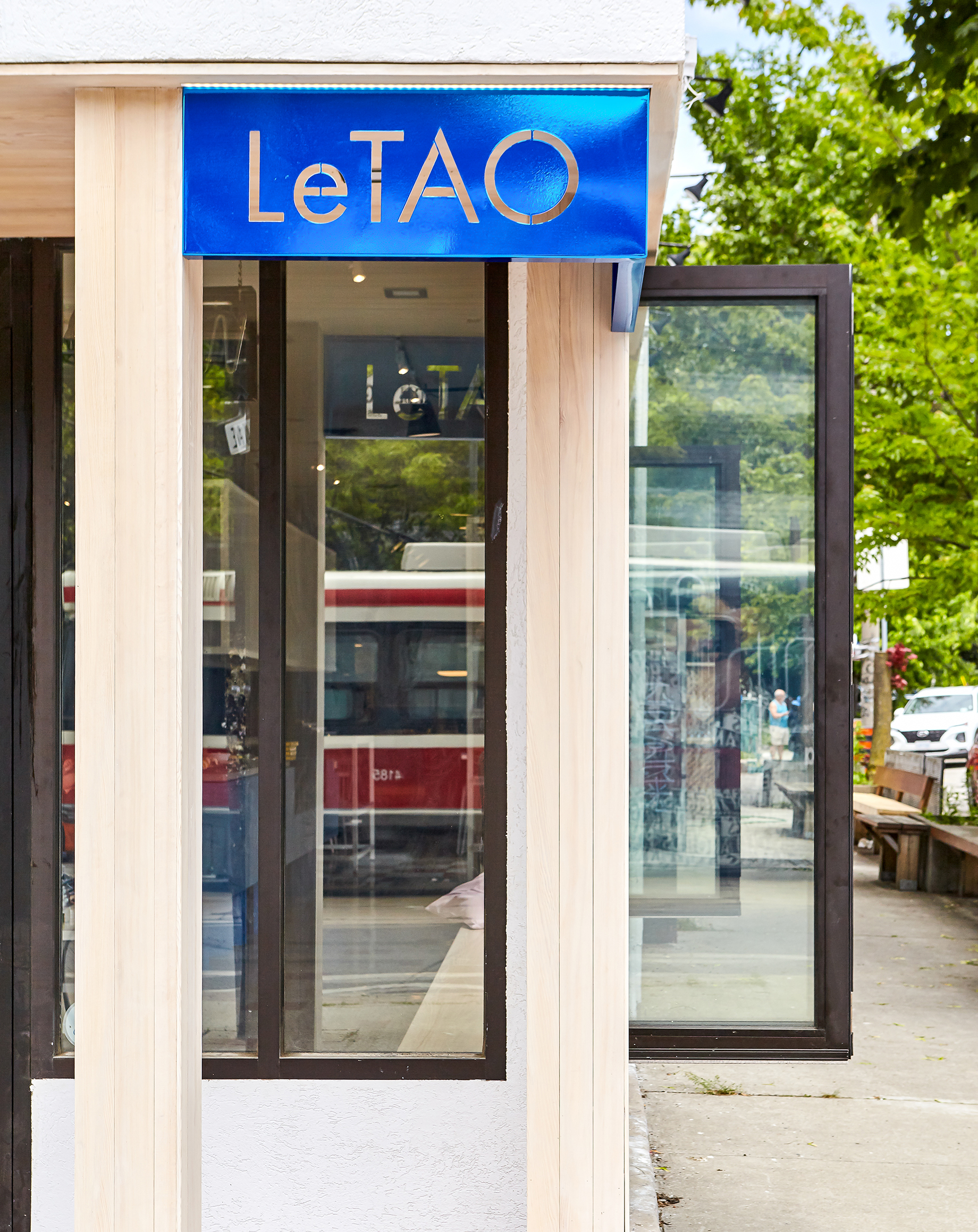디자인은 LeTAO의 시그니처 치즈케이크와 쿠키를 만드는 제조 공정을 탐구하면서 시작됐다. 그들은 종이 안감이 있는 틀에서 구워지며 주름진 종이의 풍부함과 질감은 알아볼 수 있는 것이 특징이다. 콘크리트 보도와 흙으로 된 통로는 식품의 질감과 관련이 있다. 공간 중앙의 받침대에는 간식이 전시되어 있다. 주변 벽에는 확장된 벽걸이 조명으로 위에서 비추는 강철 프레임 디스플레이 선반 시스템이 늘어서 있다. 서비스 카운터는 패브릭 질감의 콘크리트로 덮여 있다. 풍부한 색상과 패턴의 테라조 바닥은 이전 세입자의 잔재입니다. 공간을 채우는 색상은 파란색과 모래색이다. 블루 스테인드 우드가 진열된 크림색 치즈 케이크를 상쇄시켜준다. 전시 선반과 가구는 콘크리트와 A-프레임 표지판(토론토 보도의 특징)을 사용하여 거리 가구의 확장으로 설계됐다. 외벽을 따라 이어진 선반 프레임이 거리의 풍경을 가리고 있다.