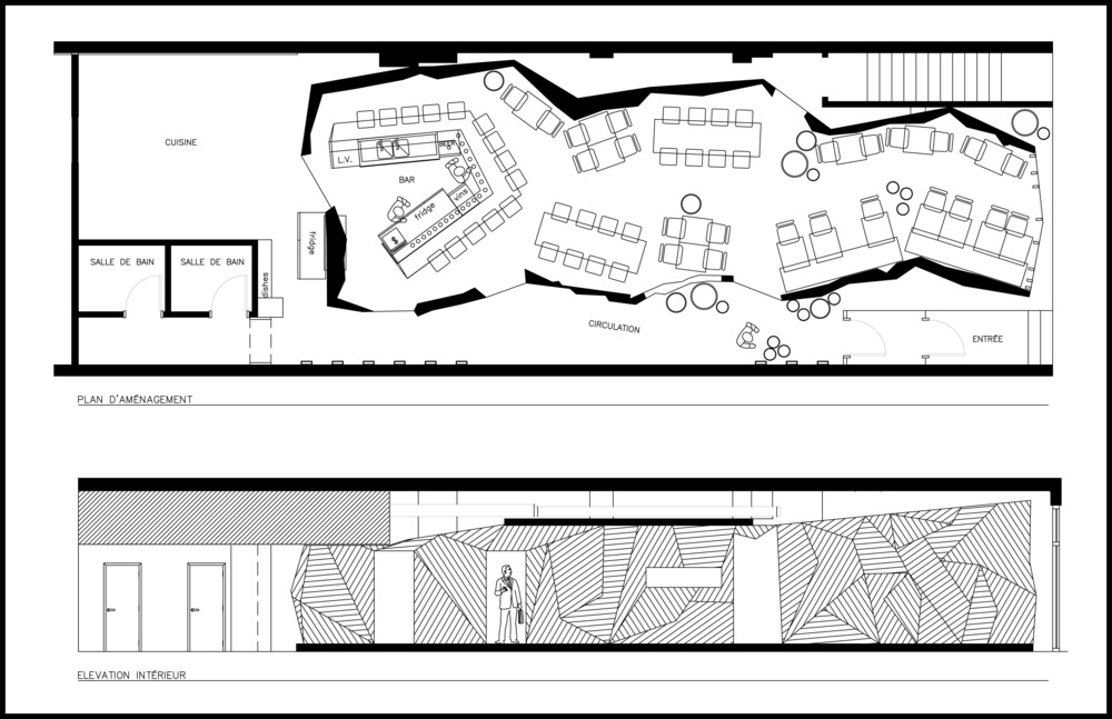 The space, such as how one could figure what the interior of origami looks like, is composed of triangles of various sizes, crookedly placed in a random fashion. "Jean told me what he wanted to feel in this place. Where one had to be cramped also. It's a fantasy cave where people are in a constant visual exploration mode", says artist carpenter Dominic Samson, Solution durable, who built the structure, a piece of work he’s proud of and that he describes as uplifting.