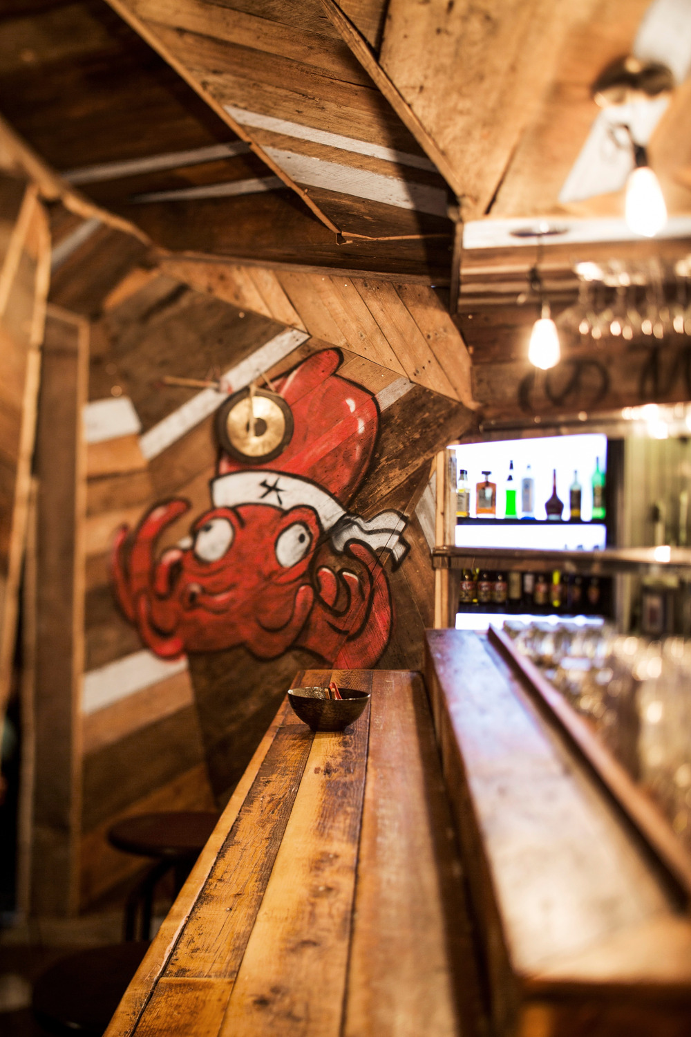 The uncouth-tavern style decoration is left to its simplest expression: the furniture and lighting were salvaged from previous Kinoya, drawings and graffitis offend the eye and confirm the urban character of the establishment. Kakemono banners that are used to hide the street also perpetuate the Japanese tradition.