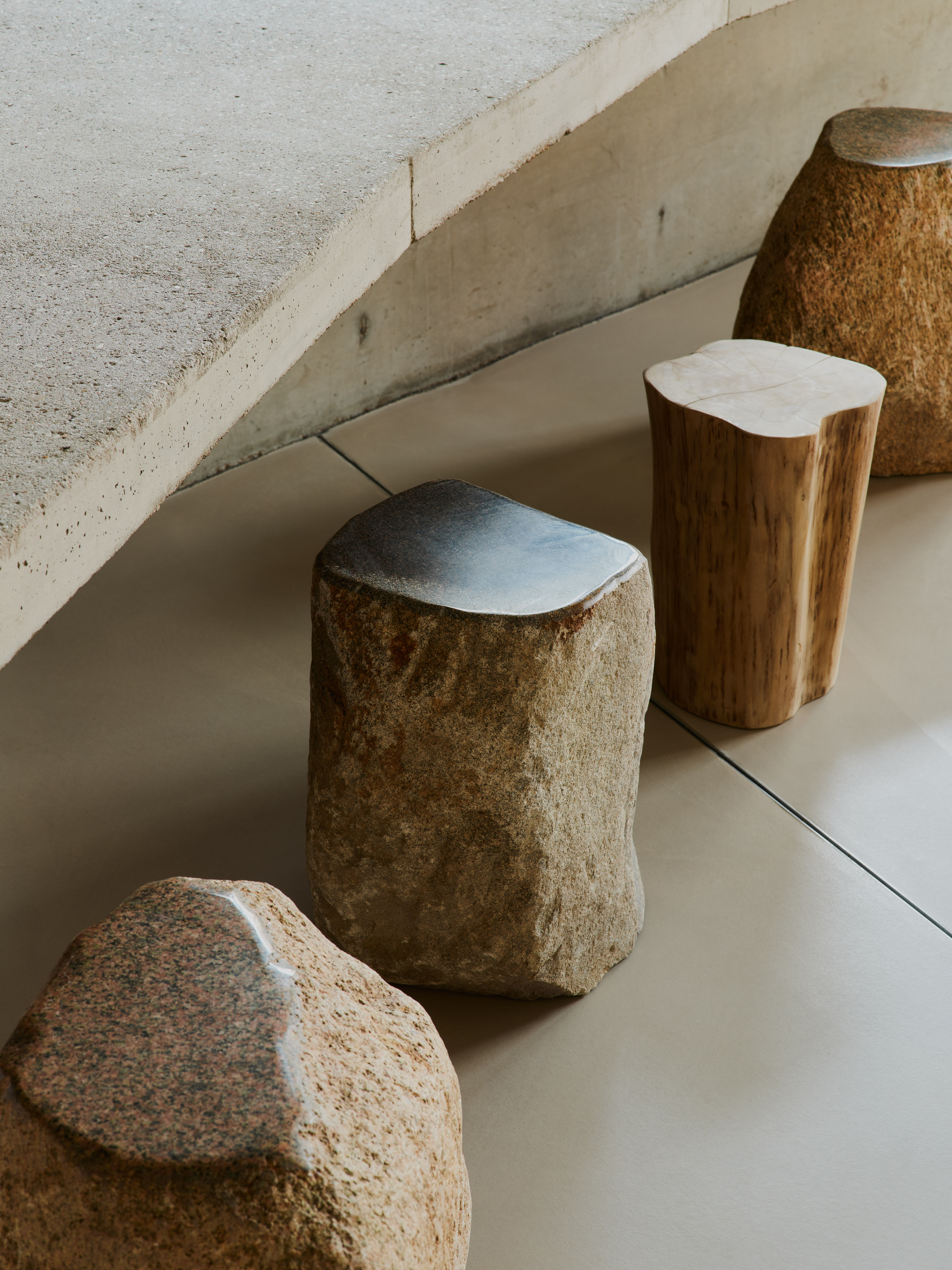The guest room transports the idea of an intimate and meaningful experience. Two curvy concrete tables who compliment each other capture the room's center attention. Inspired by the fisherman, cut off granite stones from Norway and wooden stumps present the possibility to take a seat. The table has a rough yet pleasant surface and gives the idea of a terrazzo structure. Boulders of different colour ways add a natural and warm color palette to the interior.