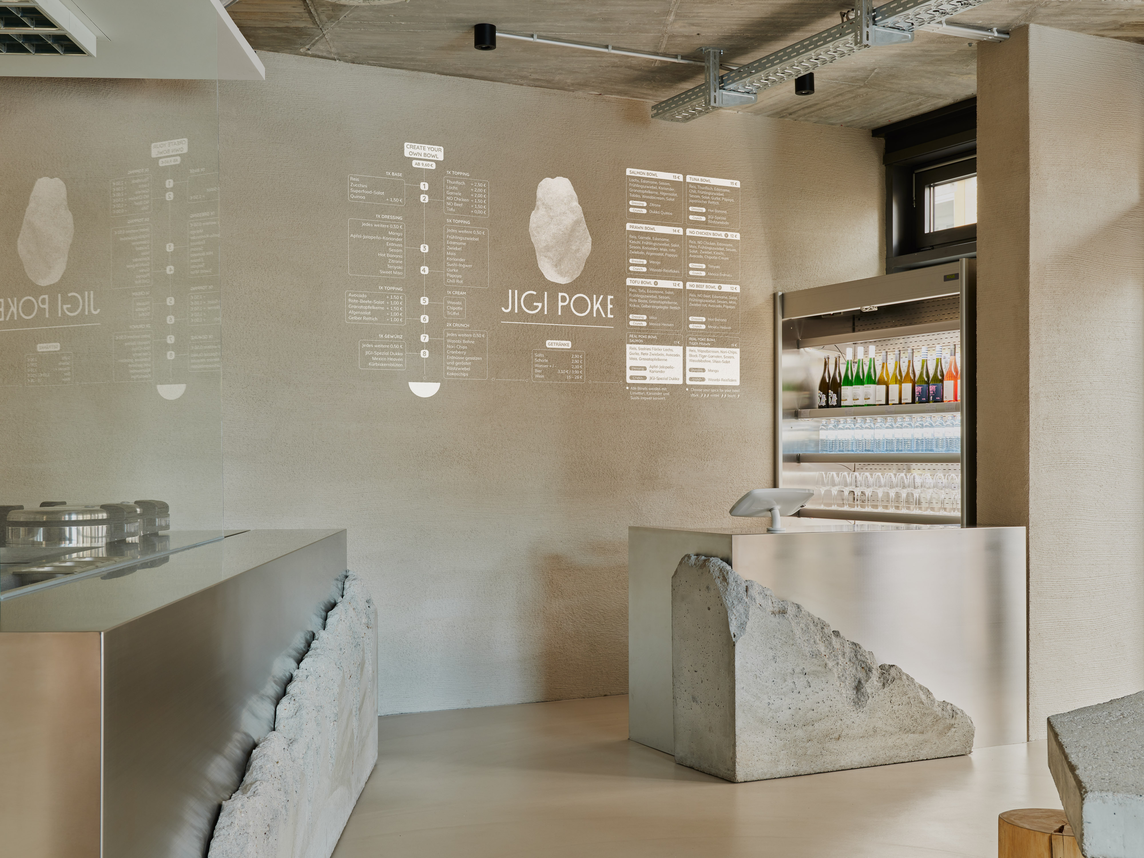 A stone, which is part of the restaurants corporate identity, slowly spins in the window at the most prominent place of the restaurant. Hand-crafted concrete applications with a rough texture go hand in hand with stainless steel kitchen counters which are separated from the guest room through a large glass.
