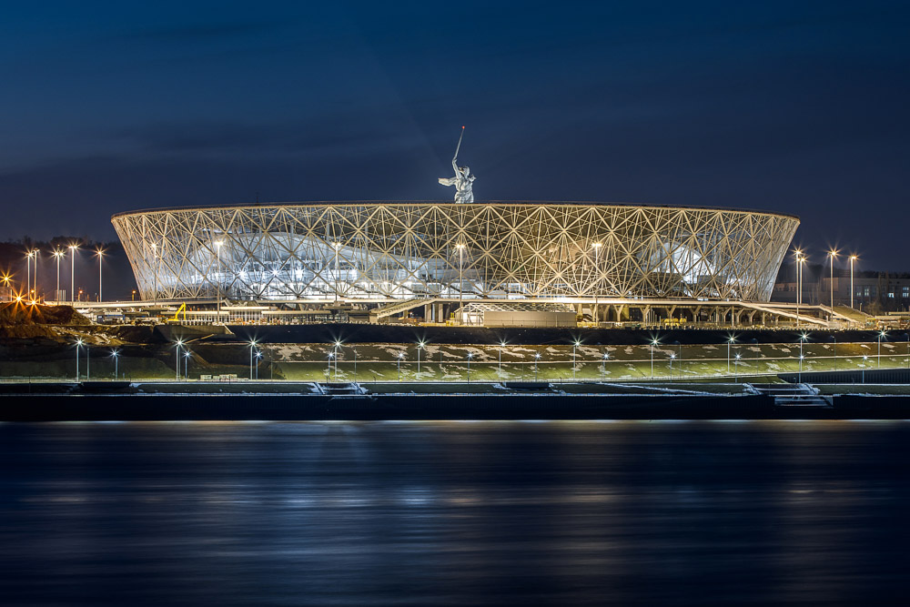 볼고그라드 축구경기장은 2018년 러시아 월드컵을 위해 지어진 아레나다. 경기장은 뒤집힌 원뿔대 모양이며, 입면은 고국의 명예로운 수호자들을 연상시키듯 엄숙하고 치열한 선들이 얽혀있다. 곳곳에 쓰인 구조는 마름모의 꼭짓점에서부터 뻗어나가는 강철 셸과 스팬들로 이뤄져 있다. 경기장에 이러한 입면은 관중석으로부터 가벼우면서도 튼튼하게 경기장의 틀을 만들어낸다. 이 얽히는 선들의 건축적 표현 방법은 건축가가 이곳의 행사를 축하하고 이 경기장만의 승리의 이미지를 새롭게 만들어내기 위함이다. 이러한 이미지들은 볼고그라드라는 도시가 가진 오래된 영웅적 역사를 떠오르게 만든다.