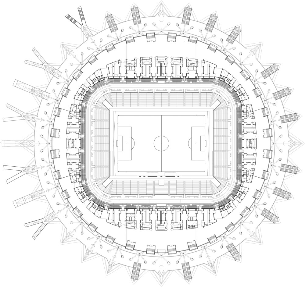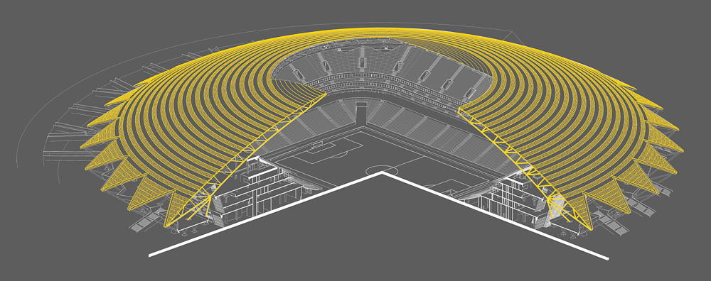 The stadium is for the 2018 world Cup in Russia. The exterior of the stadium is a dome. Lightweight, modern, high-tech metal frame supporting structures, forms the form of a cover-visor over the stands. The 330-meter-diameter dome, which is associated with the sky, refers to the space theme by its appearance, reminding that Samara is one of the Russian centers of space industry. The architectural image of the stadium is resolved in unity with the surrounding area. An innovative solution for distributing the flow of viewers to different client groups, as well as using terrain differences.