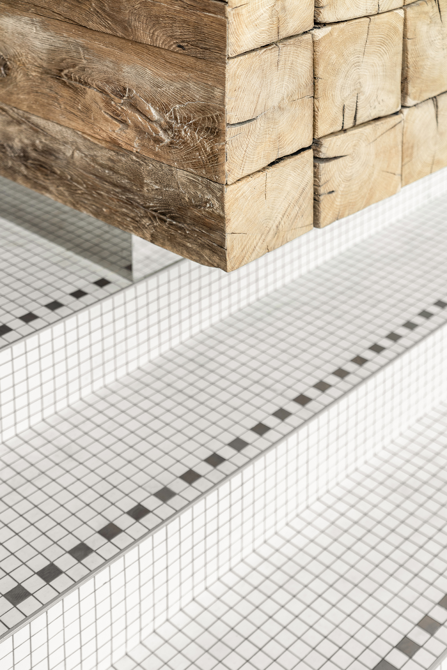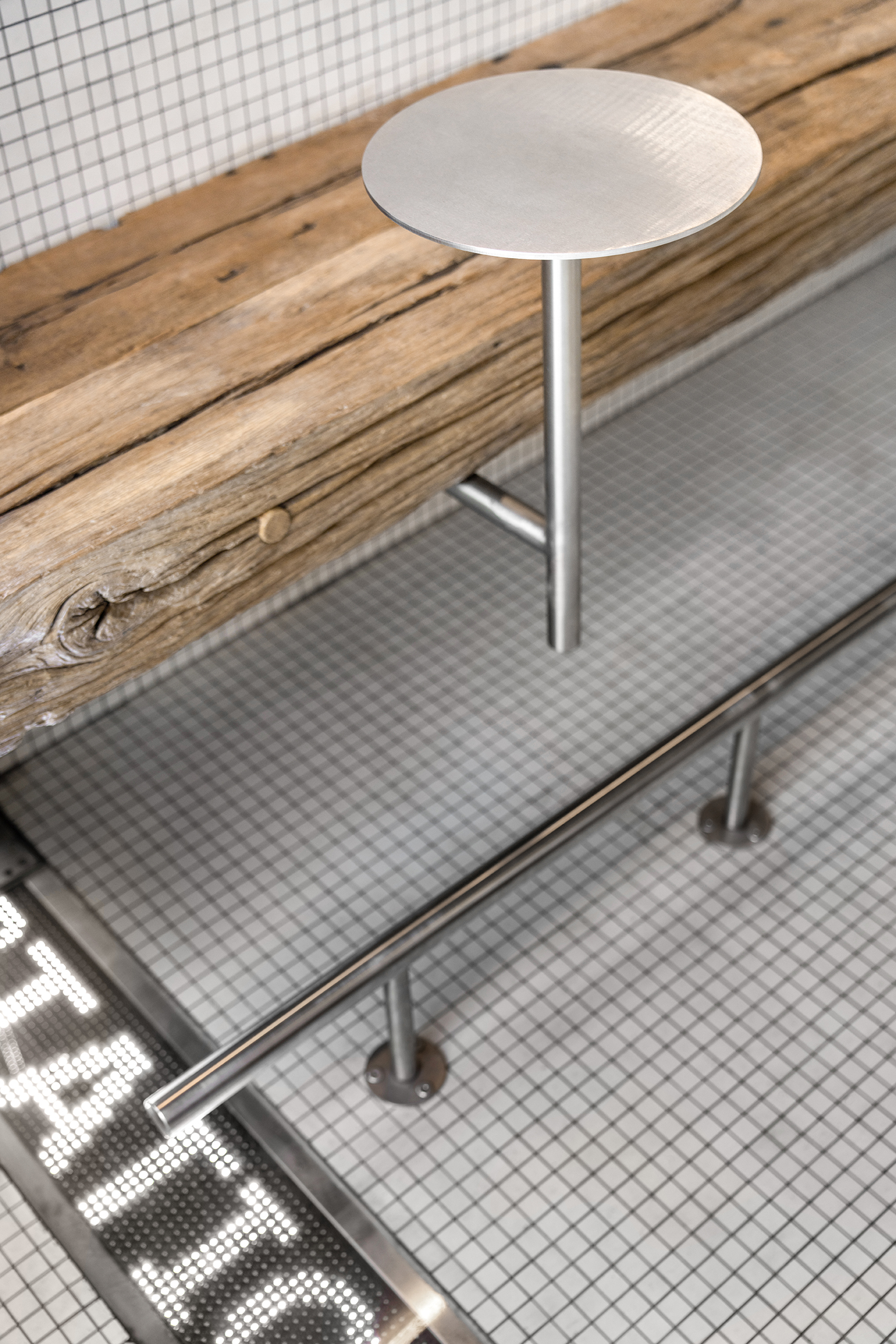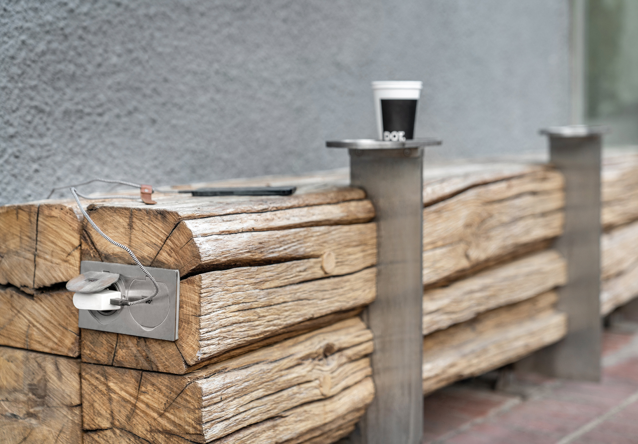 DOT Coffee Station has two little tables and a niche with a bench where a few guests can sit. Another seating place is the massive bench along with the building façade next to the café. The timber on both benches as well as on the counter is old beams that used to be elements of some barn a long time ago. It is a time-proven material that tells its own story and works as a contrast with the perfect and cold elements made of stainless steel.