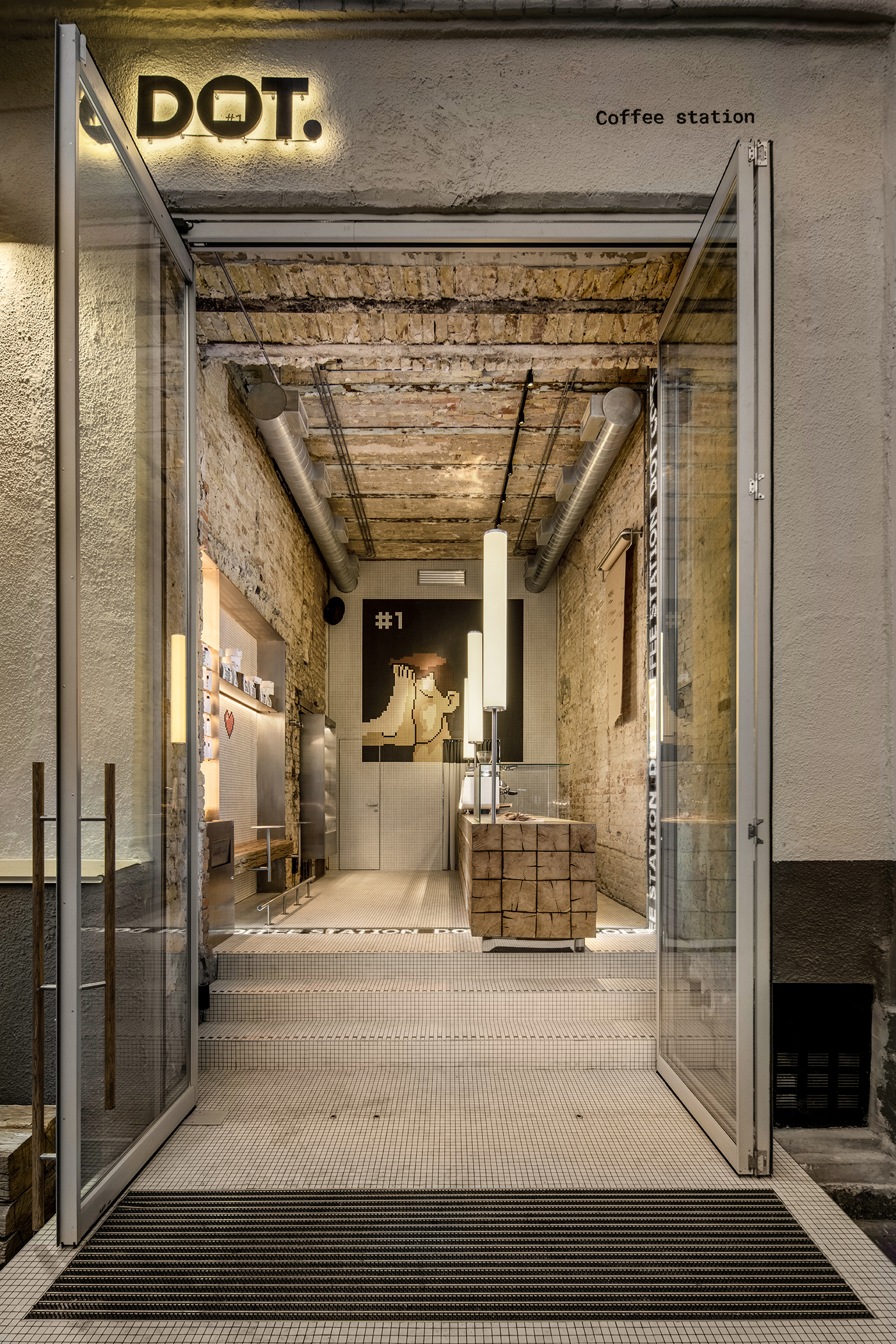 카페 내부의 계단과 벽면 일부는 픽셀 아트 요소가 가미된 흰색 모자이크 타일로 덮여 있다. 다른 벽면들은 1900년에 세워진 건물의 가치를 강조하는 맨 벽돌을 보여준다. DOT Coffee Station의 천장의 높이는 4.75m다. 빛으로 가득 찬 높은 공간을 확보해야 했기 때문에 처음부터 앉을 공간이 있는 메자닌층으로 짓겠다는 아이디어를 포기했다.