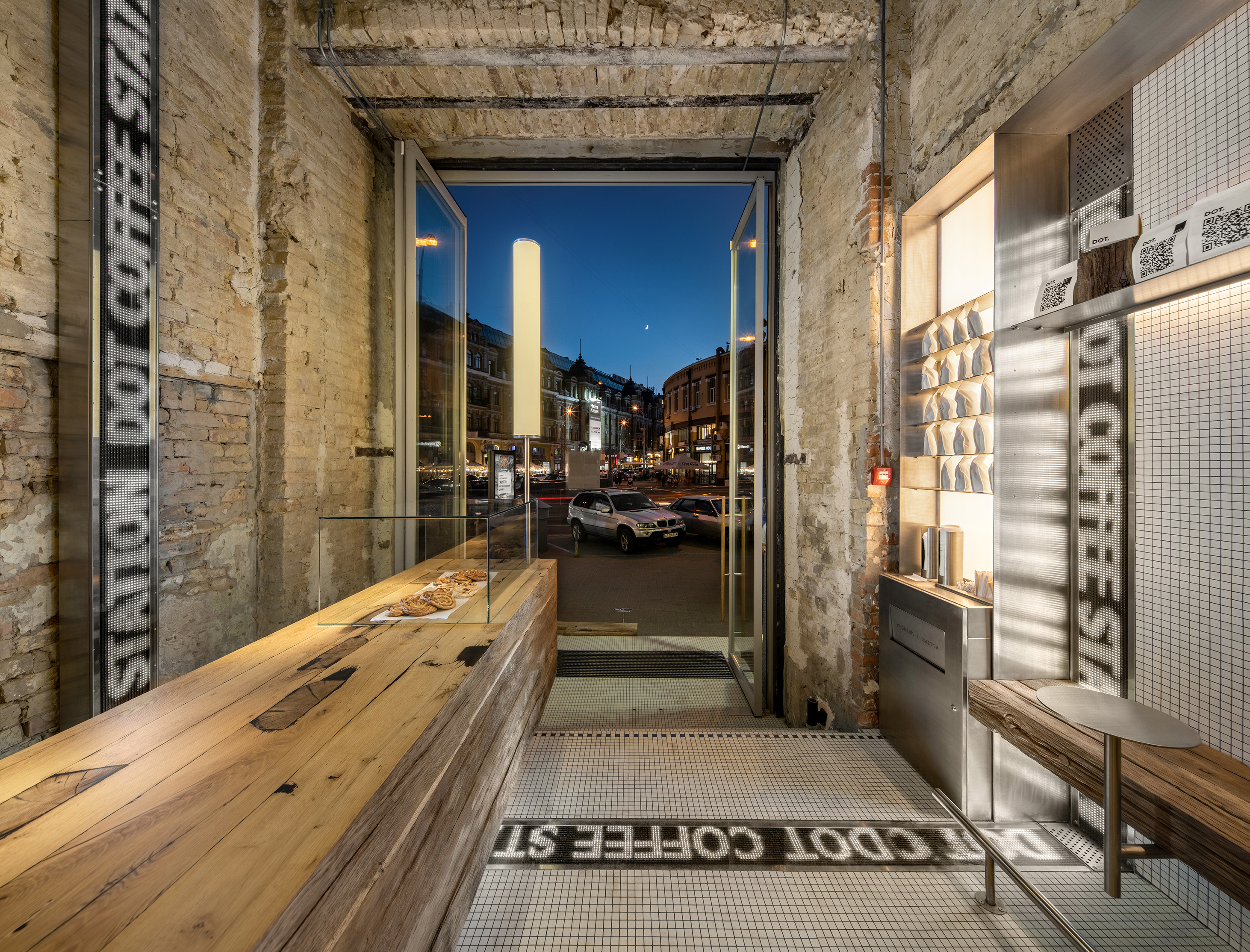 DOT Coffee Station #1 is a city café that is based in one of the most active neighborhoods in Kyiv and specializes in high-quality coffee drinks to go. The interior of the venue is a manifestation of modern city life. It is eclectic with a soft rhythm and an urban vibe.
