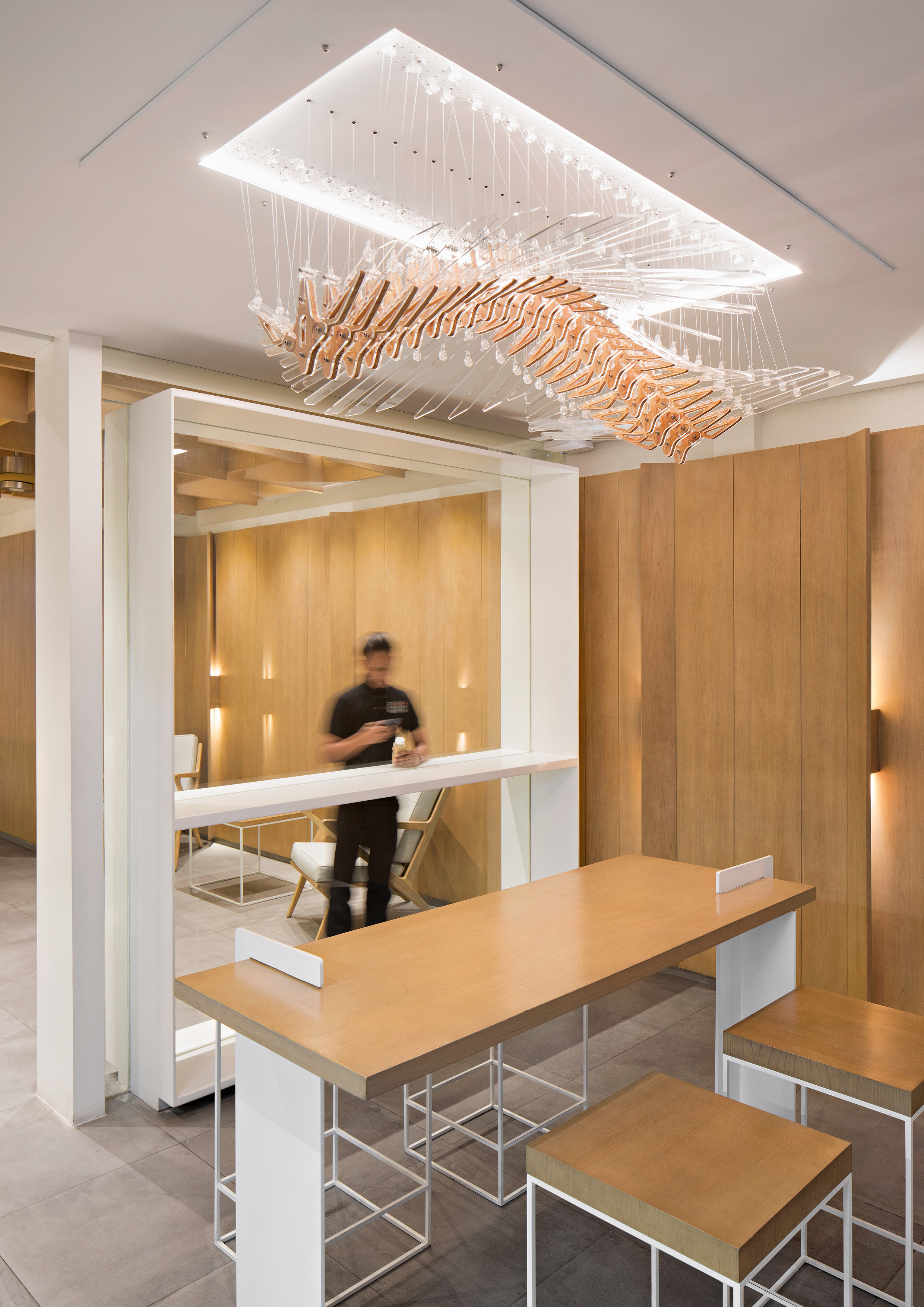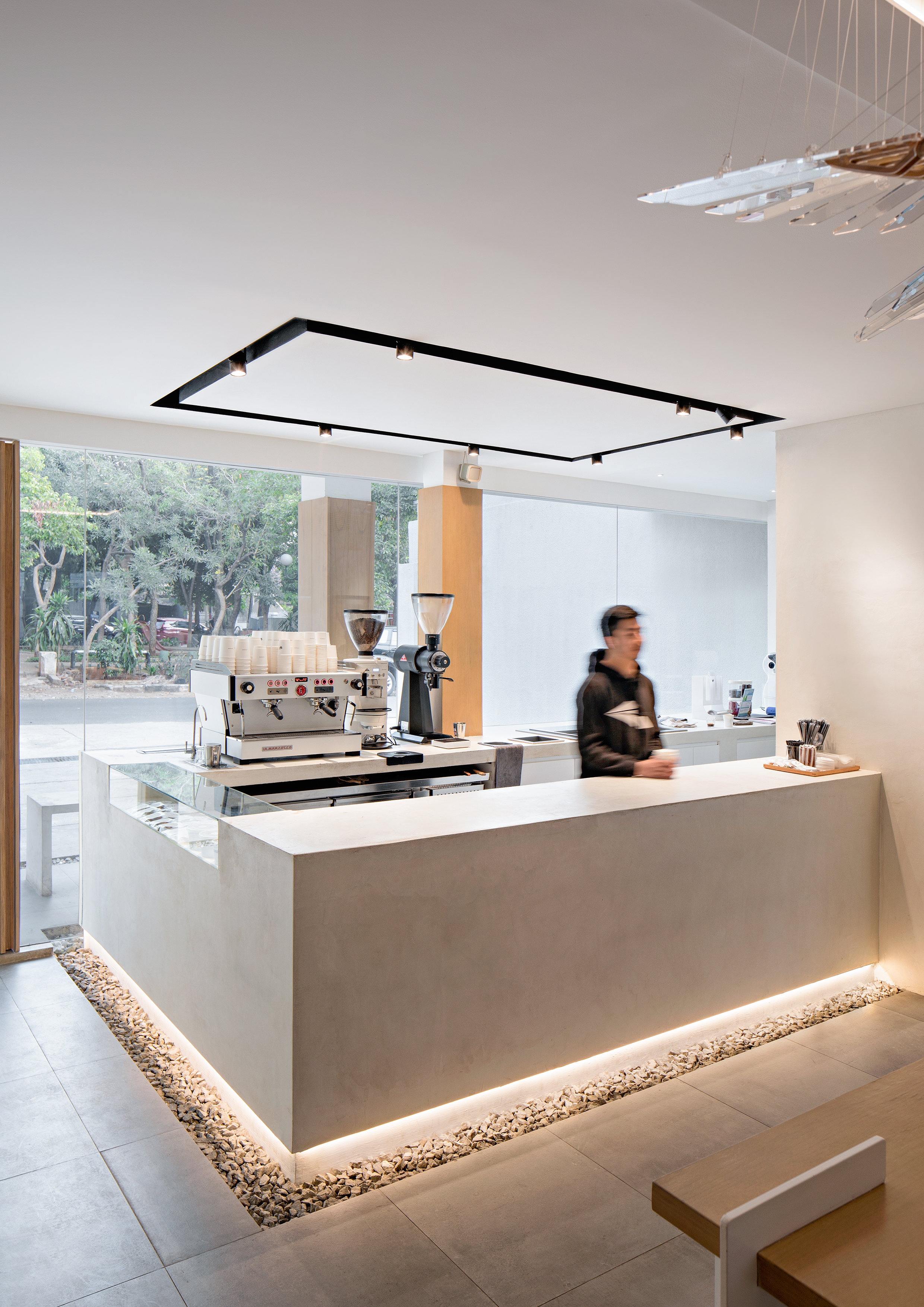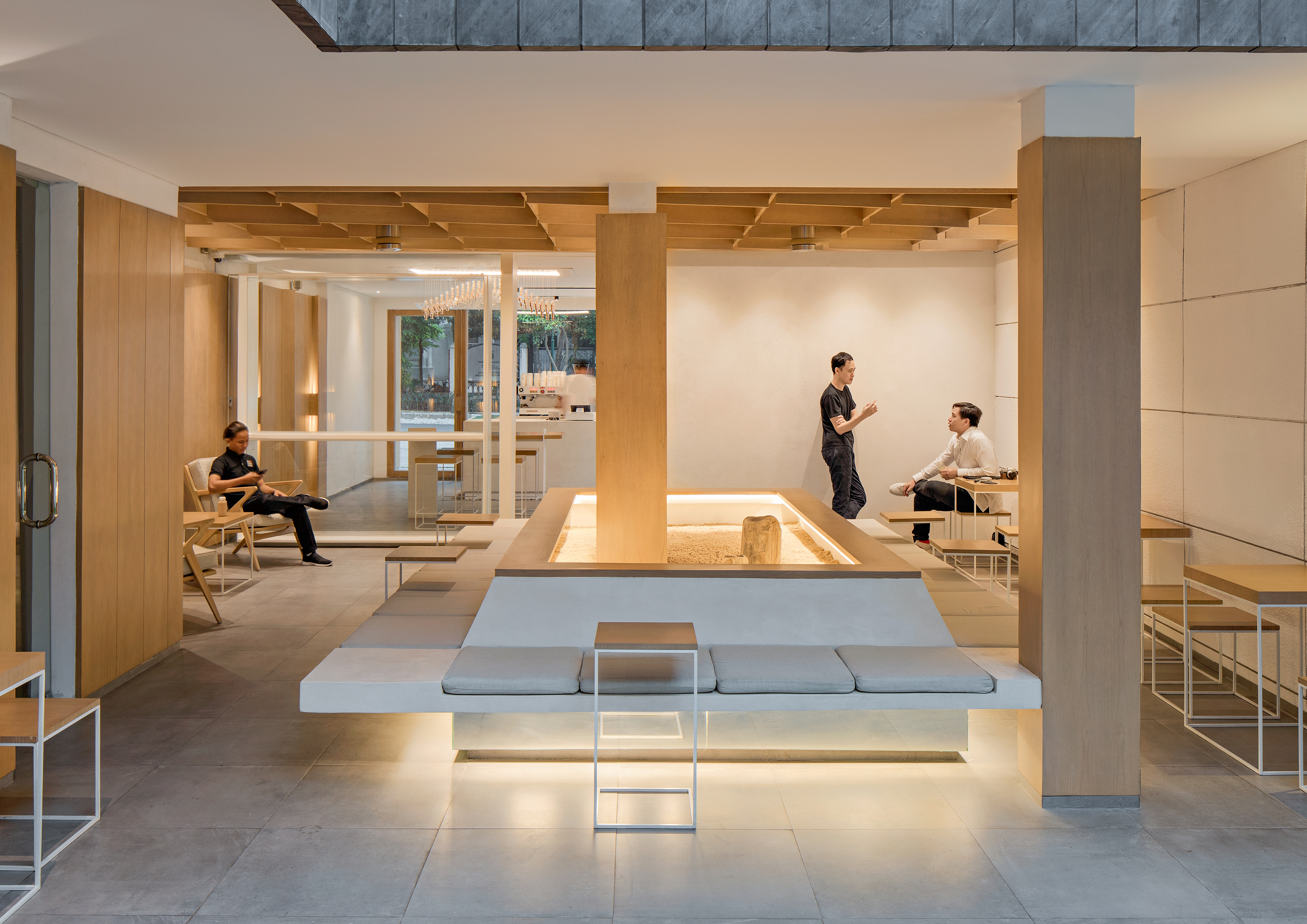 "빛과 매달림"의 건축 개념은 세심한 시공 디테일을 통해 구현된다. 흰색의 긴 커피 카운터는 조명이 둘러져 있고, 자갈로 인해 바닥에서 들어 올려져 떠있는 바 느낌을 준다. 앉는 공간 중앙의 텅 빈 젠 가든(일본의 정원 양식)을 중심으로 다양한 슬림 가구를 배치하여 전체 공간에 개방감을 부여한다. 좌석 공간의 벽과 천장은 기울어진 나무 판자로 처리되어 공간에 따뜻함을 가져다주고 독특한 평면 구성을 만든다.