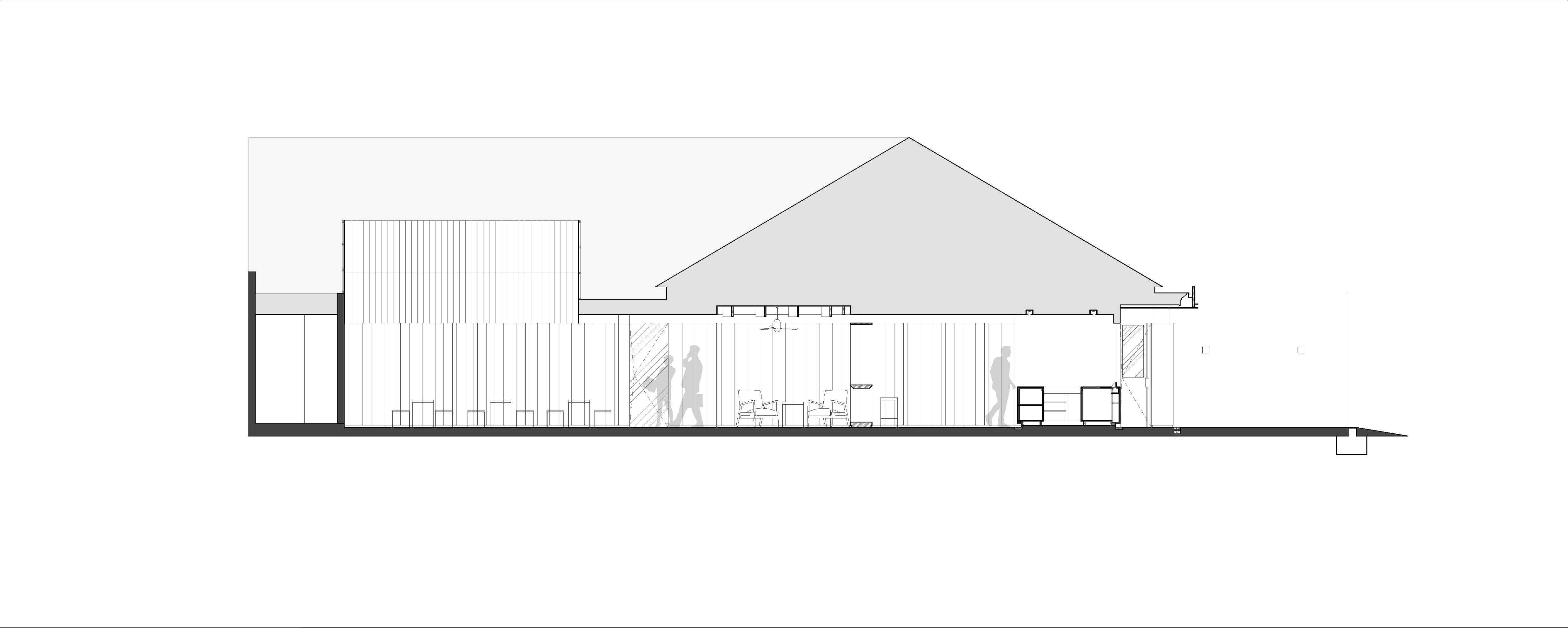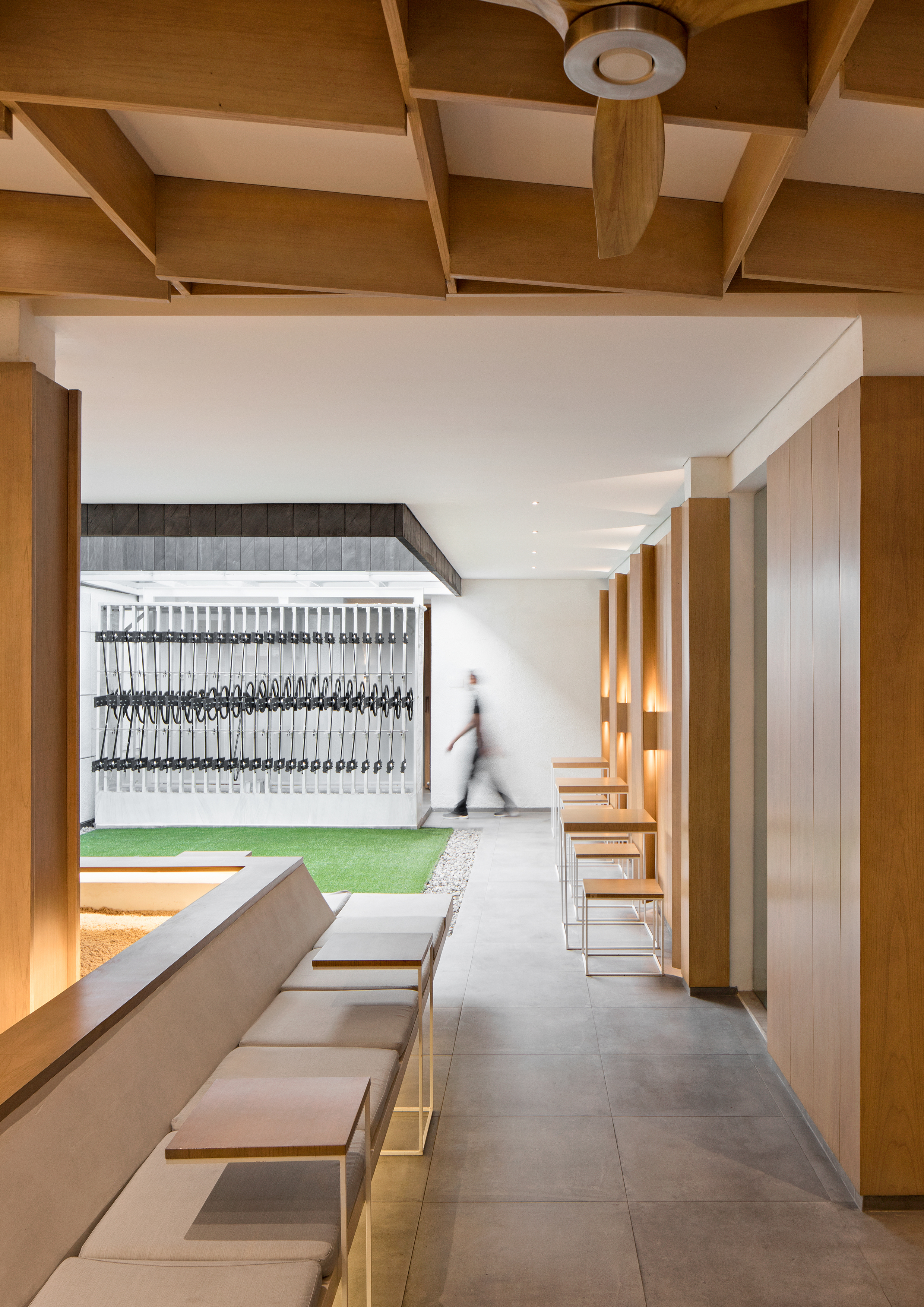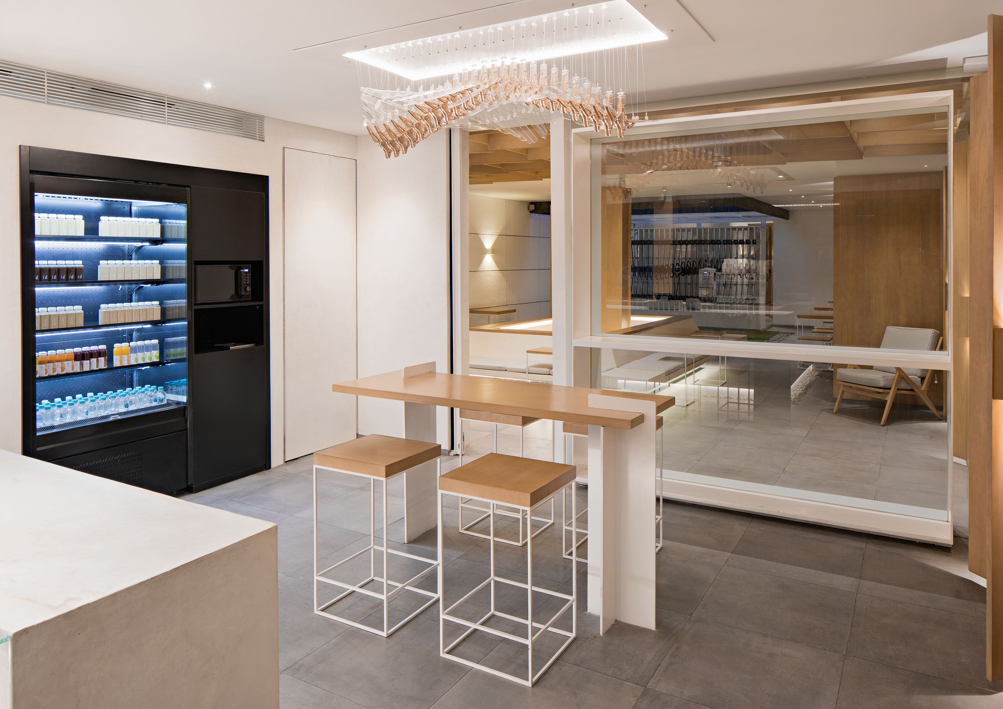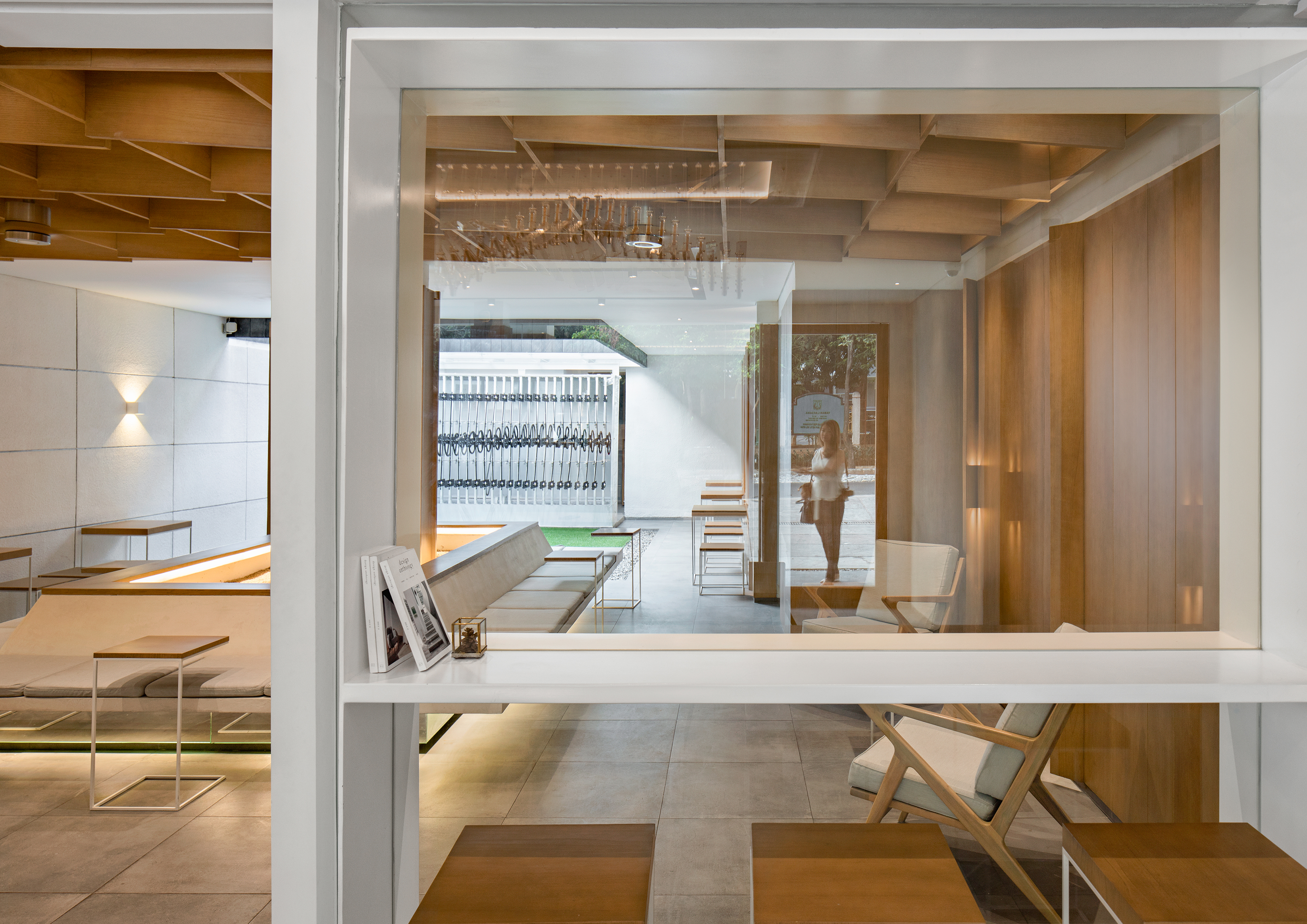 "빛과 매달림"의 건축 개념은 세심한 시공 디테일을 통해 구현된다. 흰색의 긴 커피 카운터는 조명이 둘러져 있고, 자갈로 인해 바닥에서 들어 올려져 떠있는 바 느낌을 준다. 앉는 공간 중앙의 텅 빈 젠 가든(일본의 정원 양식)을 중심으로 다양한 슬림 가구를 배치하여 전체 공간에 개방감을 부여한다. 좌석 공간의 벽과 천장은 기울어진 나무 판자로 처리되어 공간에 따뜻함을 가져다주고 독특한 평면 구성을 만든다.