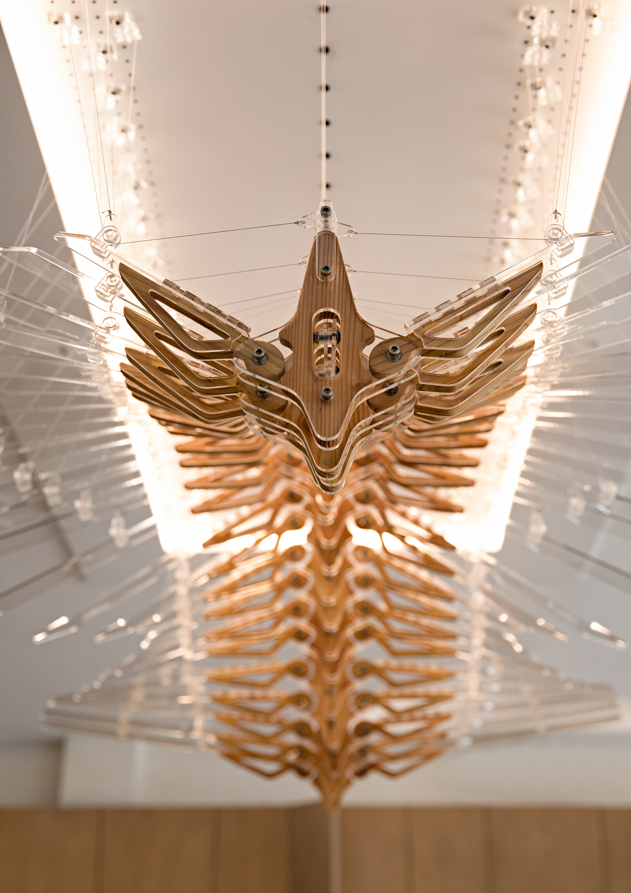A kinetic installation is hung above the coffee bar to represent the crow of the Kisaku logo and bring a slow and hypnotizing dynamism into the room. The installation is composed of 25 moveable bone-shape wood frames and thin acrylic wings, suspended from the ceiling with thin wires. The steel wires are connected to individually controllable motors that raise and lower the ends of each lamella, allowing various “flying” movement patterns to be performed.