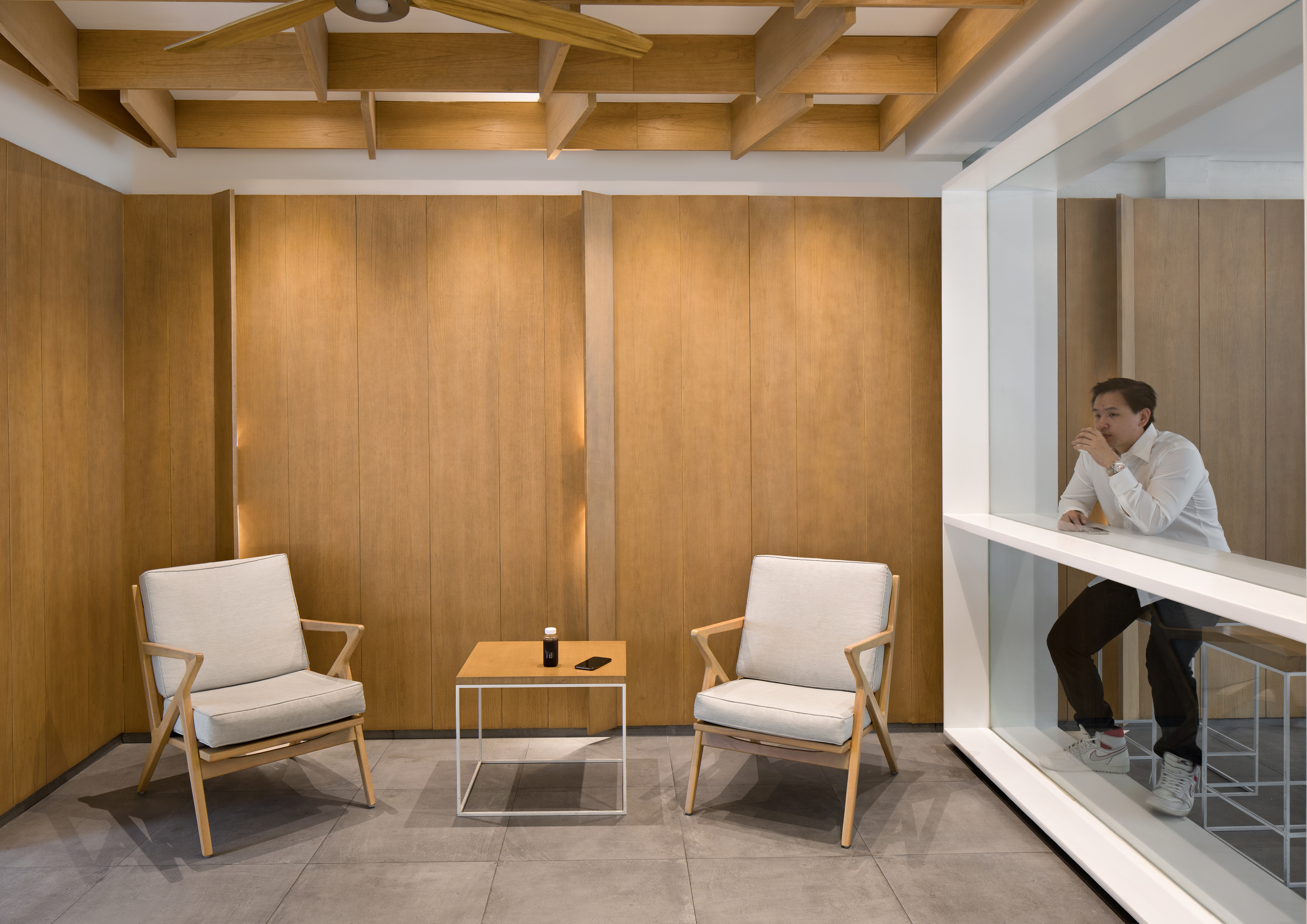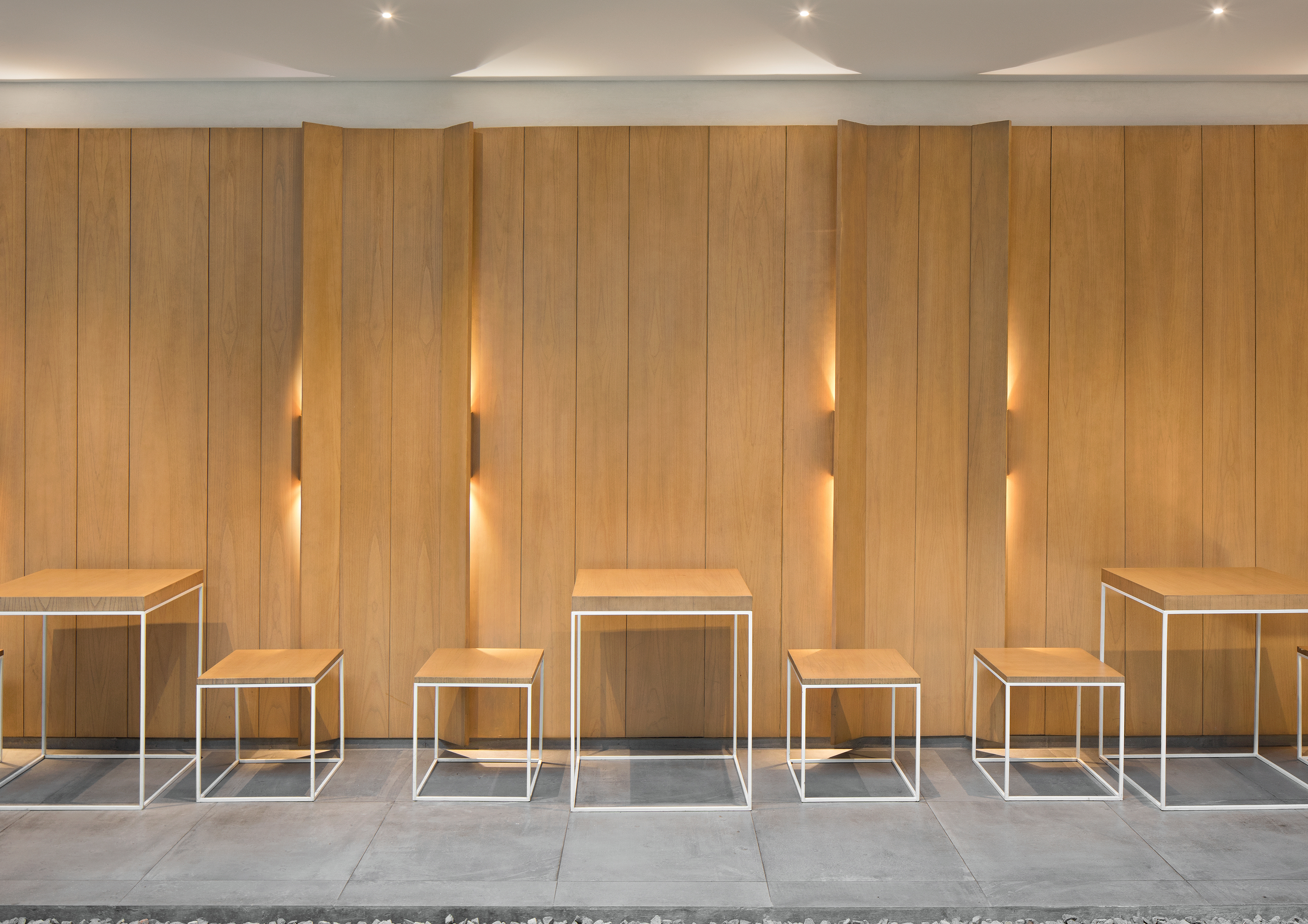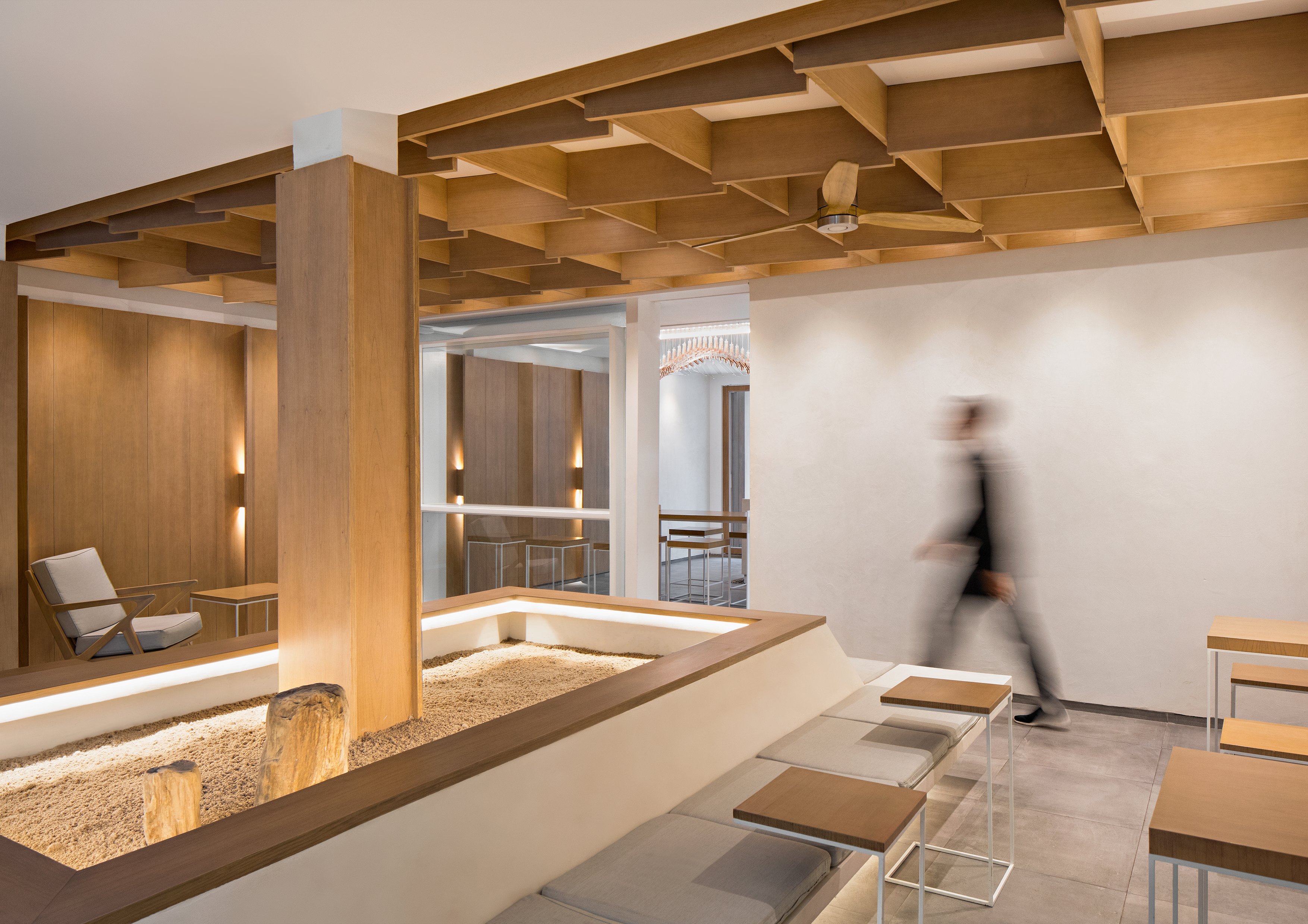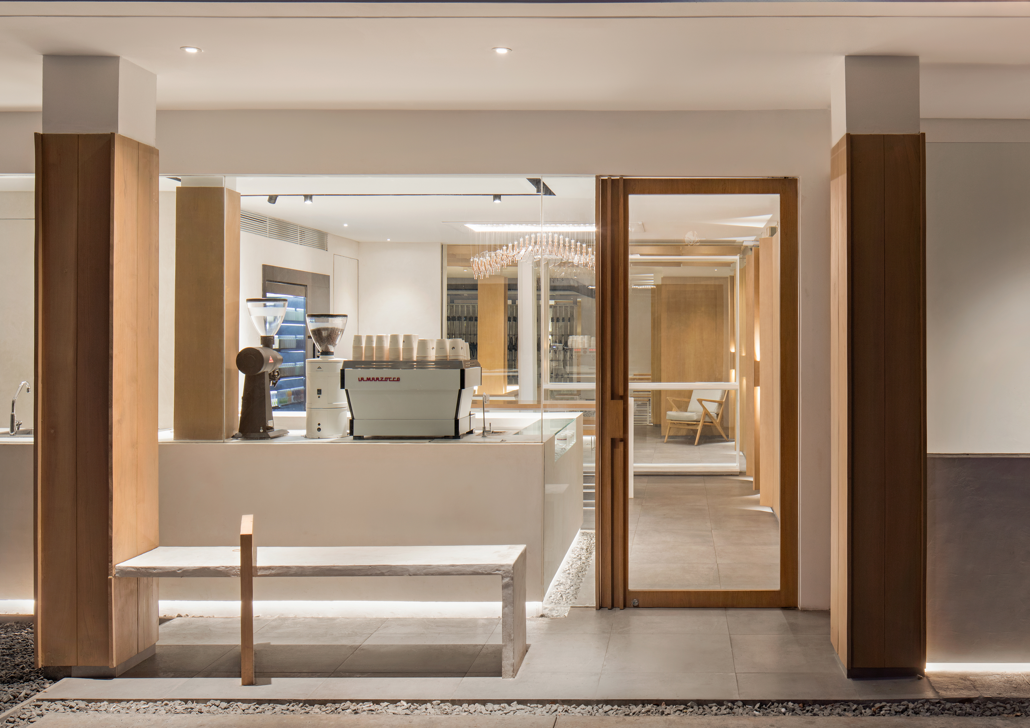 “Light and hanging” architectural concept is actualized through meticulous construction detail. Long white coffee counter was lifted up from the ground with illuminated skirting and pebbles to create the feel of a floating bar. Various slim furniture are placed around an empty Zen garden at the center of the sitting space to create an openness throughout the whole area. The wall and ceiling of the sitting area is treated with tilted pieces of wood plank to bring warmth into the space and create a unique thin plane composition.