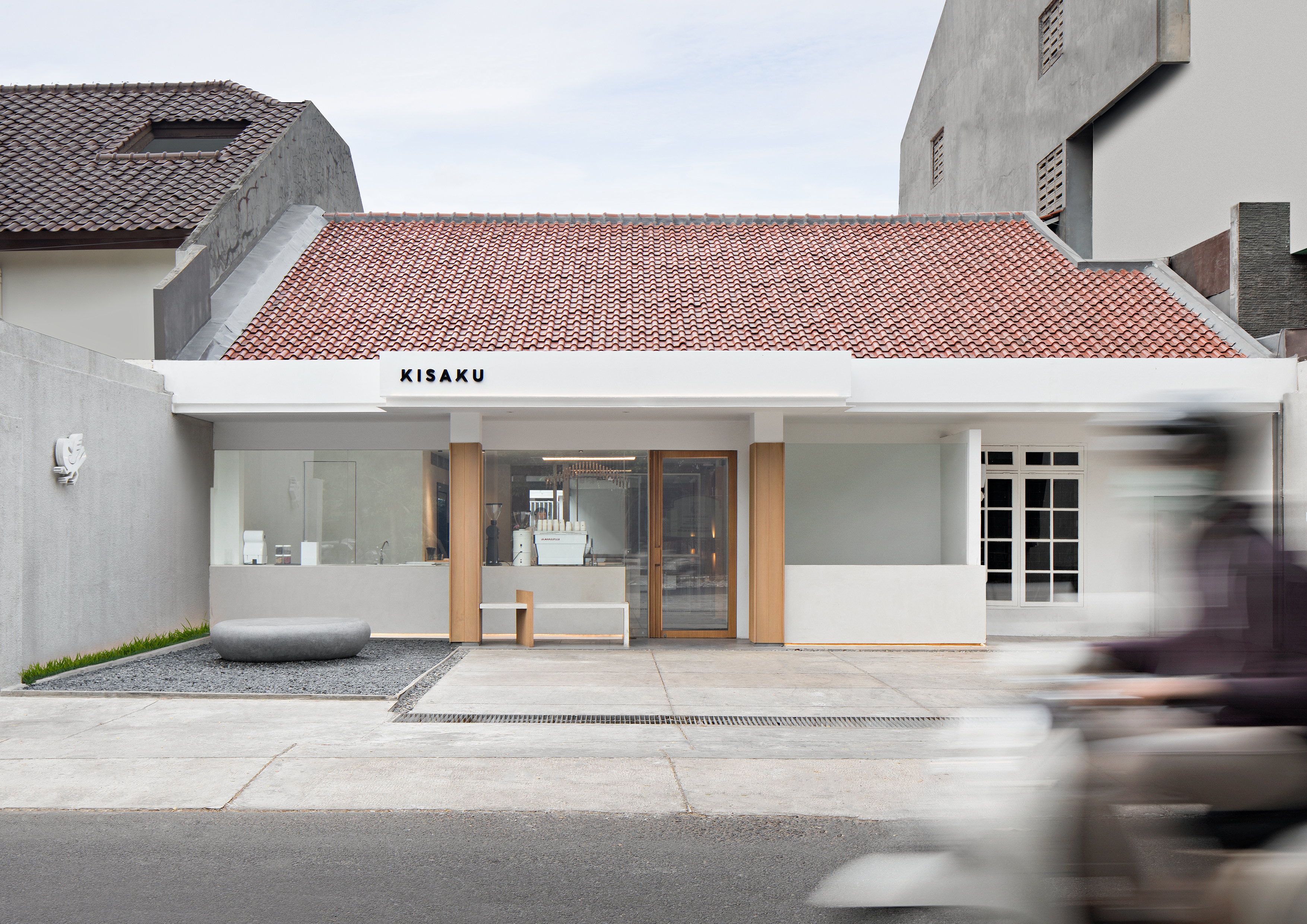 Kisaku is a coffee and social space located in the heart of Jakarta business district, a fairly dense environment, with a target market of workers. The place is a manifestation of adaptive reuse of an old and humble one storey residential house into an open and welcoming coffee shop. Kisaku emerged as an oasis in the middle of the crowded metropolitan city, focusing on coffee-to-go sales and serves as a pleasant space for contemplation during the day and social space after office hours.