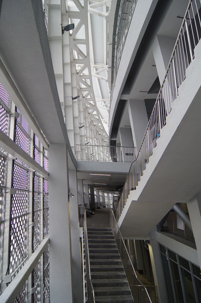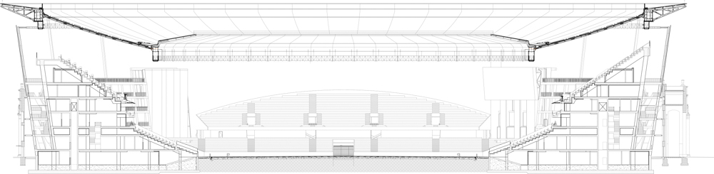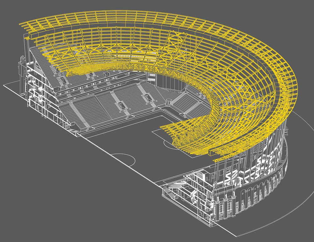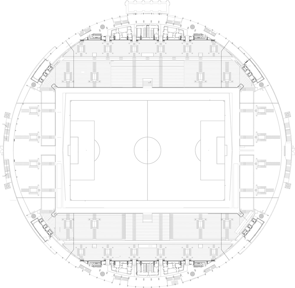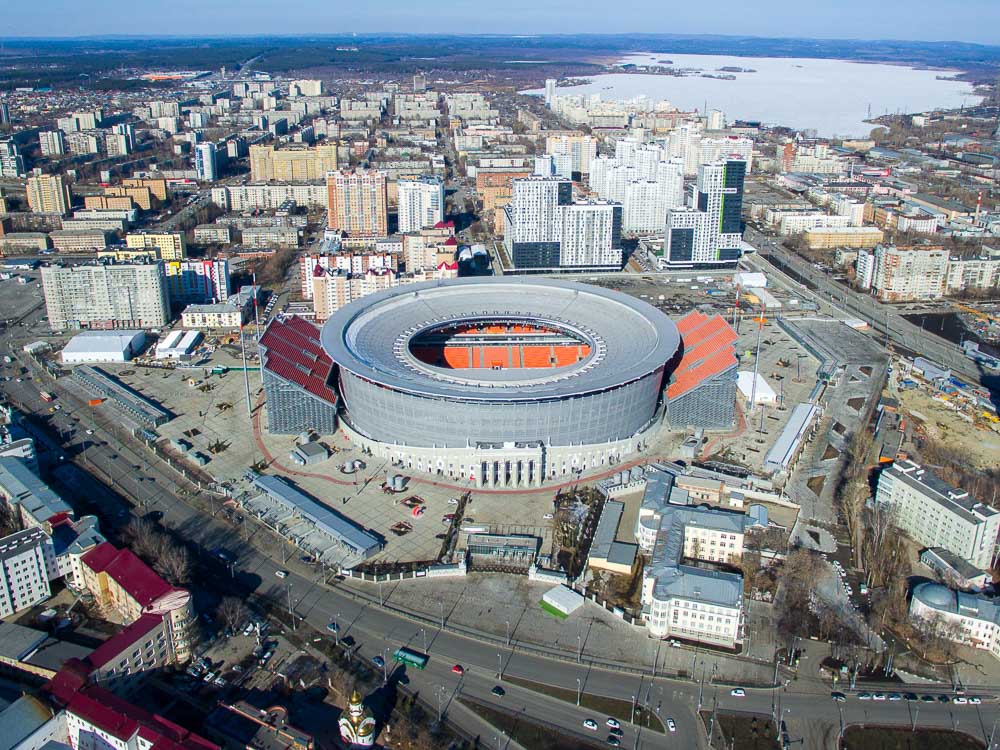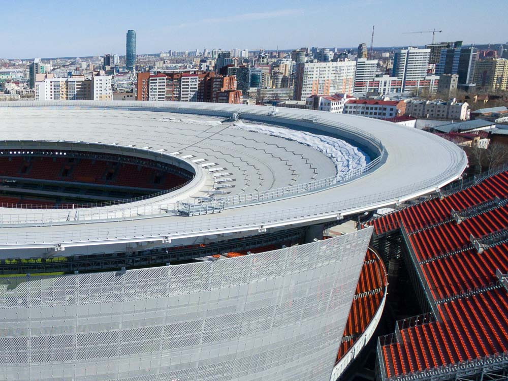 2018 러시아 월드컵에 맞춰 세워진 예카테린부르크 축구경기장은 문화유적지 ‘첸트랄니 스타디움’이 재건축된 것이다. 1954년의 역사적 가치를 지닌 성벽을 보존하고, 복원하면서 현 시대에 맞는 운동 경기장과 결합하는 것이 중요한 프로젝트였다. 예카테린부르크 경기장 정면 파사드에는 “시대 중립적인” 구조물이 드러나면서, 이 공간이 가진 역사를 지켜보게 만든다. 서쪽과 동쪽에는 역사 벽과 새로운 중심부 사이에 관객들의 출입구 역할을 하는 일종의 아트리움 공간(열린 갤러리)이 있고, 여기서부터 연속된 계단을 통해 자리로 이동하기 시작한다. 새로운 공간의 전면에는 타공판으로 만들어진 패널이 나열되며, 이러한 공간의 분할은 스타디움이라는 대형 경기장을 실제 크기보다 작게 보이게 만들어 친숙한 공간으로 느끼게끔 한다. 역사, 지속성, 혁신이라는 단어 아래 정의되는 예카테린부르크 아레나는 현대적 스포츠 경기장의 새로운 지표가 된다.