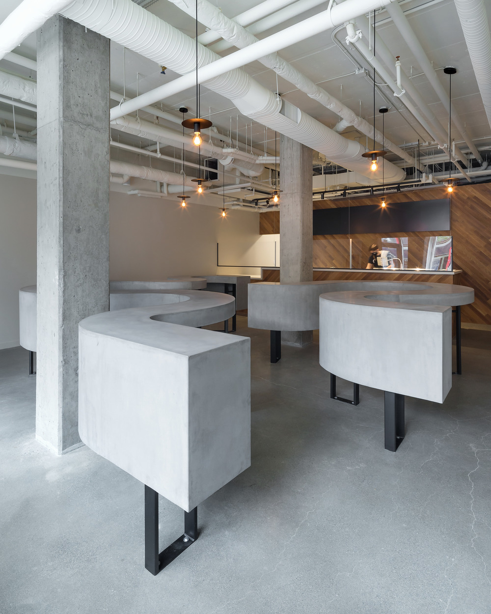 The pared-back simplicity of the interior consists of stripped-back concrete floors, exposed concrete columns, concrete ceiling, mechanical ducts, and conduits. Painted acoustic wall panels combine a uniquely rough-textured appearance with unusual durability and acoustic performance. The simplistic interior yields attention to a single architectural intervention. A 56’-0” long serpentine table floats its way through the space.