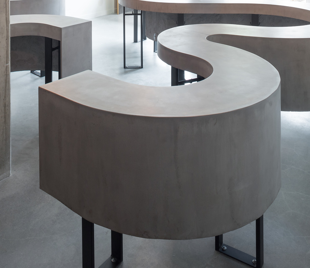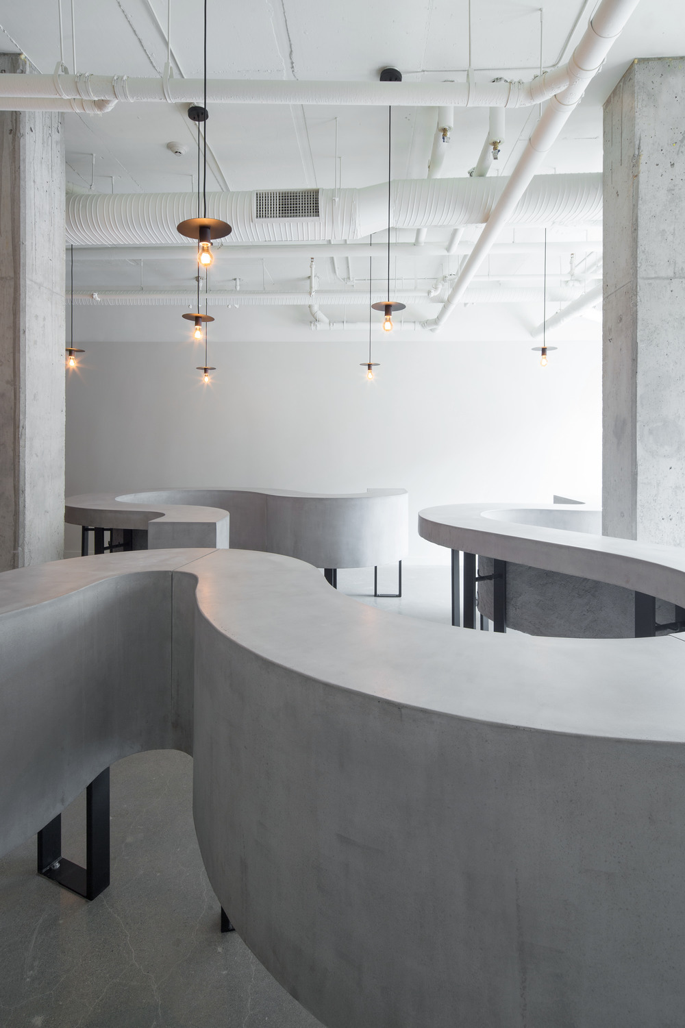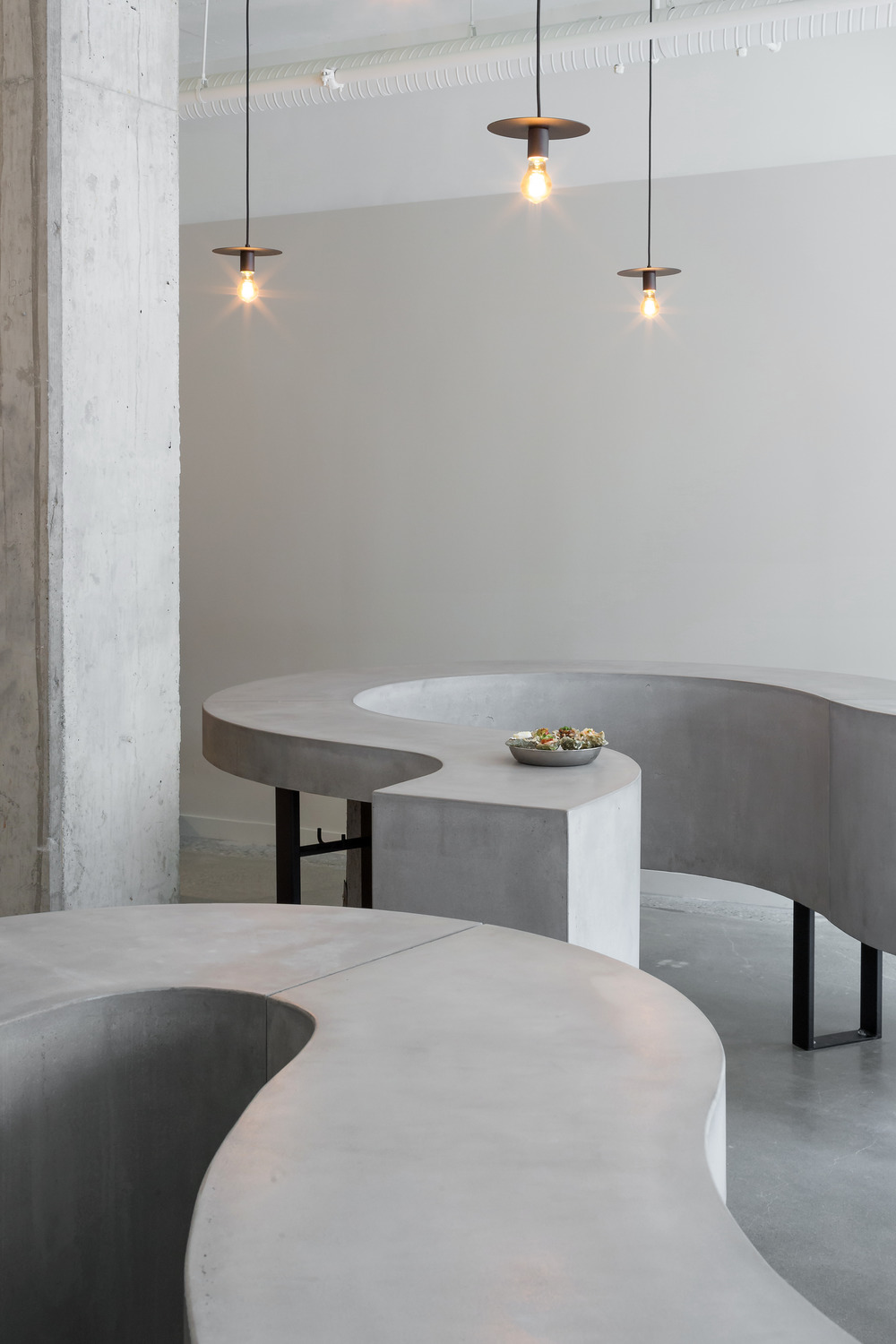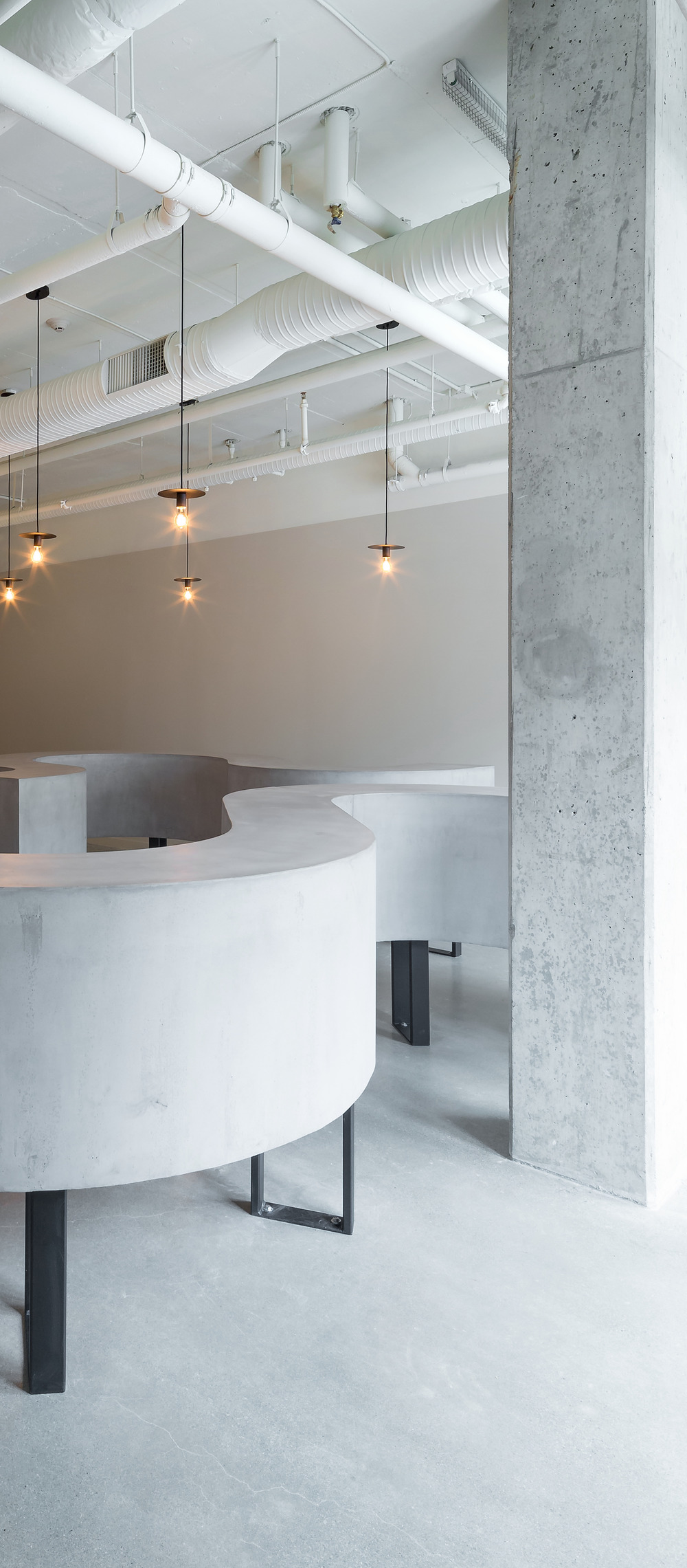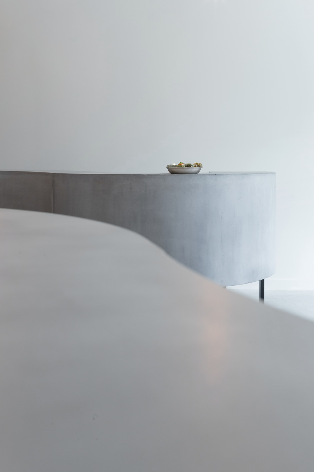 섬유로 보강된 프리캐스트 콘크리트 테이블은 캐주얼한 "바 탑"의 상호 작용 특성과 사람을 감싸는 "부스"의 친밀함과 감싸는 관계 사이를 중재한다. 입식 레스토랑으로서, 손님들 사이의 순환과 상호작용은 사람들이 다양한 방법으로 연결될 수 있는 매우 사회적이지만 긴밀하게 개인적인 환경의 장소 만들기를 재정립하기 위해 통제되었다. 고객이 테이블에 서 있는 위치에 따라 개인의 공간 감각과 다른 사람과의 상호 작용 수준이 달라진다.