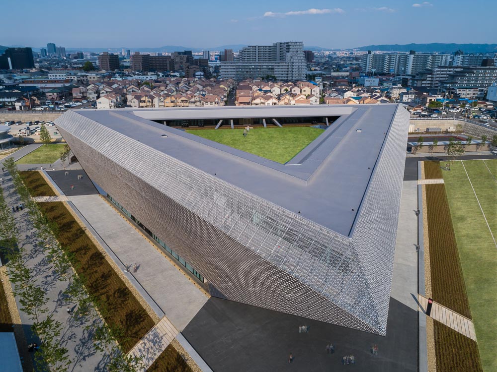 Located in the leafy city of Ibaraki in northern Osaka Prefecture, this project forms the core of the Ibaraki Smart Community, which occupies the 185,000㎡ site of a former Toshiba factory. The 40,000㎡ facility will serve as a new campus for about 3,600 students at Otemon Gakuin University, or about half the student population.