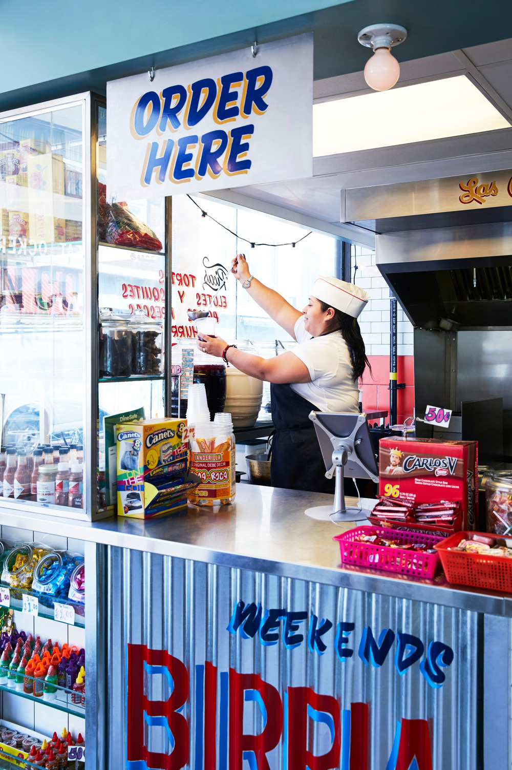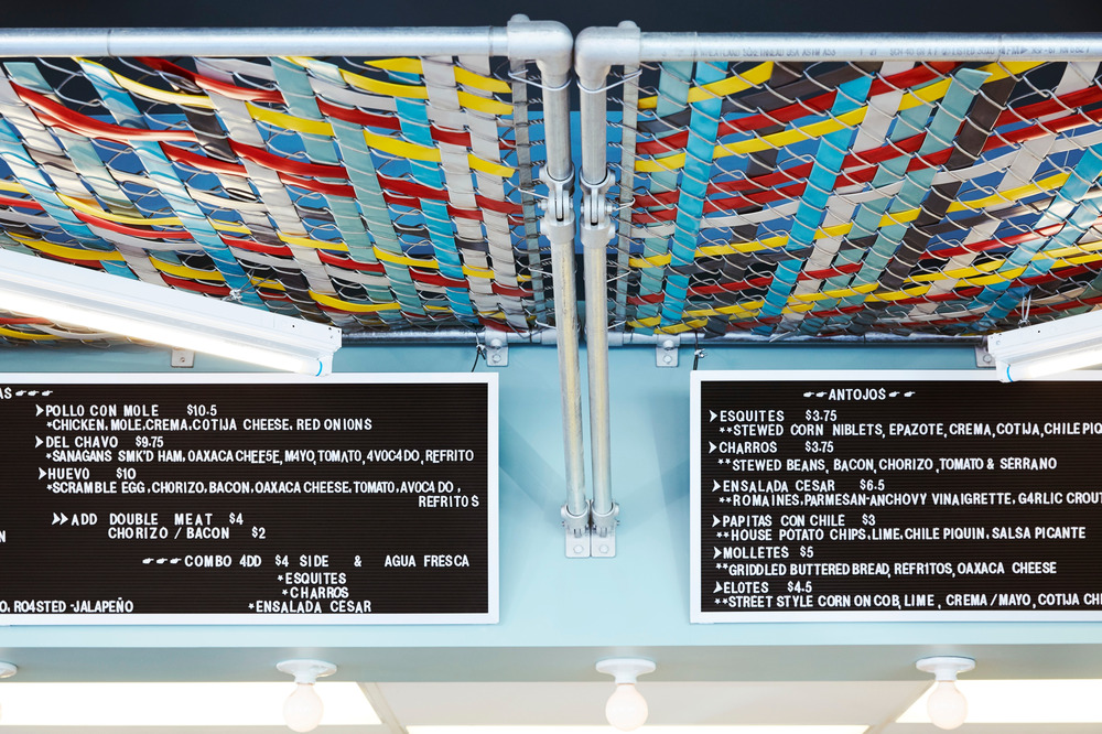 Riffing on this idea of a space within a space, Tong designed the awning to mimic the structure of a traditional puesto (street food stand.) The awning is made industrial nylon strips weaved by hand through chainlink fencing. Underneath, the take-out counter, which doubles as spot for diners to eat their tortas (Mexican sandwiches), is peppered with hand-painted signage by Hamilton-based artists BrushBoys.