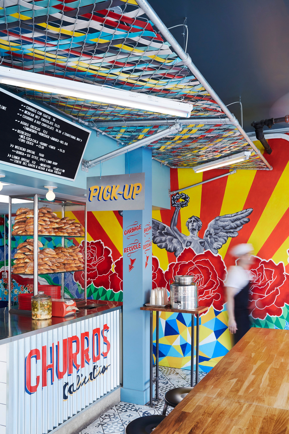 카운터 높이의 테이블 위에 대각선으로 매달려 있는 형광등도 멕시코 식품 시장에서 영감을 받았다. 이러한 시장은 주변 조명이 어둡기보다는 밝게 빛난다. "공간의 따뜻함은 색상과 질감에서 나온다."라고 디자이너는 설명한다. 패턴이 있는 파란색과 흰색의 바닥 타일은 전통적인 스페인 타일을 현대적으로 재해석한 것이다. 이 타일은 벽화와 빈티지 느낌의 간판, 직조 천막과 개방형 주방에 전시된 다채로운 재료에 이르기까지 공간 전체에 걸쳐 다양한 색상을 제공한다.
