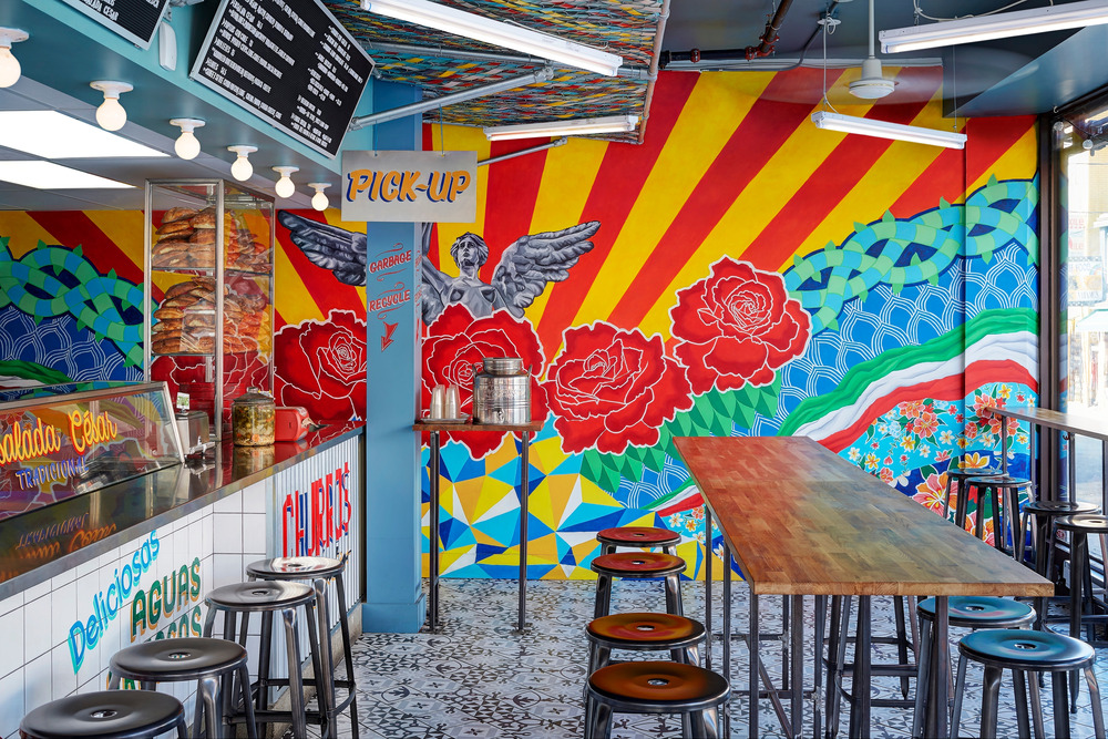 Torteria San Cosme에 들어서면 색상의 불협화음에 압도된다. 패턴 타일과 손으로 그린 간판은 전체 벽을 덮고 있는 생생한 대형 벽화와 완벽하게 충돌하고, 테이크아웃 카운터 위에는 다양한 색상의 웨빙 캔틸레버 차양이 있다.
