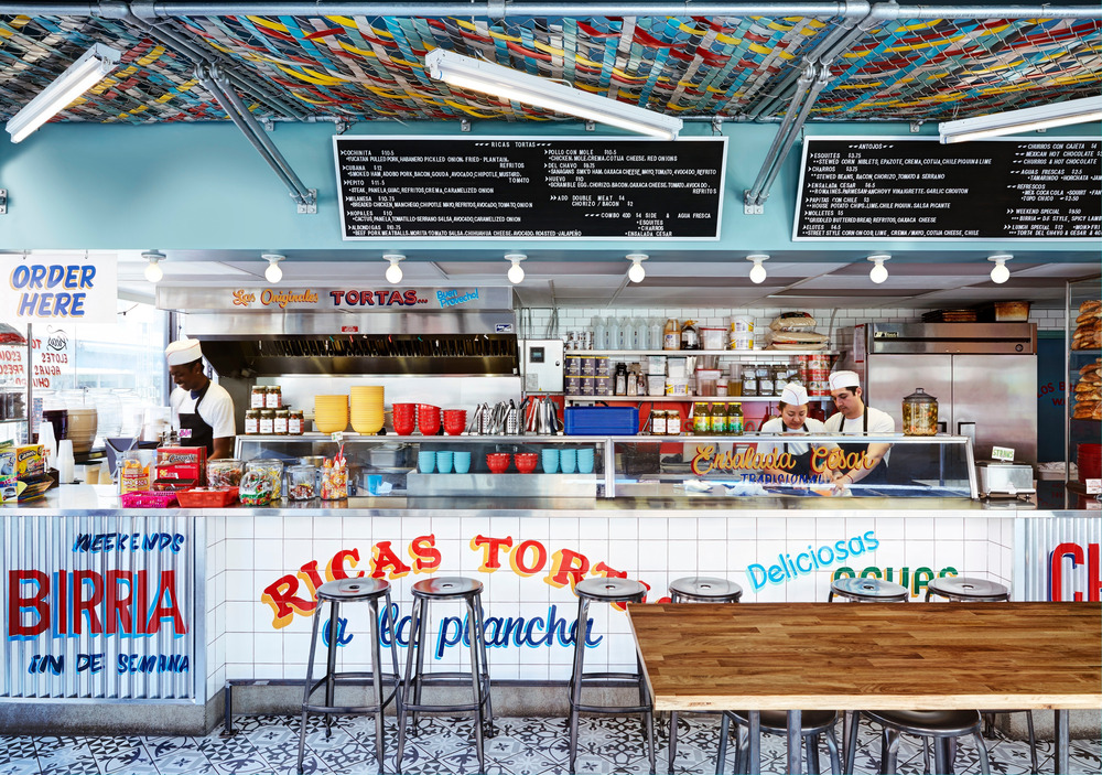 Principal designer John Tong worked closely with his client Arturo Anhalt to bring his childhood memories of Mexico into the 700-square-foot space. With this objective in mind, Torteria San Cosme evokes the vibrant colour, playfulness and authenticity of Mexican street food stands.