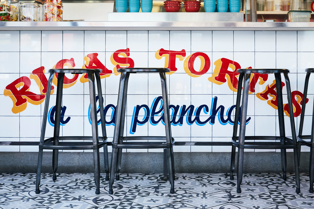 Walking into Torteria San Cosme, you’re immediately struck by a cacophony of colour. Patterned tiles and hand-painted signs perfectly clash with a vivid large mural covering an entire wall, while an awning of multi-hued webbing cantilevers over the take-out counter.