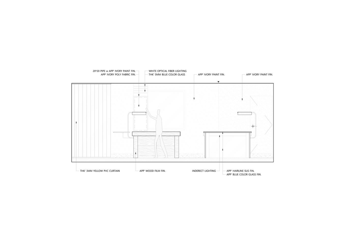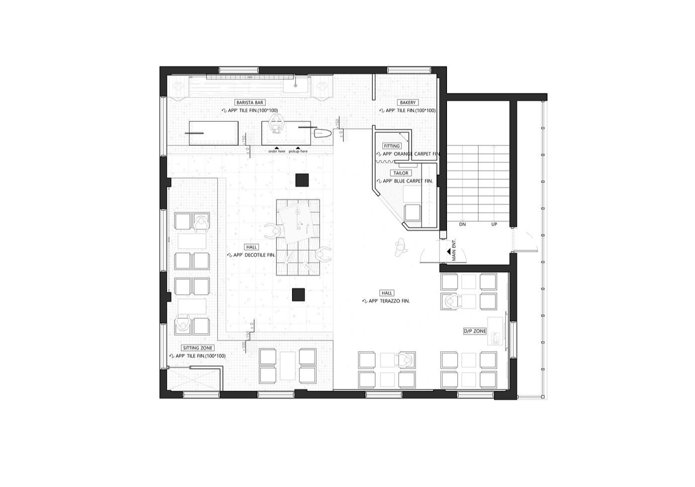 과거의 회상을 현대적으로 재해석함에 초점을 두었던 프로젝트였기에 다양한 컬러와 다양한 마감재들로 공간을 구성하고 재봉테이블, 다리미, 그리고 알록달록한 다양한 패턴의 옷감들과 살타래들이 눈을 즐겁게 한다. 가장 포인트가 되는 마감재로는 원색의 체크패턴 원단을 입니다. 사람이 다양한 원단을 이용해 만들어진 옷을 입는 것은 당연하고 익숙하기에, 마찬가지로 공간에도 다양한 체크패턴을 활용한 원단을 입혀주고 싶다는 의도로 선택된 마감재였다. 또한 외/내부 통틀어 다양한 컬러 밧줄을 활용하여 마치 정말 한 딴 한 땀 재봉이 되어 공간이 만들어진 것 같은 느낌을 표현하고 싶었고, 그런 점이 가장 극적으로 돋보이는 섹션은 파사드이다. 컬러 밧줄을 통해 ‘재봉’이라는 특성을 공간 전반에 적용시키는 통일성은 내부에서도 이어진다. 바리스타 작업대, 기둥 벽 마감, 테일러존 창문틀 등 공간 곳곳에서 밧줄을 활용한 디테일을 볼 수 있다.