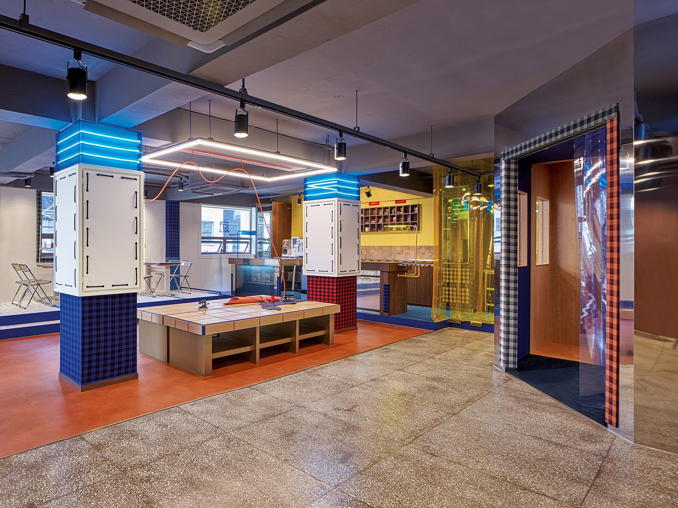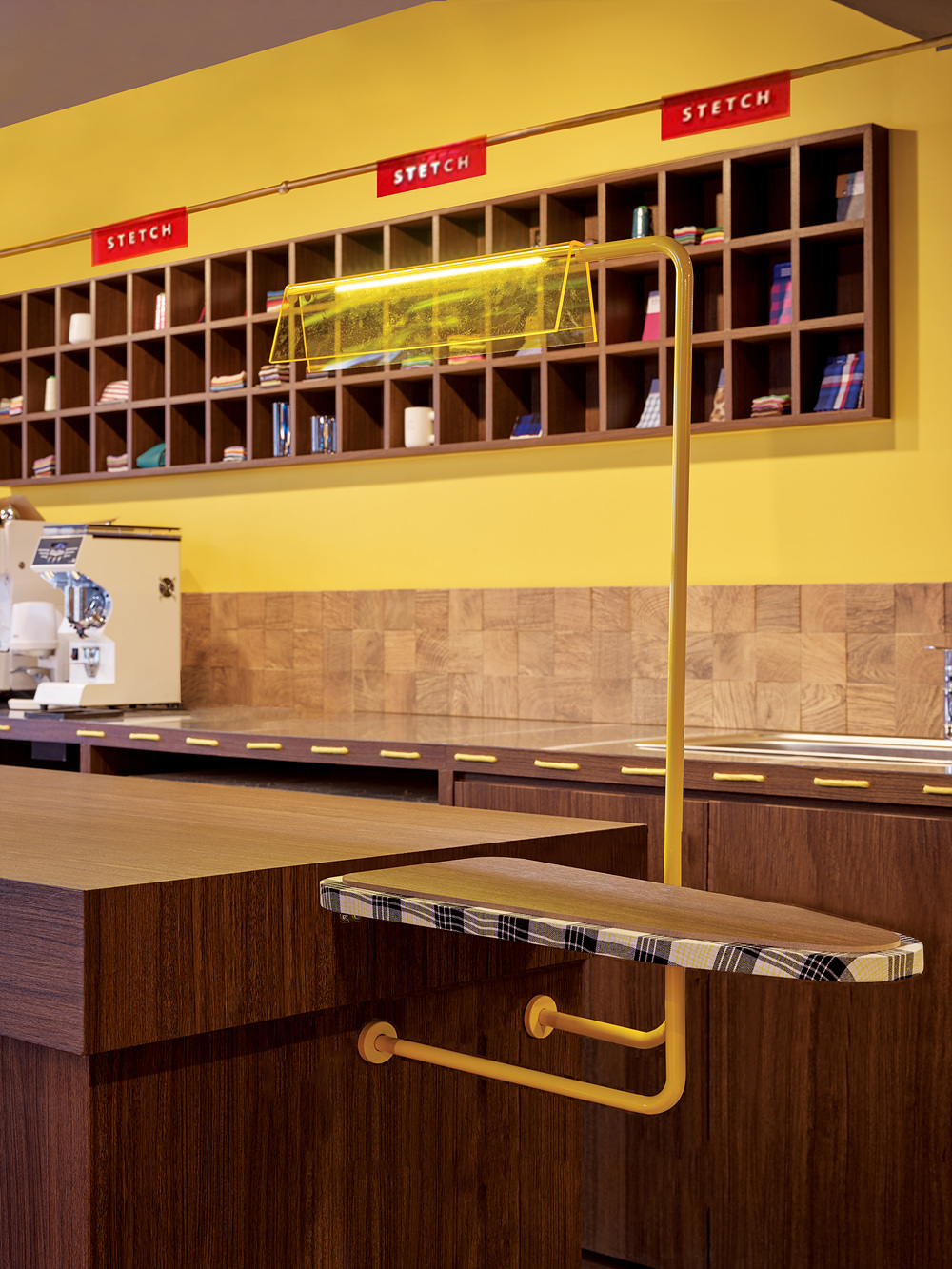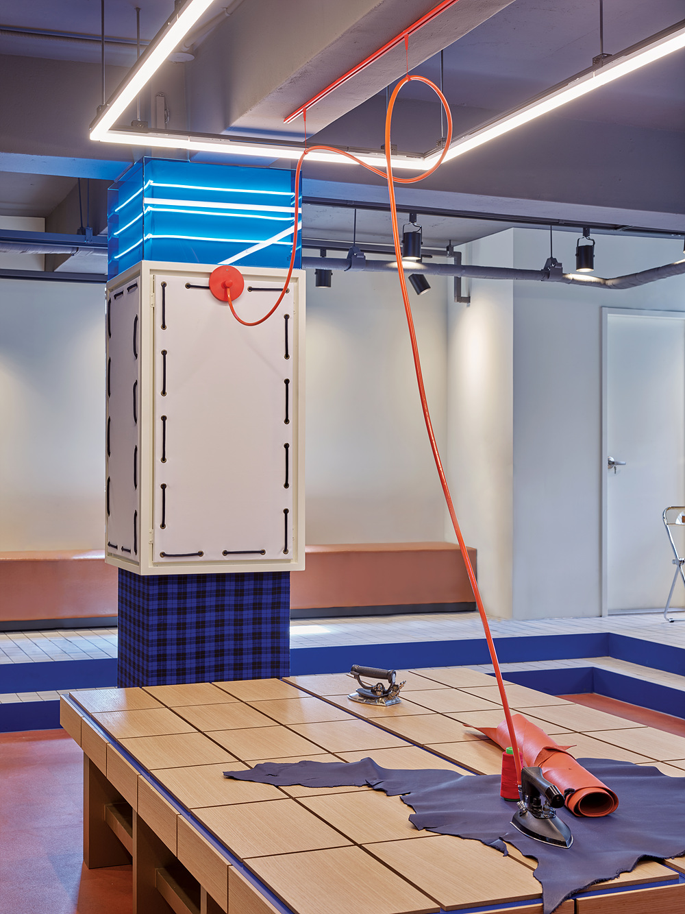 그 밖에도 원색의 노란색 도장으로 마감한 바리스타바 전면 벽이나 블루, 오렌지 바닥타일처럼 컬러가 들어간 모든 마감재가 ‘현대적으로 재해석된 과거의 회상’이라는 디자인 의도를 뒷받침해주고 있다. 공간의 가장 가운데에는 과거의 재봉사들이 넓고 낮은 재단판에 둘러앉아 다림질, 박음질을 하는 모습에서 영감을 받아 만들어진 재단판 시팅존이 있습니다. 재단판을 모티브로 만들어진 가구임을 여실히 보여줄 수 있는 요소로 러프하게 가죽 원단들과 다리미를 함께 디스플레이 하였다.