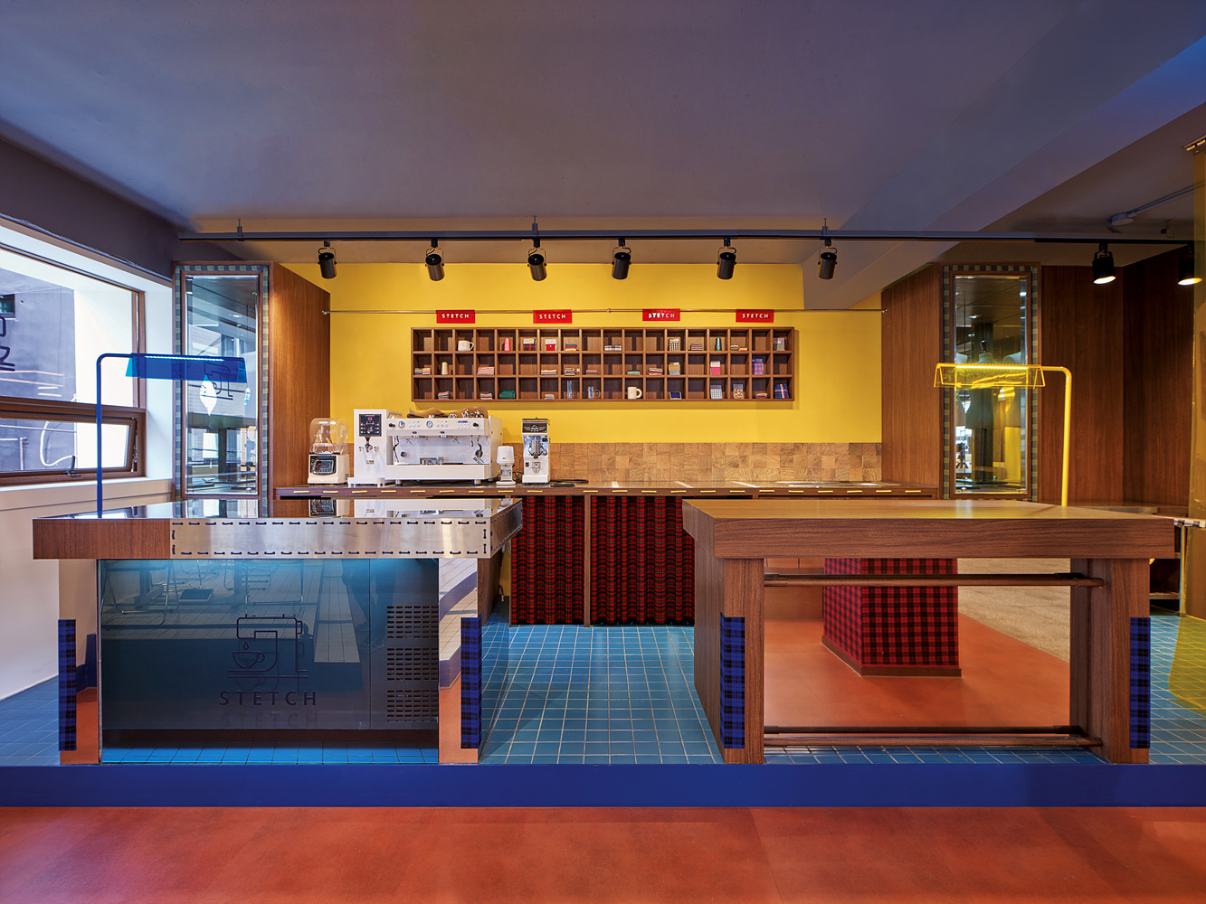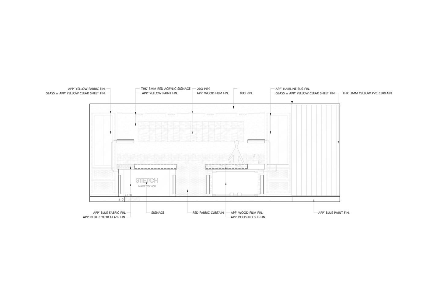 The most prominent finishing material is the primary colored, checkered fabric. As it is natural and familiar for people to wear clothes made of different fabrics, this finishing material was chosen with the intention of dressing the space with various checkered fabrics. Moreover, we wanted to express the feeling as if the space was formed by sewing one stitch at a time using various colored ropes both inside and outside, and the section where this stands out the most dramatically is the facade. The unity of applying the characteristic of ‘sewing’ to the entire space using colored ropes continues in the interior. Details using these ropes can be seen throughout the space, such as the barista workbench, the pillar face finishes, and the tailor zone window frames.