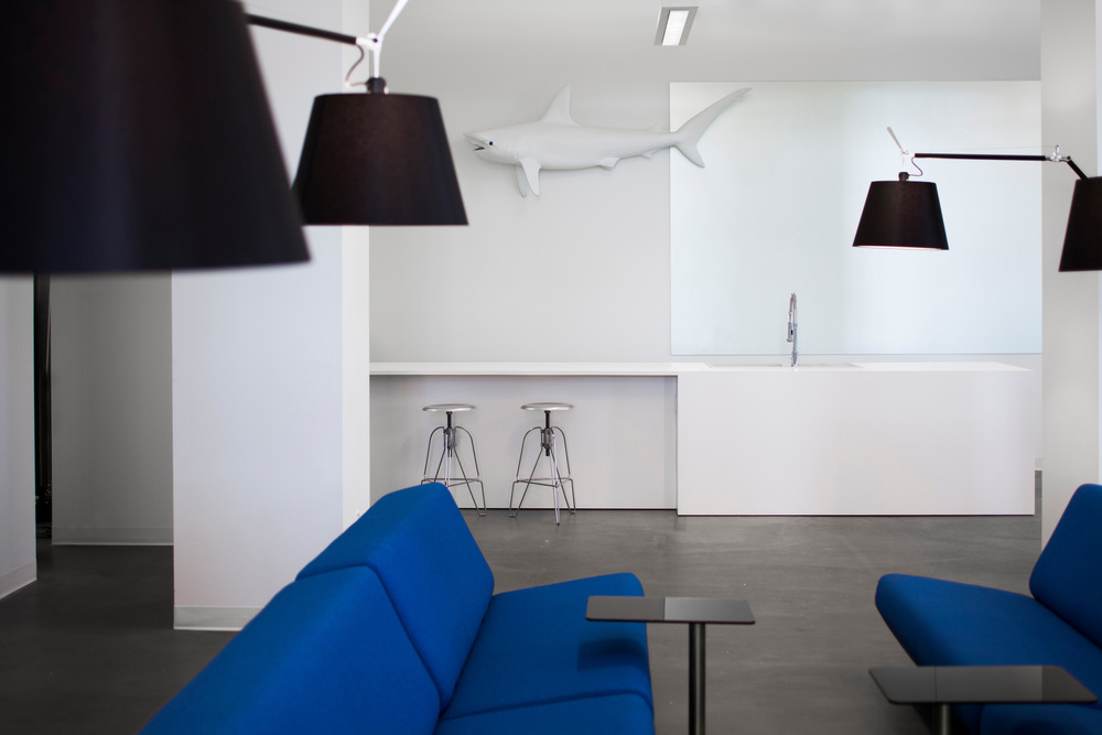 The brief was to section off different work zones to create a stimulating and creative environment, initiating interaction and communication between the respective users. The overall open concept permits all employees to enjoy the climate of each area, along with the generous natural light and panoramic views provided by the building’s tall fenestration. The user’s experience begins upon entry, where one is transitioned via a compressed space. There, the neon light from the agency’s logo leaves a virtual imprint of its identity: B L U E. On the wall, a shark mannequin gives one the impression of floating in a sea of creativity and imagination.